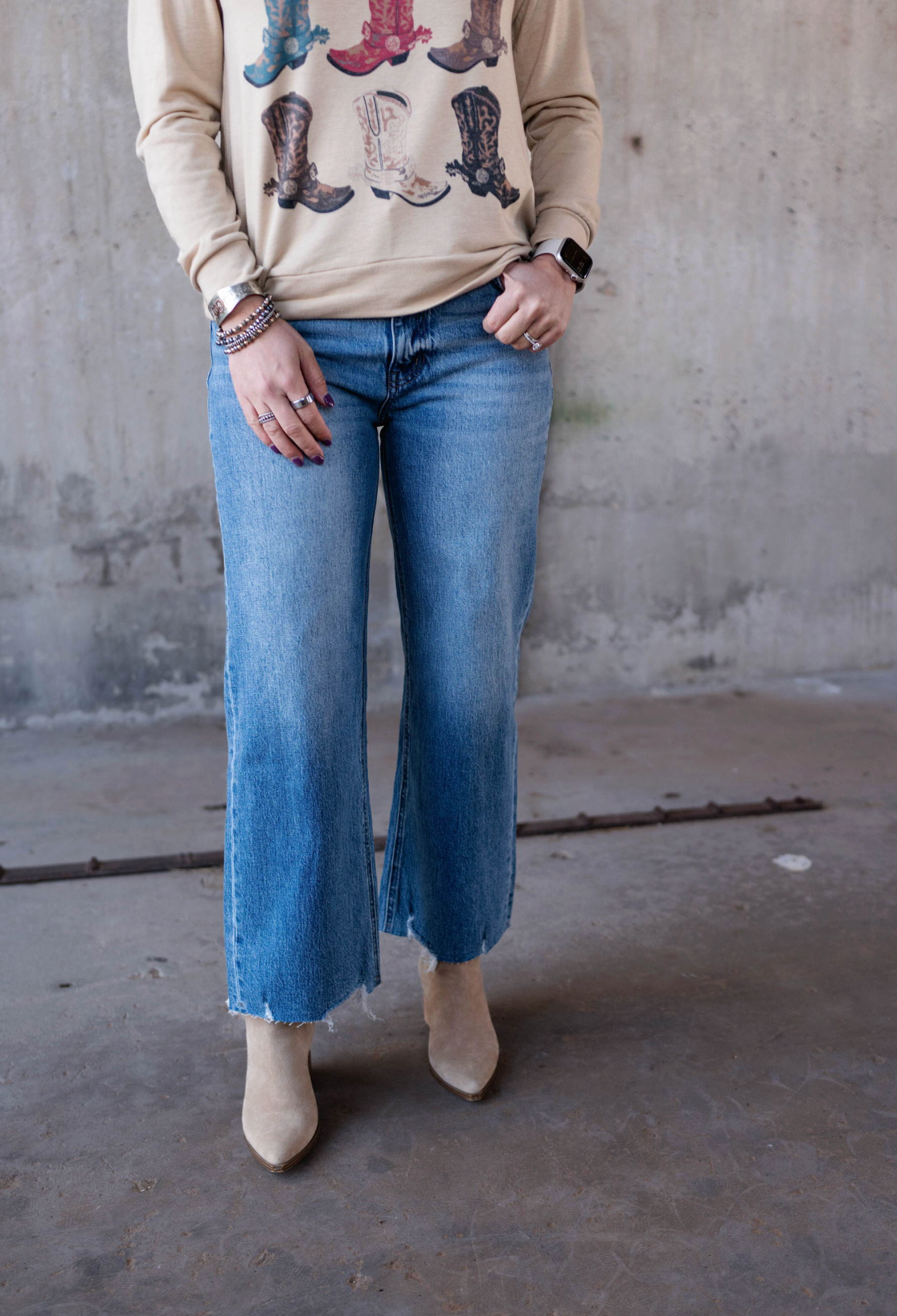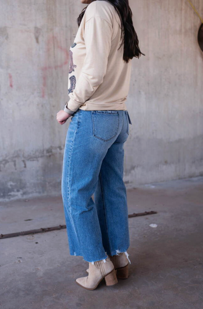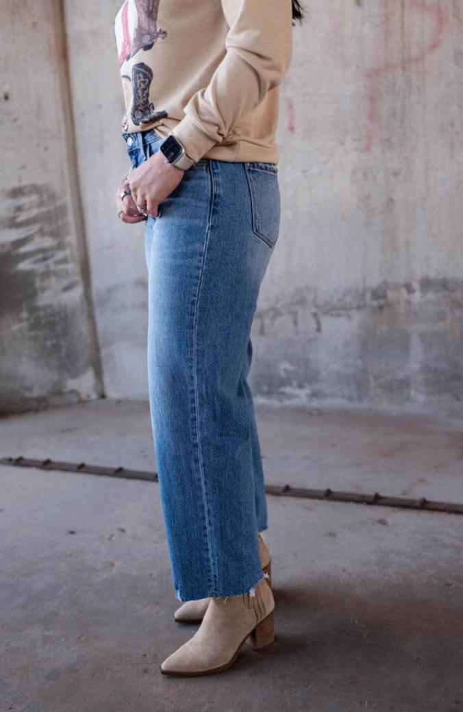 High-rise silhouette meets modern edge with these wide-leg crop jeans. The clean-cut raw hem adds an intentional, undone finish that works with everything from sneakers to heels. Medium wash denim keeps things versatile—dress them up or down. A timeless pair of denim that feels effortlessly cool.