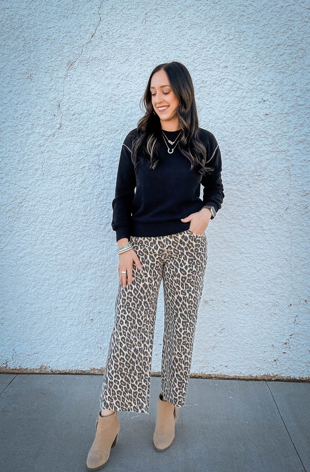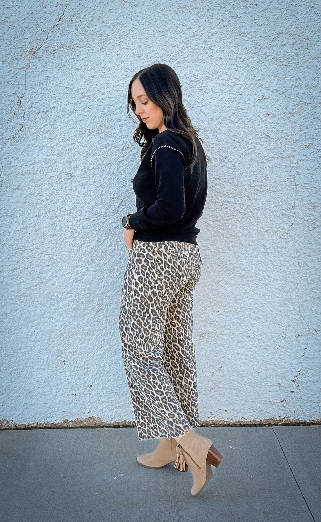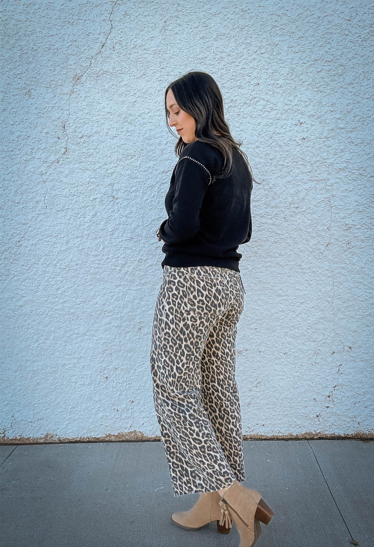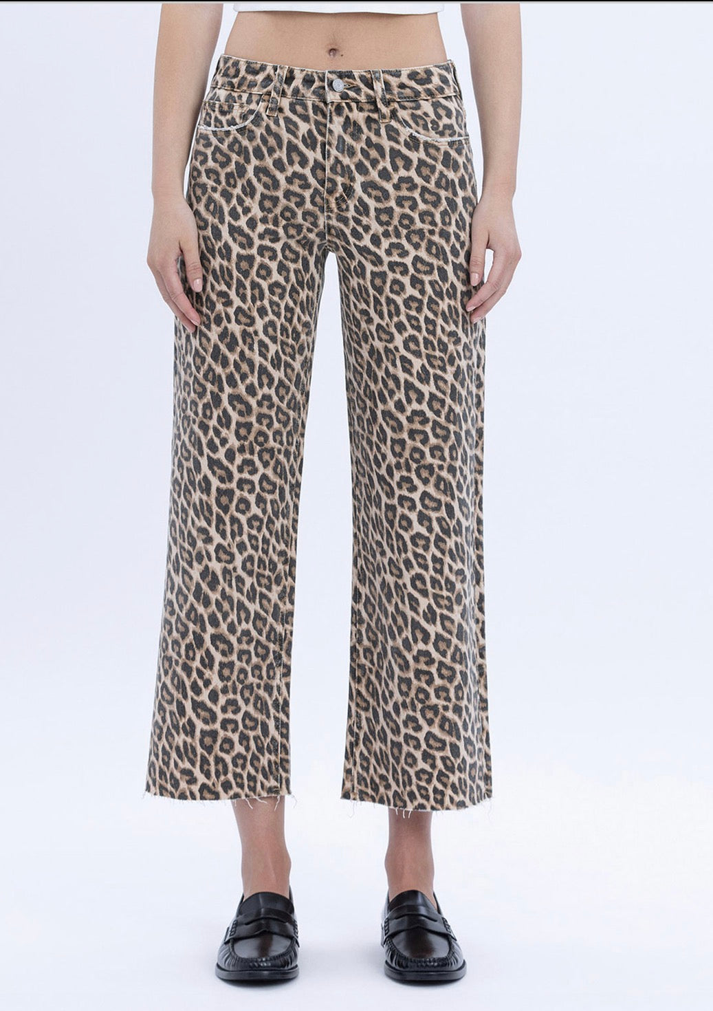These leopard print crop jeans are your ticket to turning everyday looks into fashion moments. The high-rise fit flatters while the wide legs give you room to move and groove. Bold spots, zero apologies—style them however you want and own it.