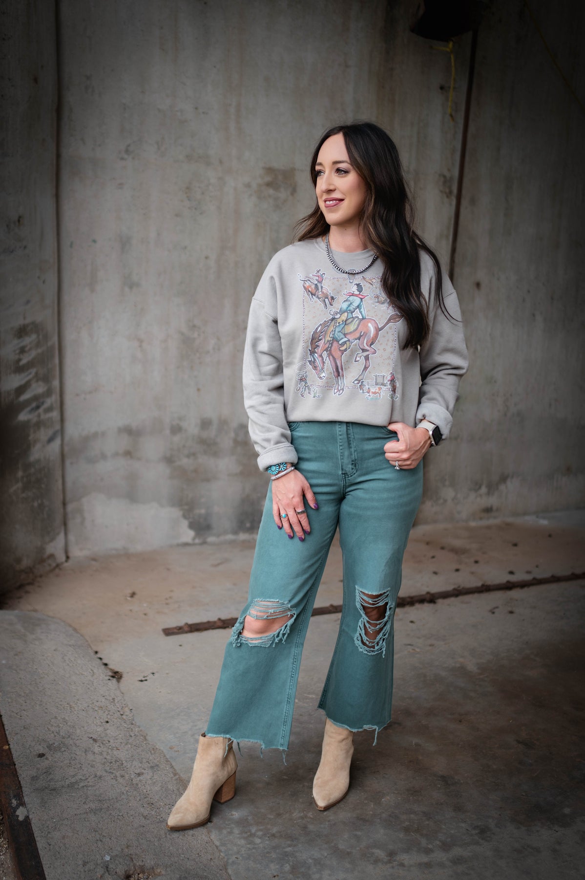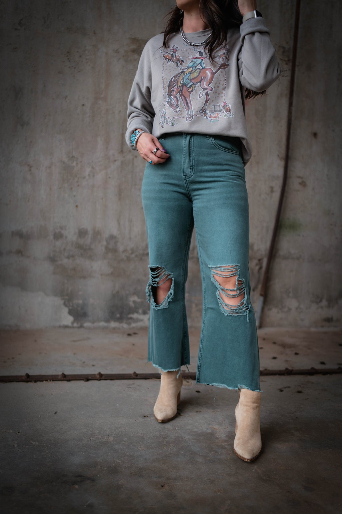 The Pine Ridge Jean delivers edge with a sea green wash that stands out from the crowd. Heavily distressed with dramatic knee cutouts and a raw, unfinished hem, these jeans make a bold statement. Perfect for anyone ready to embrace an intentionally worn-in aesthetic that feels effortlessly cool.
