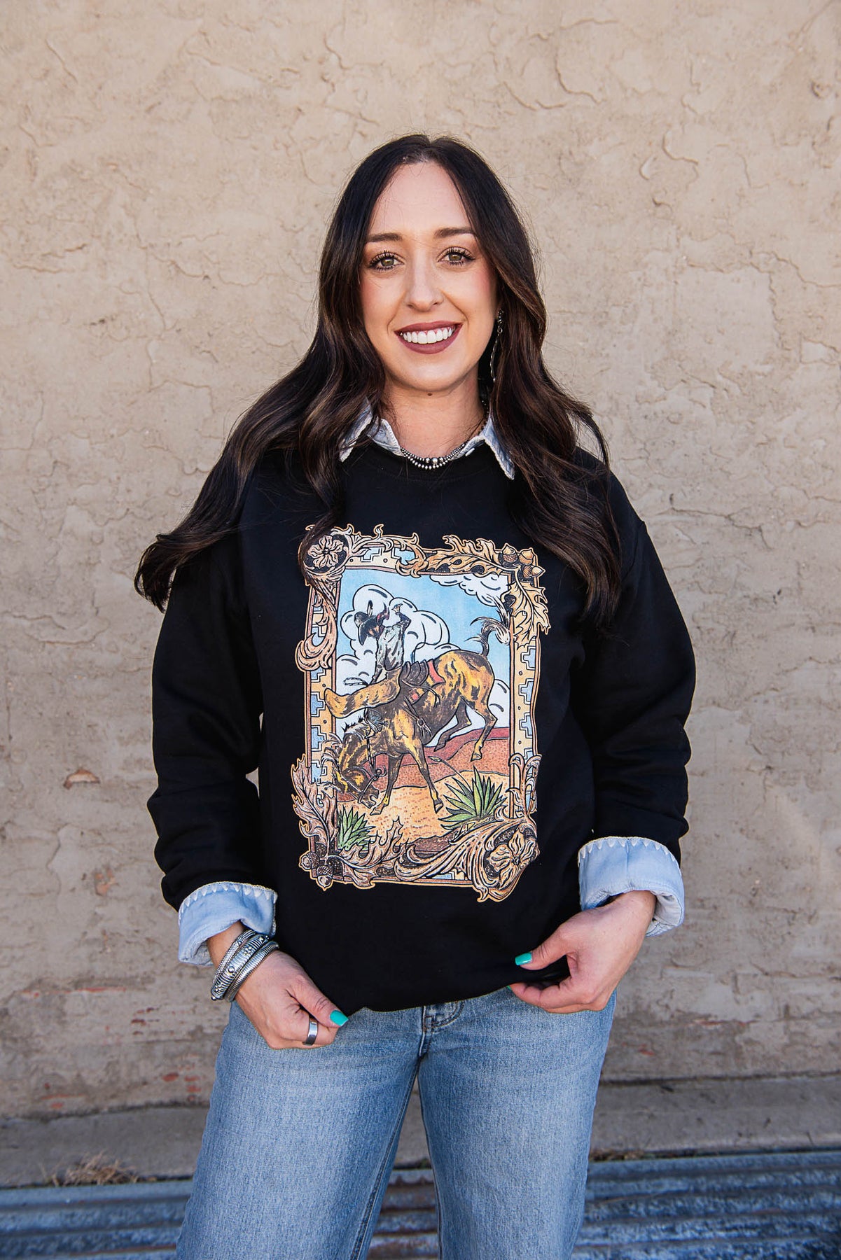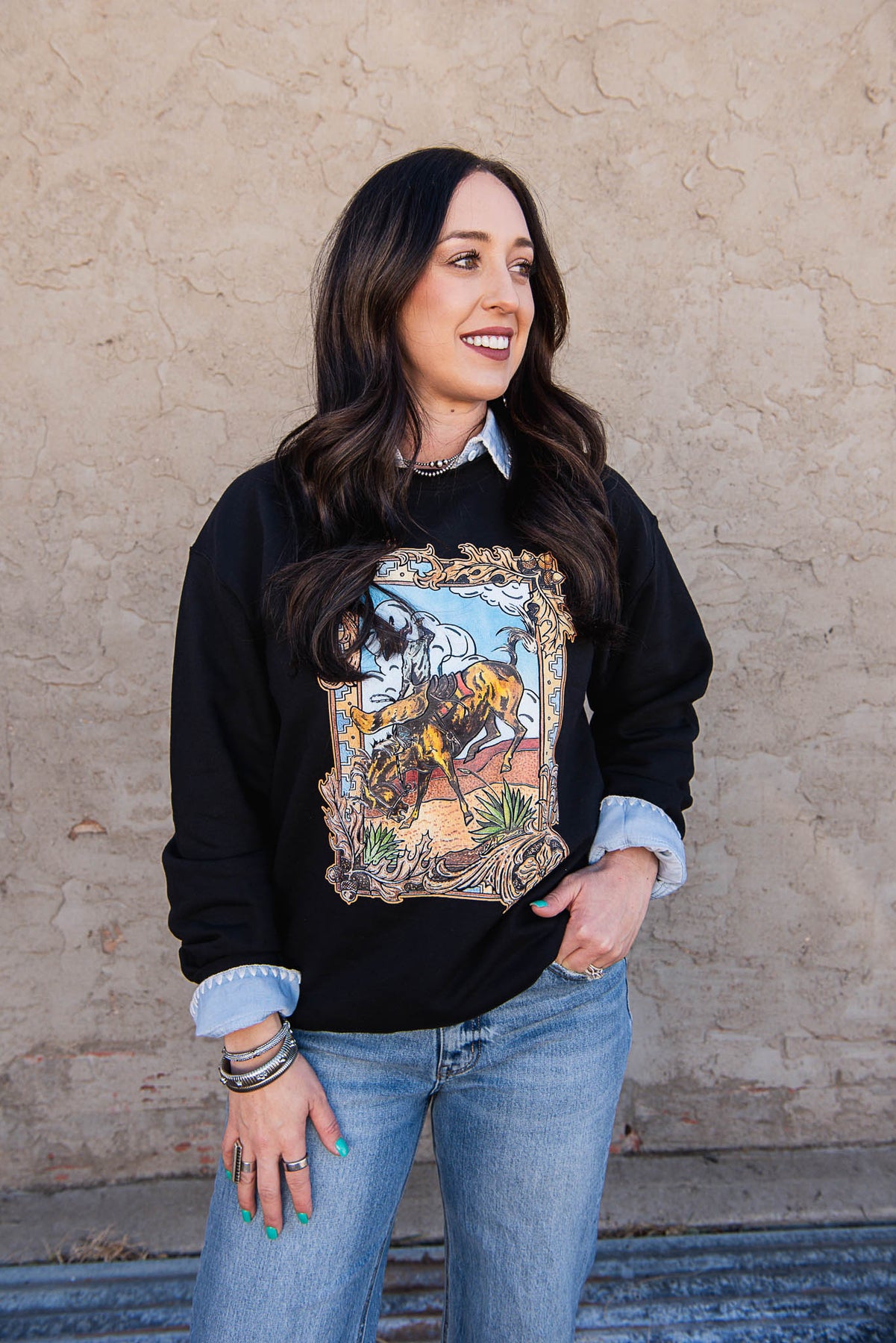 Stand out with undeniable western style in a black sweatshirt that showcases a vintage bucking horse graphic. It's the perfect way to signal your connection to cowboy culture while looking effortlessly confident.