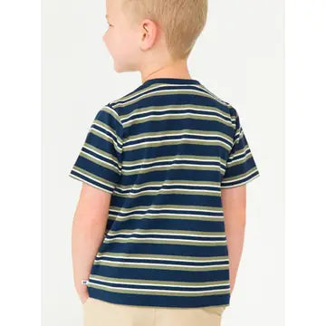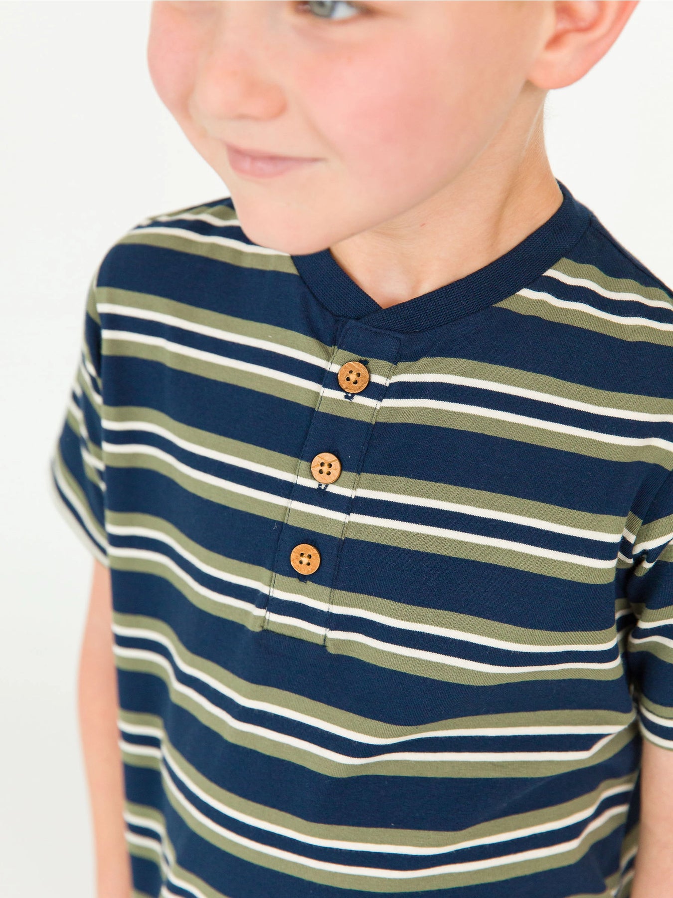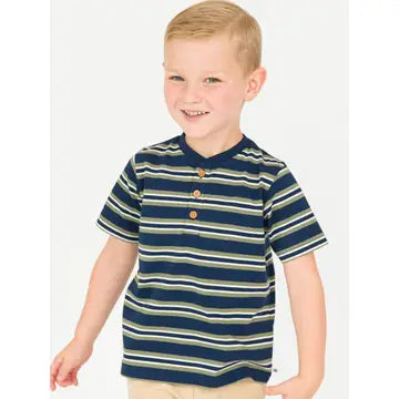 Grab this short sleeve henley for your little guy to be not only fresh dressed, but comfy. The classic stripe is a bestseller for a reason - easy to coordinate and always adorable. Pairs well with Dusty Olive, Dark Navy, White. Fabric Content: 95% Cotton, 5% Spandex Machine Wash ColdTumble Dry Low