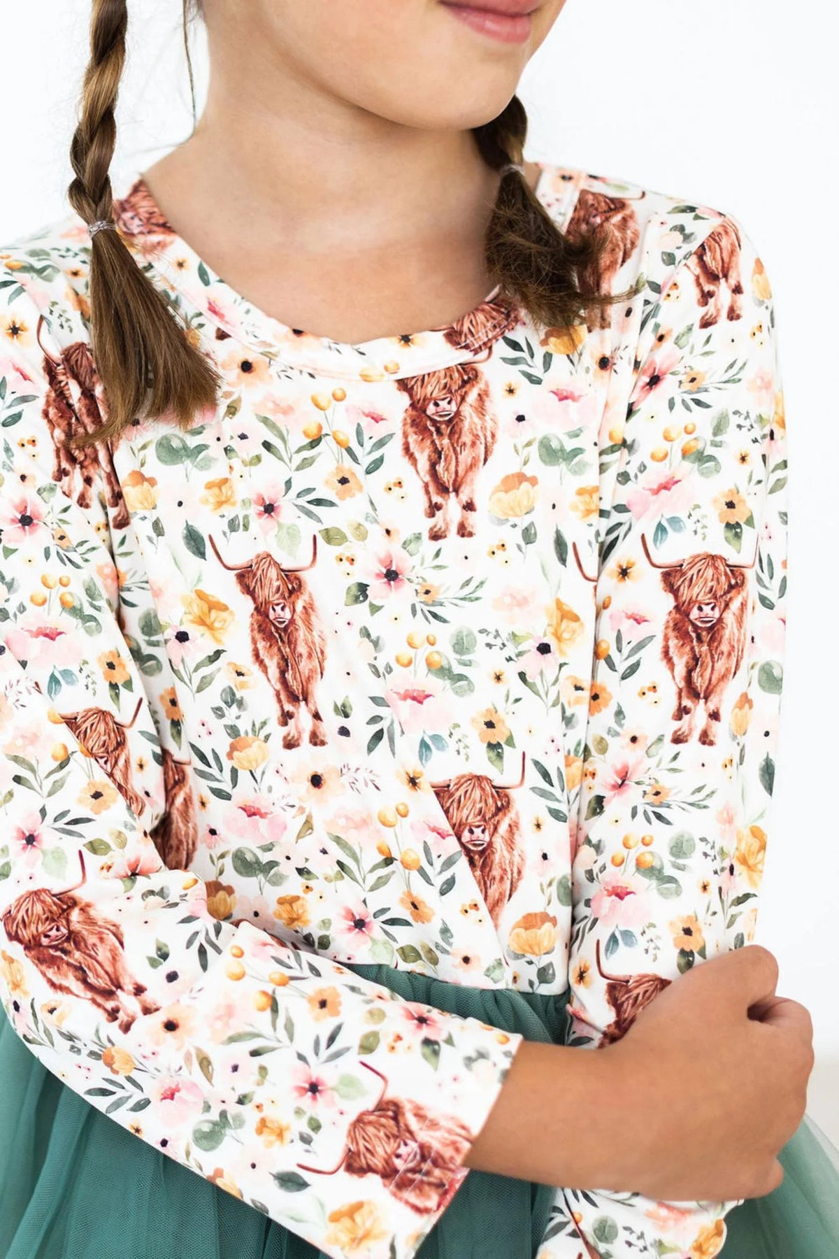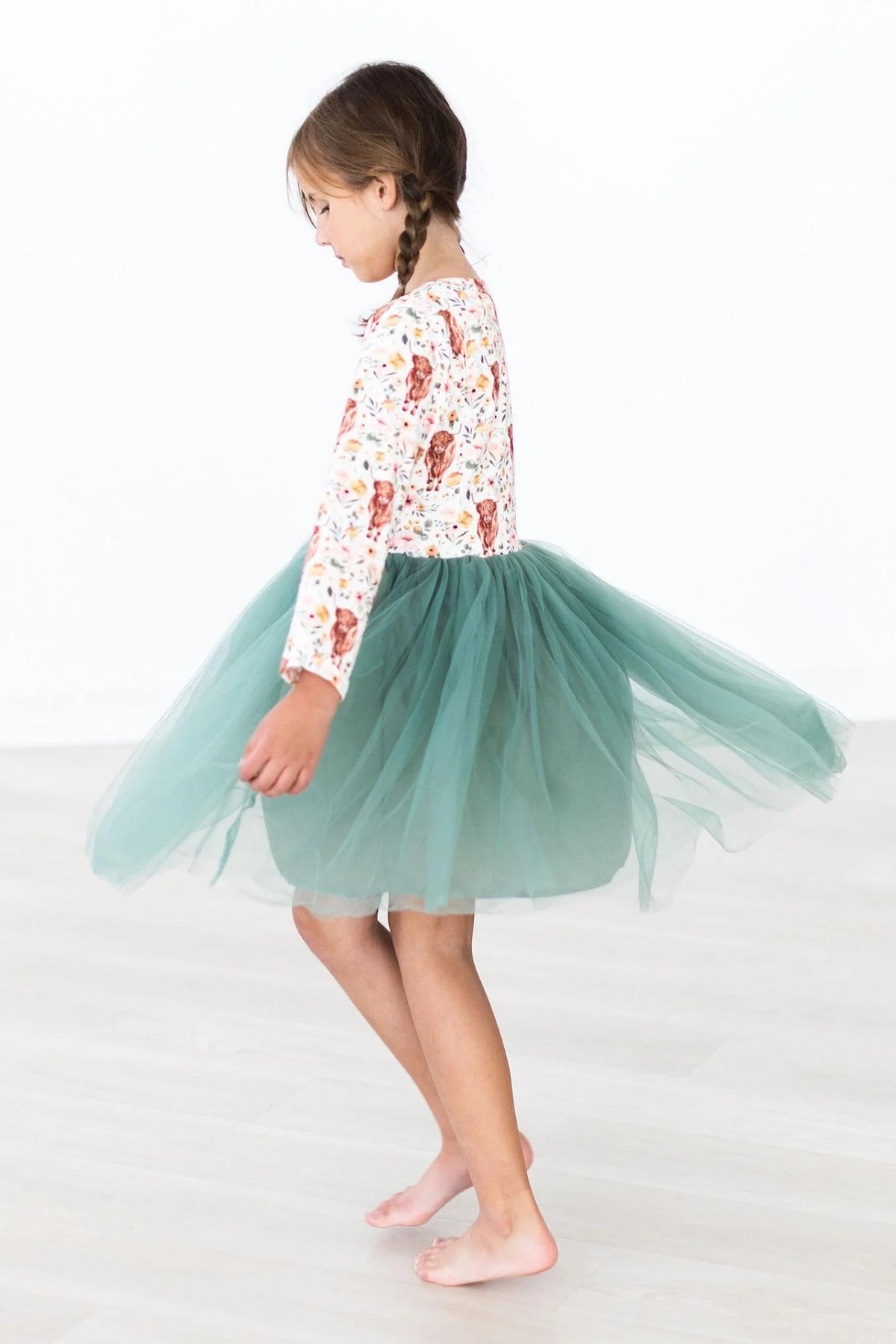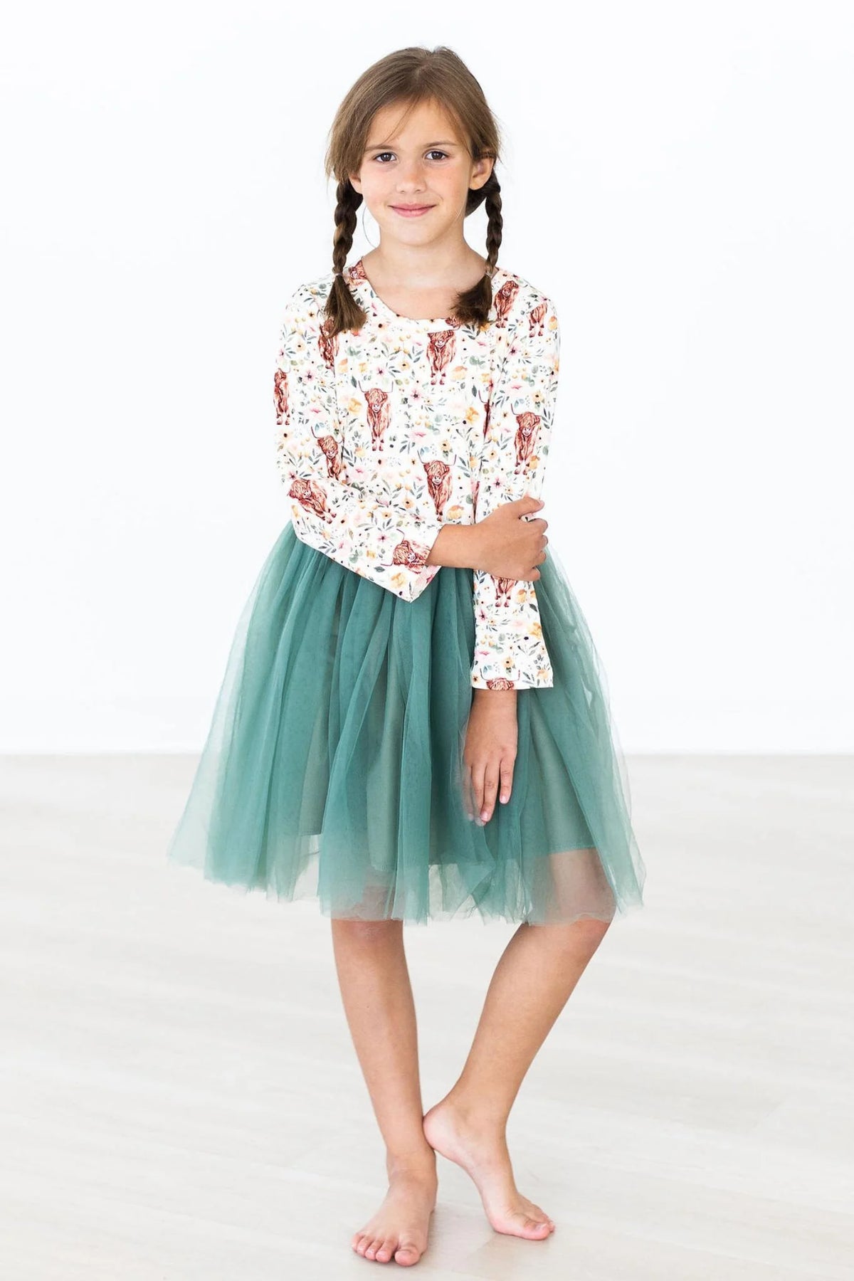 This playful kids’ dress features a soft green tutu skirt paired with a cozy highland cow top. Designed with a comfortable scoop neck and long sleeves, it’s perfect for twirling and everyday adventures. The whimsical combination makes dressing fun while keeping little ones comfy all day long.