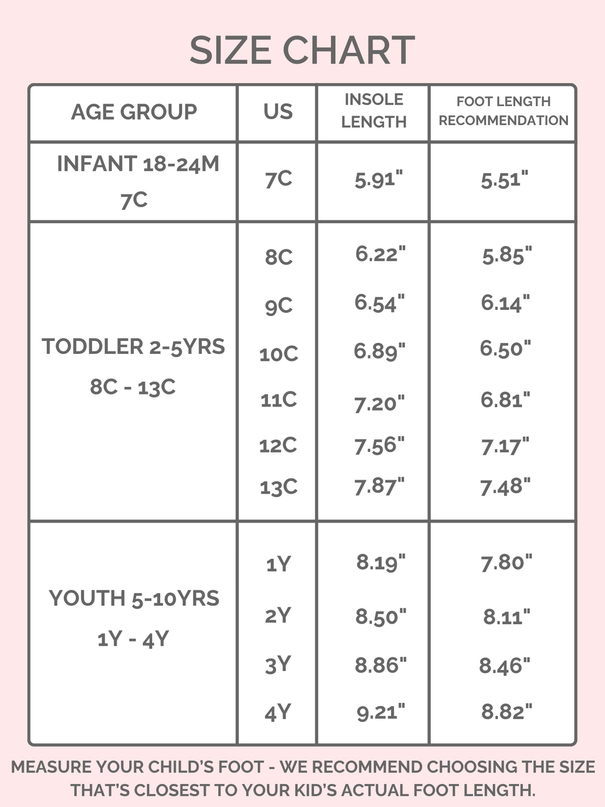 * Fit: For best fit, measure your child's foot from heel to length of the longest toe.