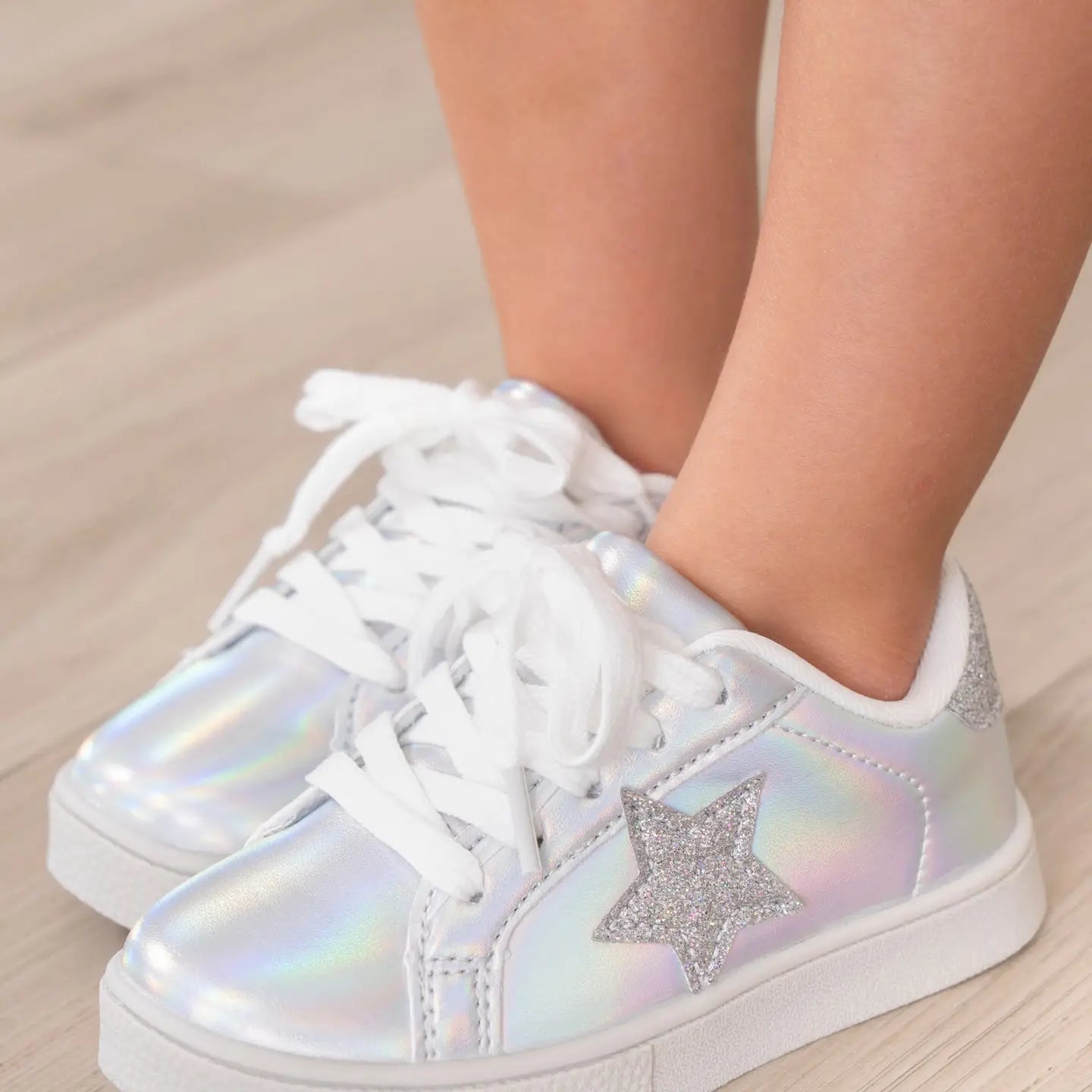 Be a super star and sparkle wherever you go with these glittery, glam sneakers! The comfortable fit means you can dress them down or dress them up with one of our sparkly tutu dresses. Your little will be the star of the show every time every time you slip these sneakers on.
