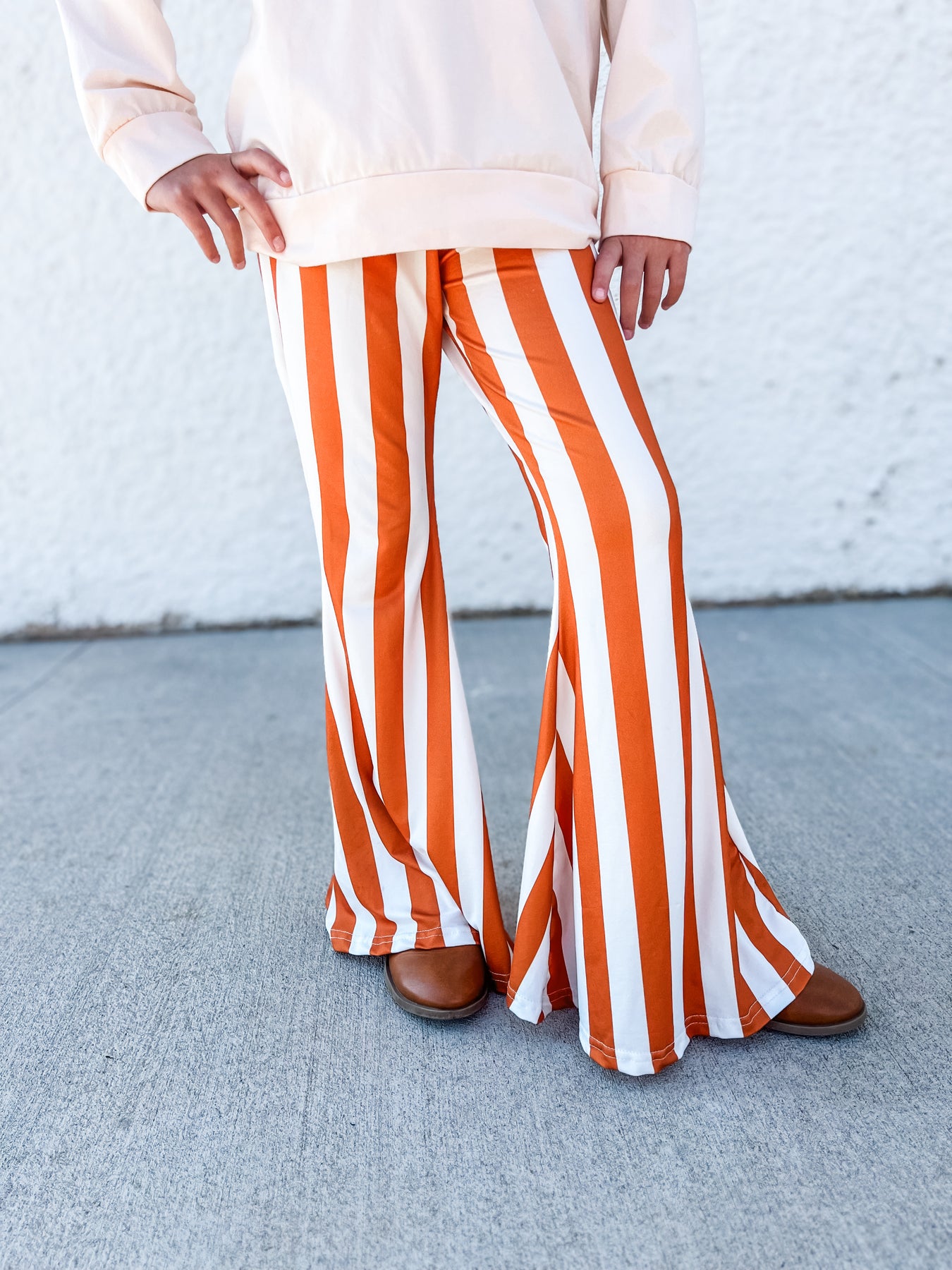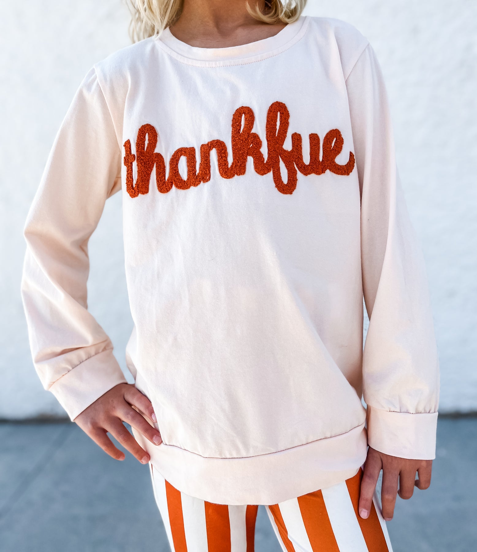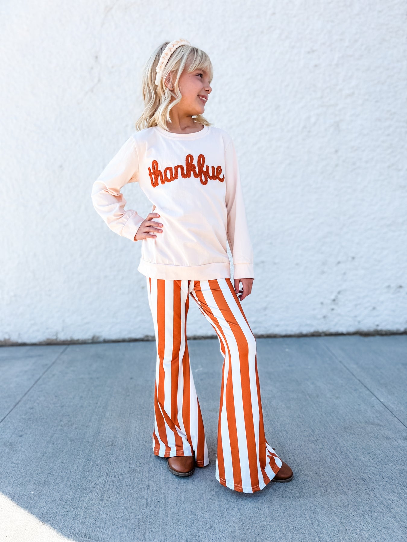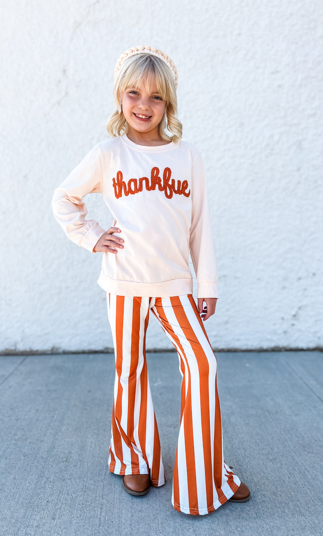 Your little one will love this adorable two-piece set! Pair the ultra-soft orange and white striped bell bottoms with the cream sweatshirt featuring a sweet "Thankful" applique. Buttery-soft fabric keeps her comfy all day long while spreading good vibes.