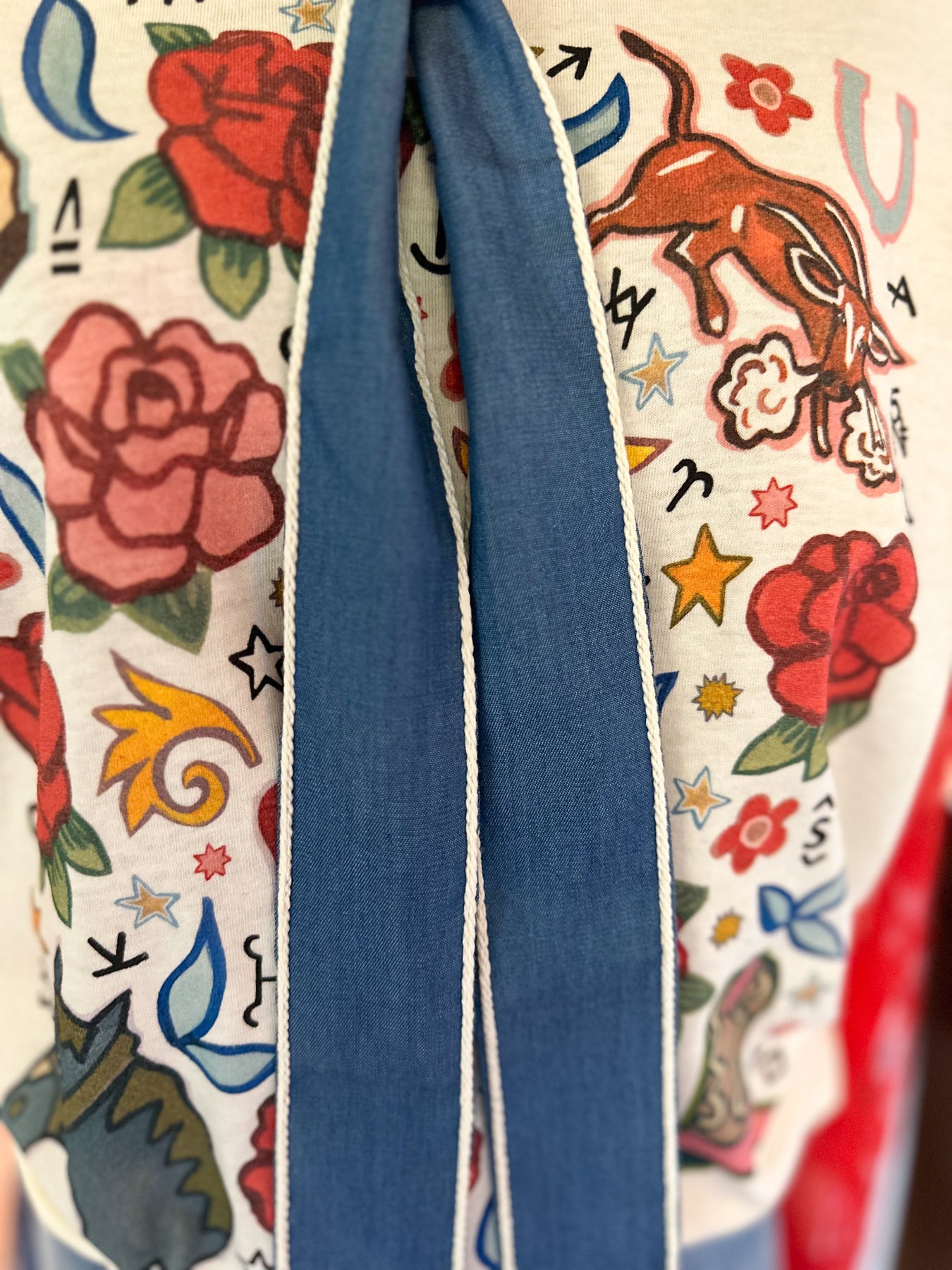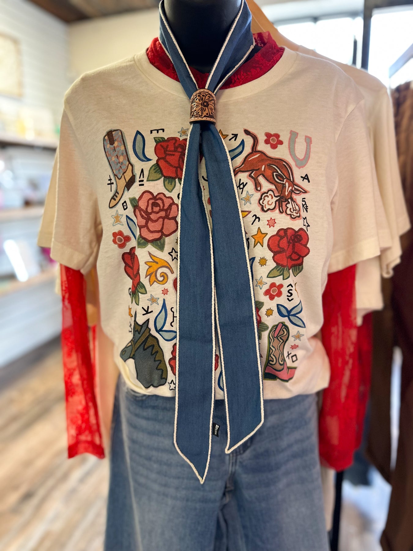 Add instant polish to any look with this denim twilly, featuring a striking white rope like border. Whether styled in your hair, around your neck, or tied to your bag, this versatile accessory brings effortless sophistication to your everyday ensemble. The perfect blend of casual charm and refined detail.