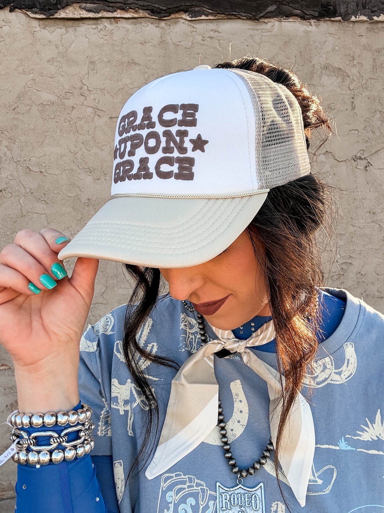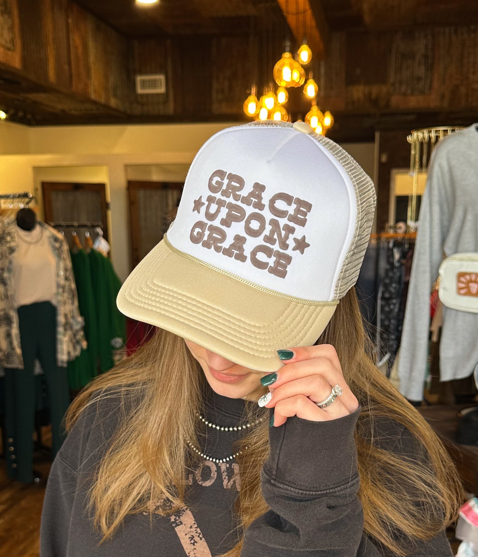 Stay blessed and comfy in our Grace Upon Grace trucker hat. Premium foam fabric keeps things light and airy, while breathable mesh backing lets your head breathe all day long. Adjustable snap back fits just right, no matter your vibe. Perfect for those moments when you need a little grace—and a whole lot of comfort.