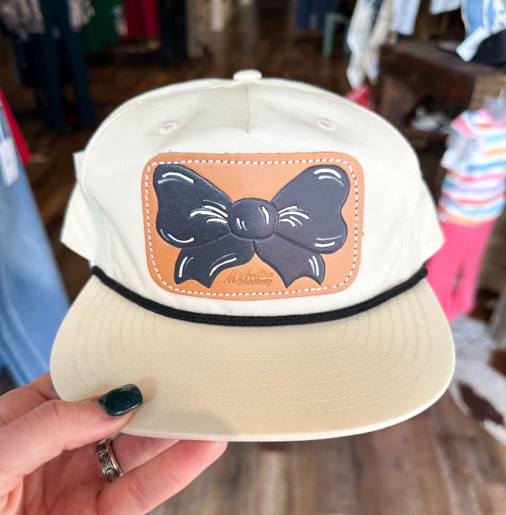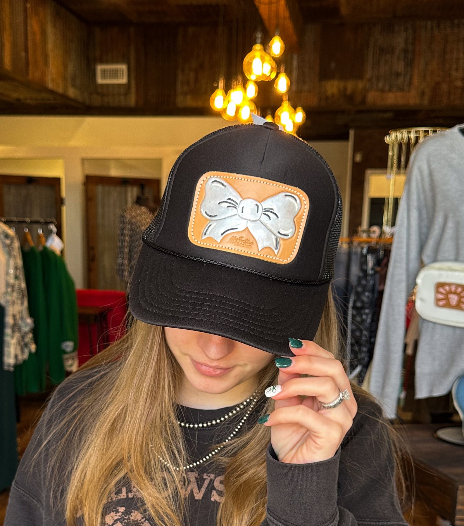 The black bow trucker hat is a light breathable material all the way around with a snap back.