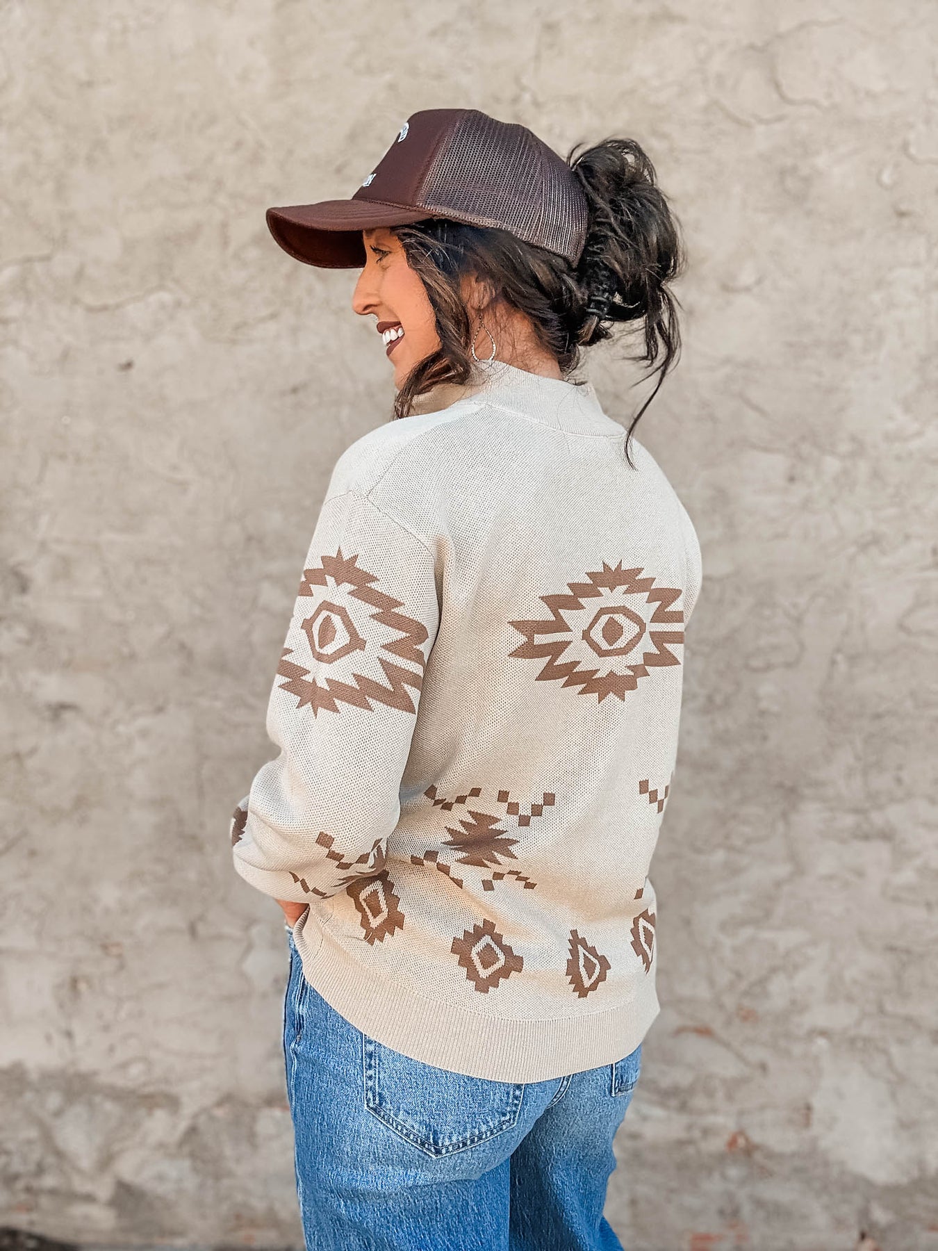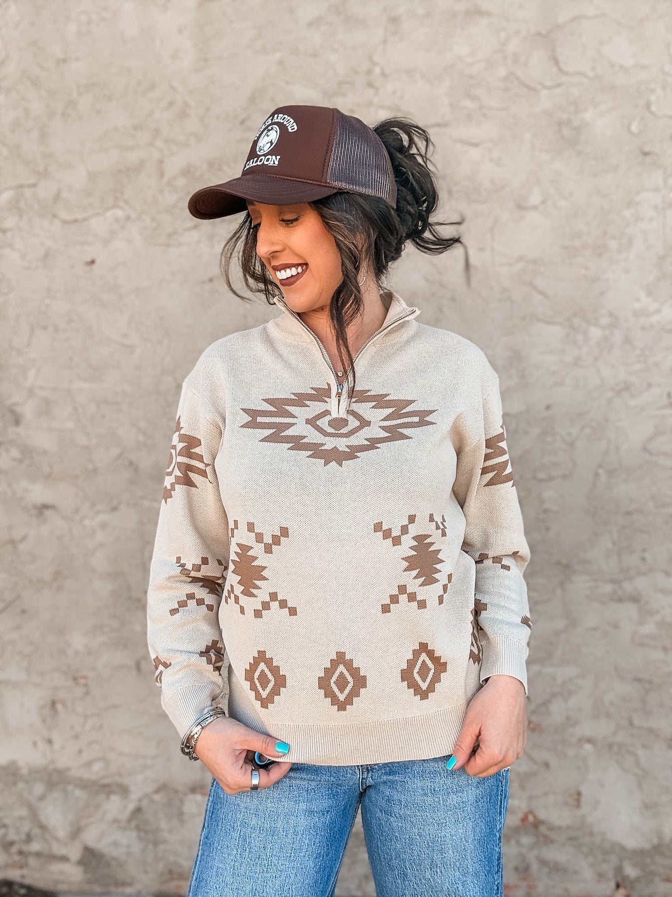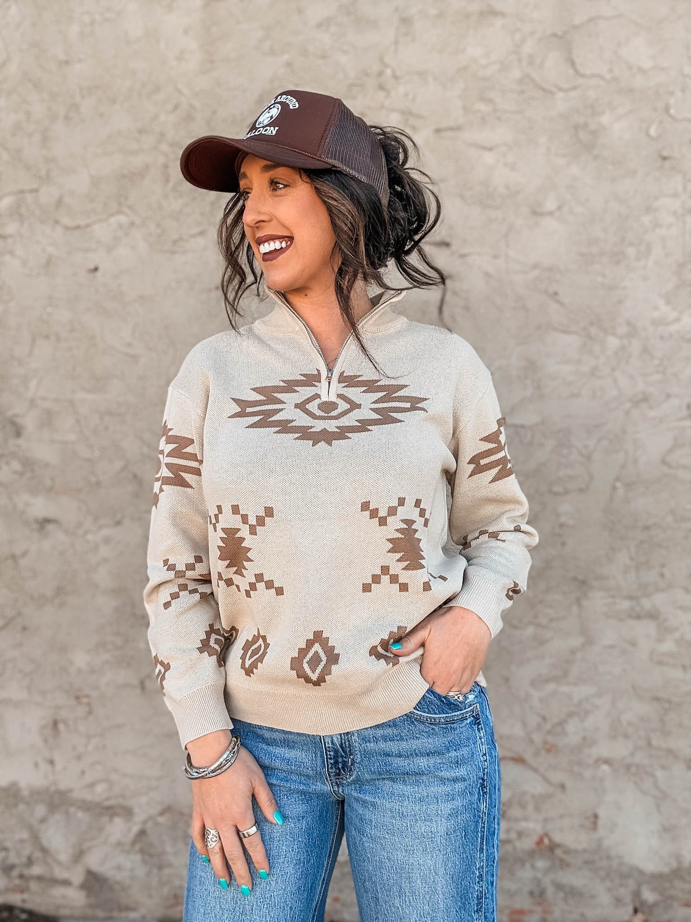 Stay cozy and stylish with the Calhoun Pullover! Featuring a playful Aztec design and a comfy 1/4 zip, this medium-weight pullover in tan and rust brown is perfect for layering. Ribbed cuffs and waistband keep the chill out, making it your go-to for relaxed days. Lightweight, comfy material.