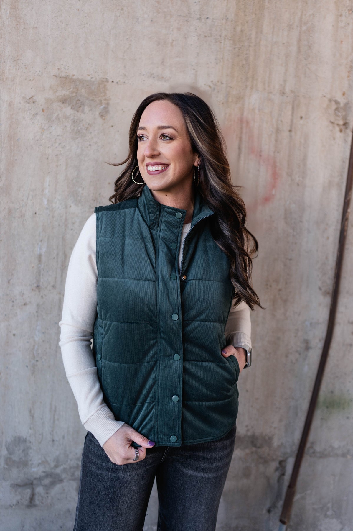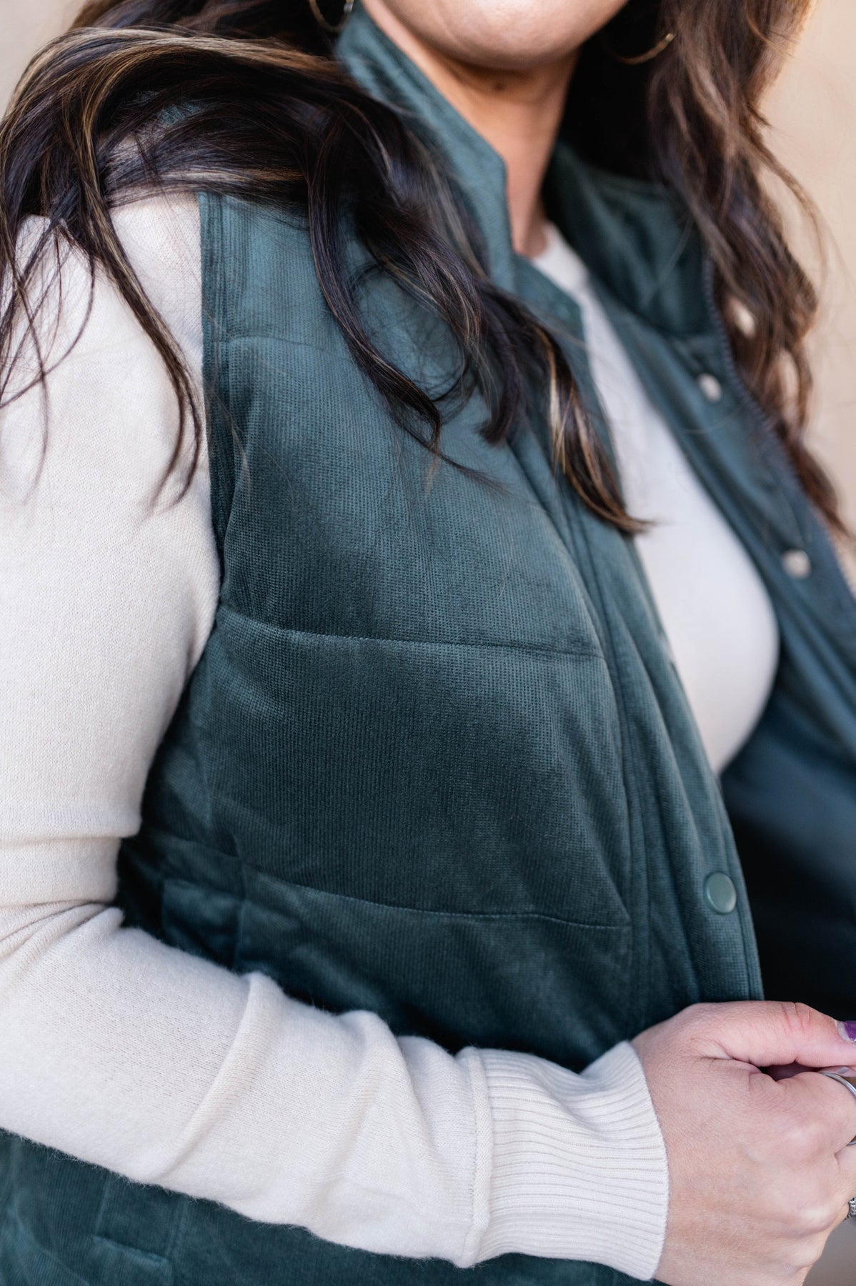 Meet your new favorite layering piece. This Deep Forest Vest rocks a cozy polar neck, functional pockets, and clever hidden zip with snap button closure for easy on-and-off. The corduroy ribbed texture brings vintage cool to any outfit. Dress it up or down—it's the vest that does it all.