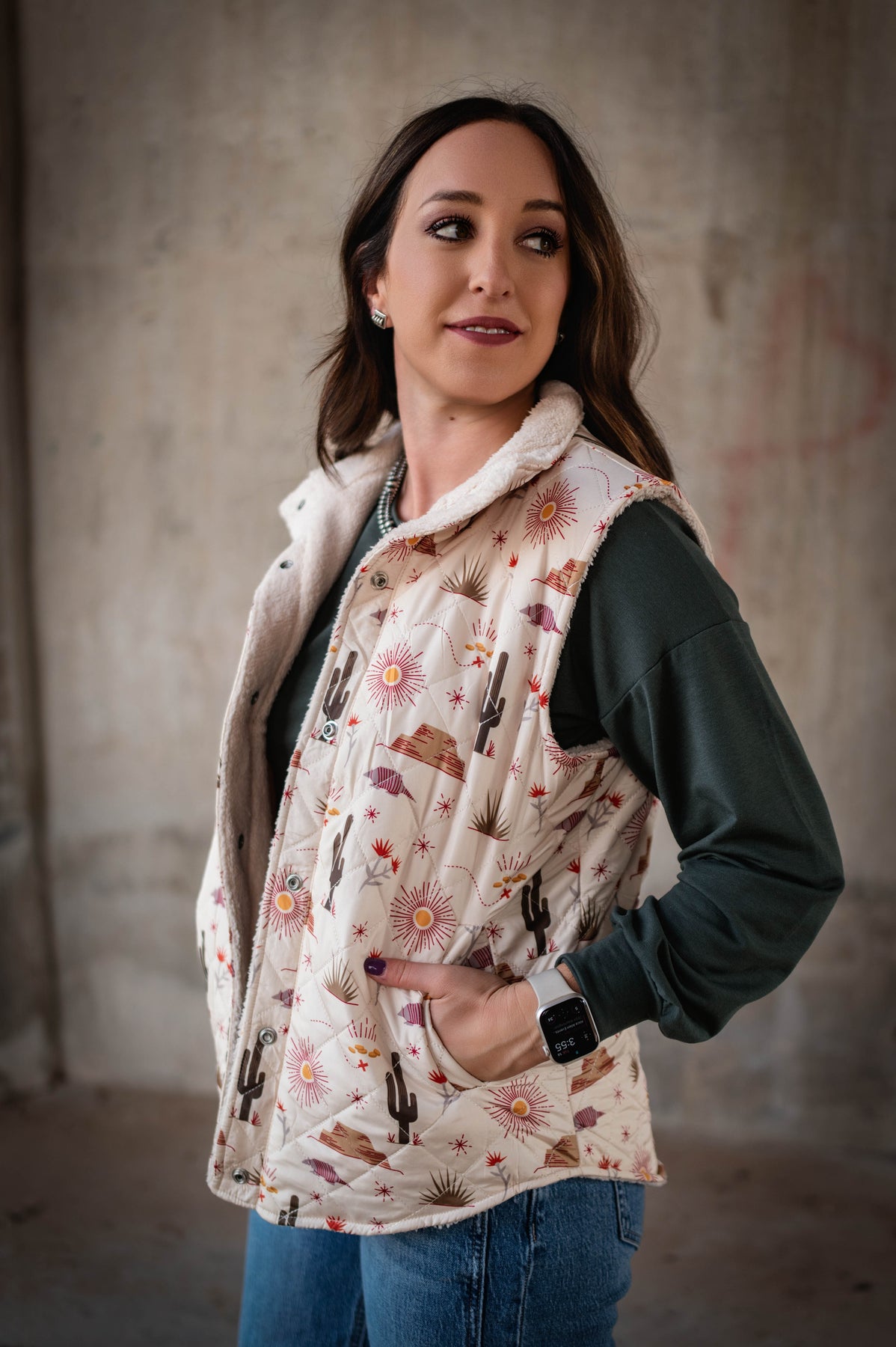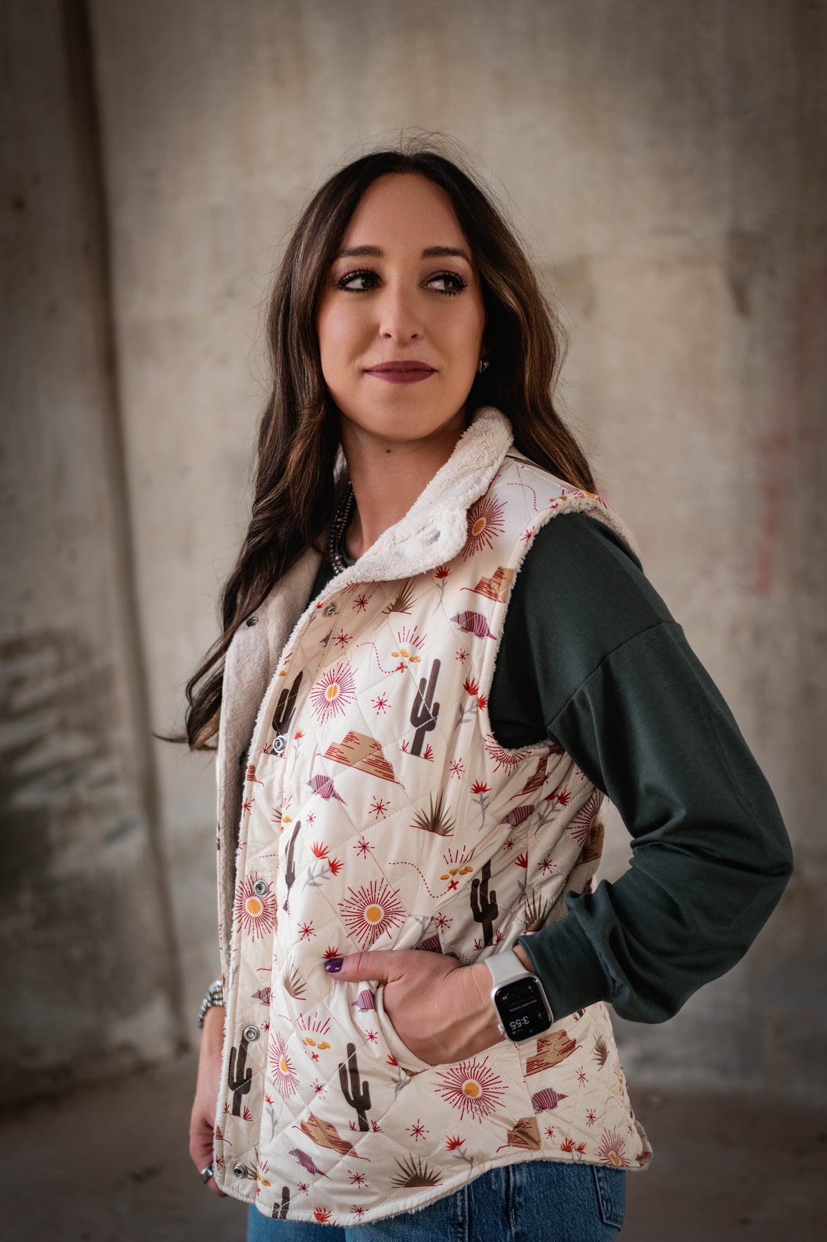 Embrace the spirit of the West with the Desert Dreaming Vest. Featuring quilted polyester adorned with desert-inspired icons like cactus, sunrise, armadillo, and mesa, this vest blends style and storytelling. The cozy fleece lining keeps you warm, while functional buttons offer easy layering and a polished finish. Perfect for adventures or everyday wear, it captures rugged charm without compromising comfort.