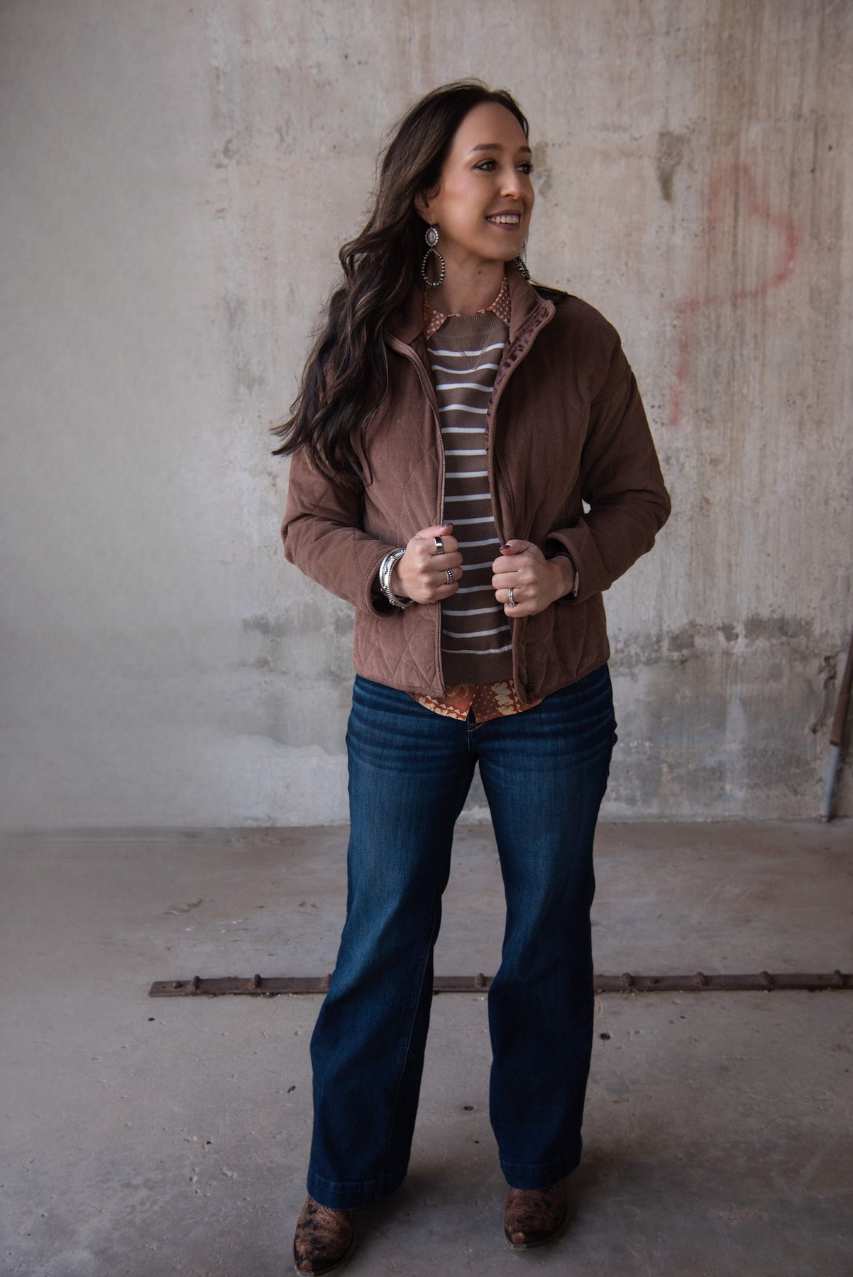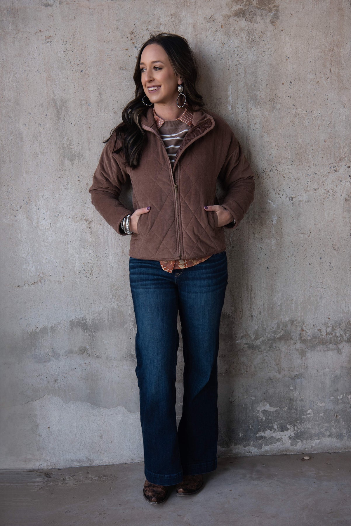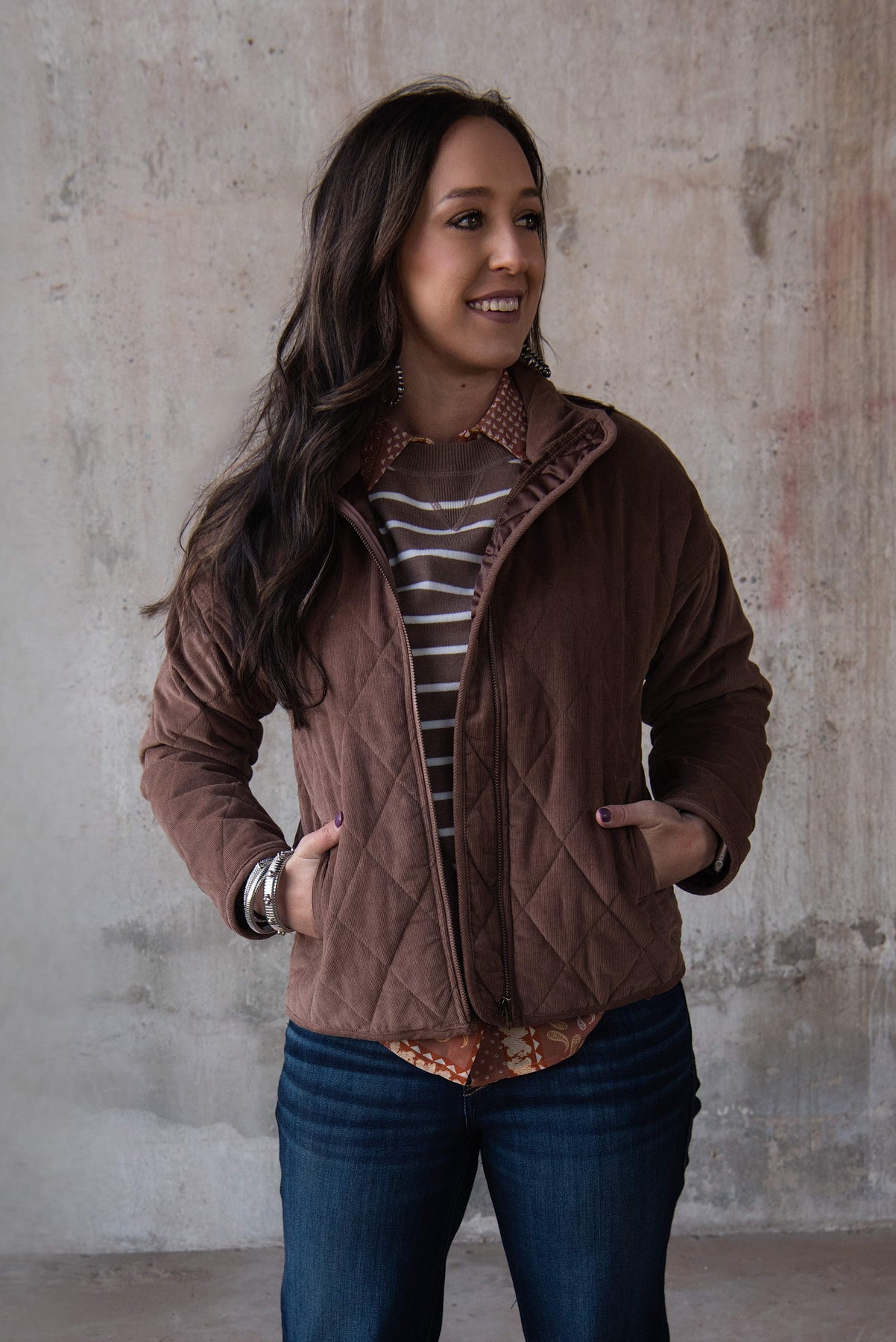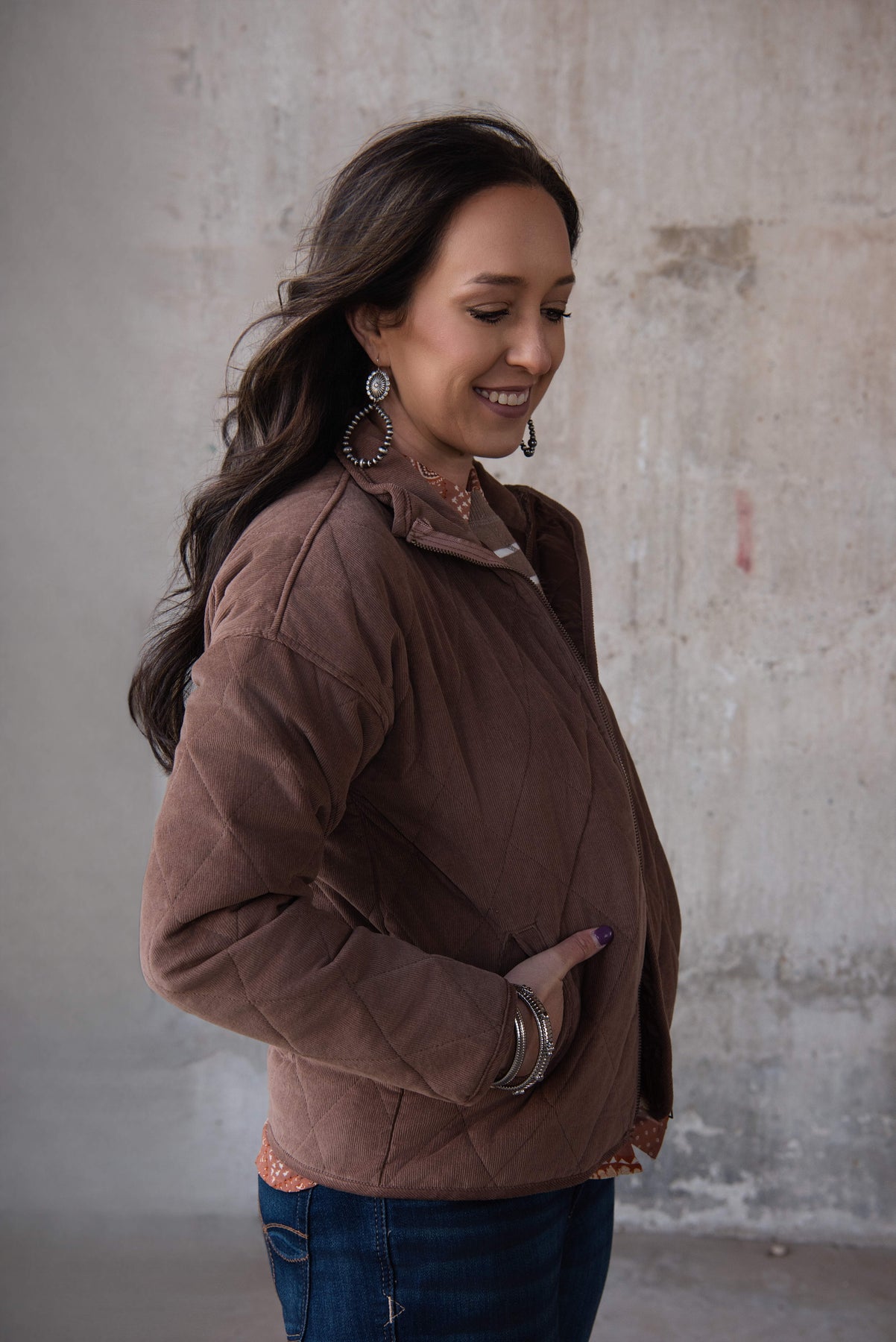 Cozy up in this espresso-hued corduroy jacket that's equal parts comfort and cool. The diamond quilting adds texture and warmth, while two front pockets keep your essentials close. Zip up and you're ready for anything—from casual coffee runs to weekend adventures.