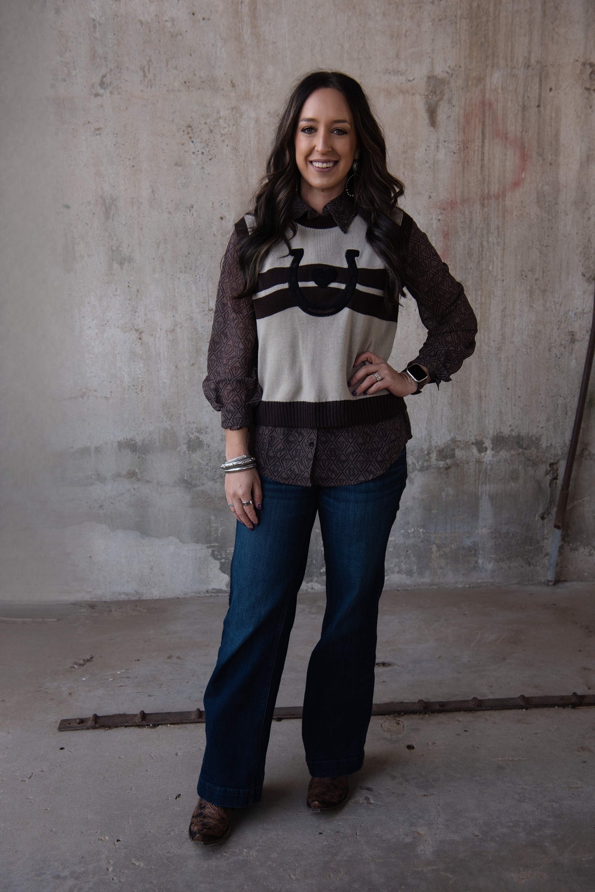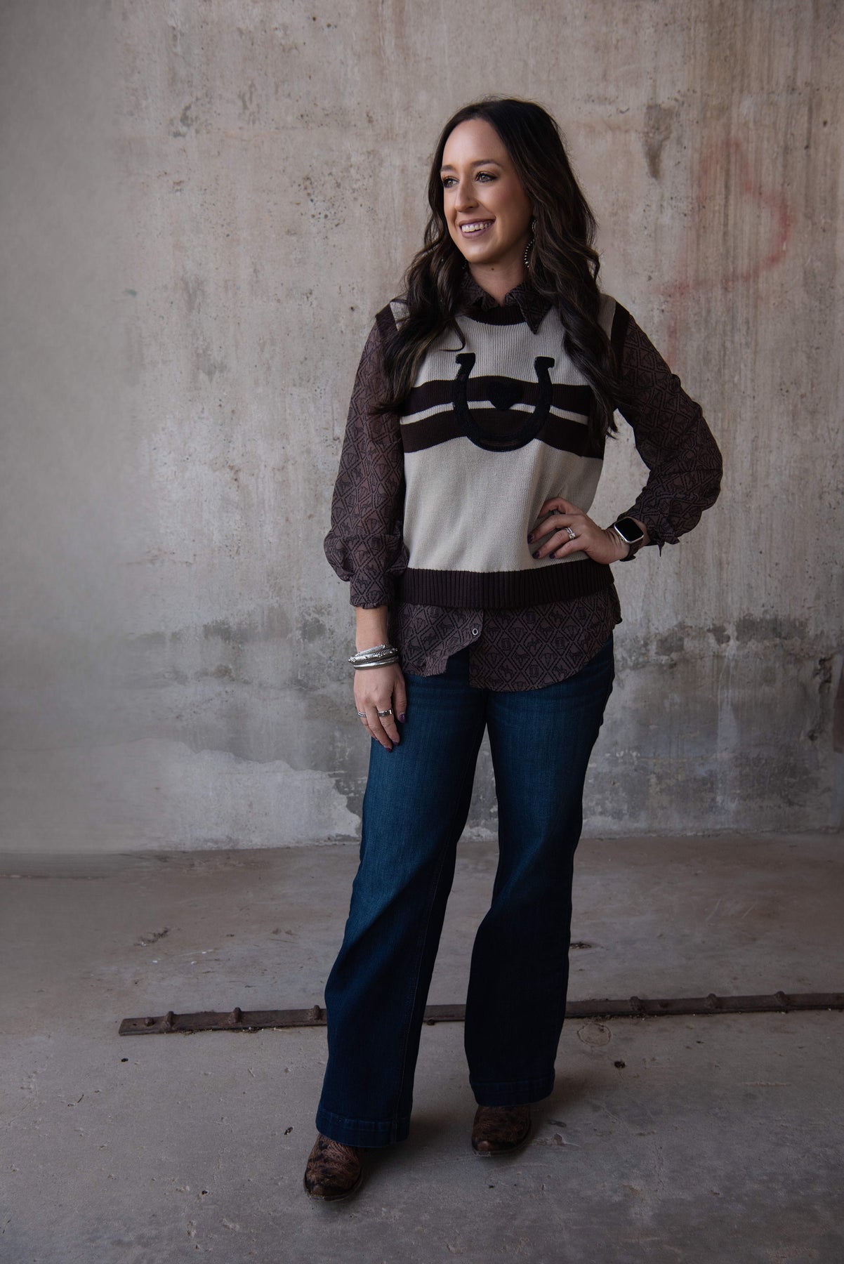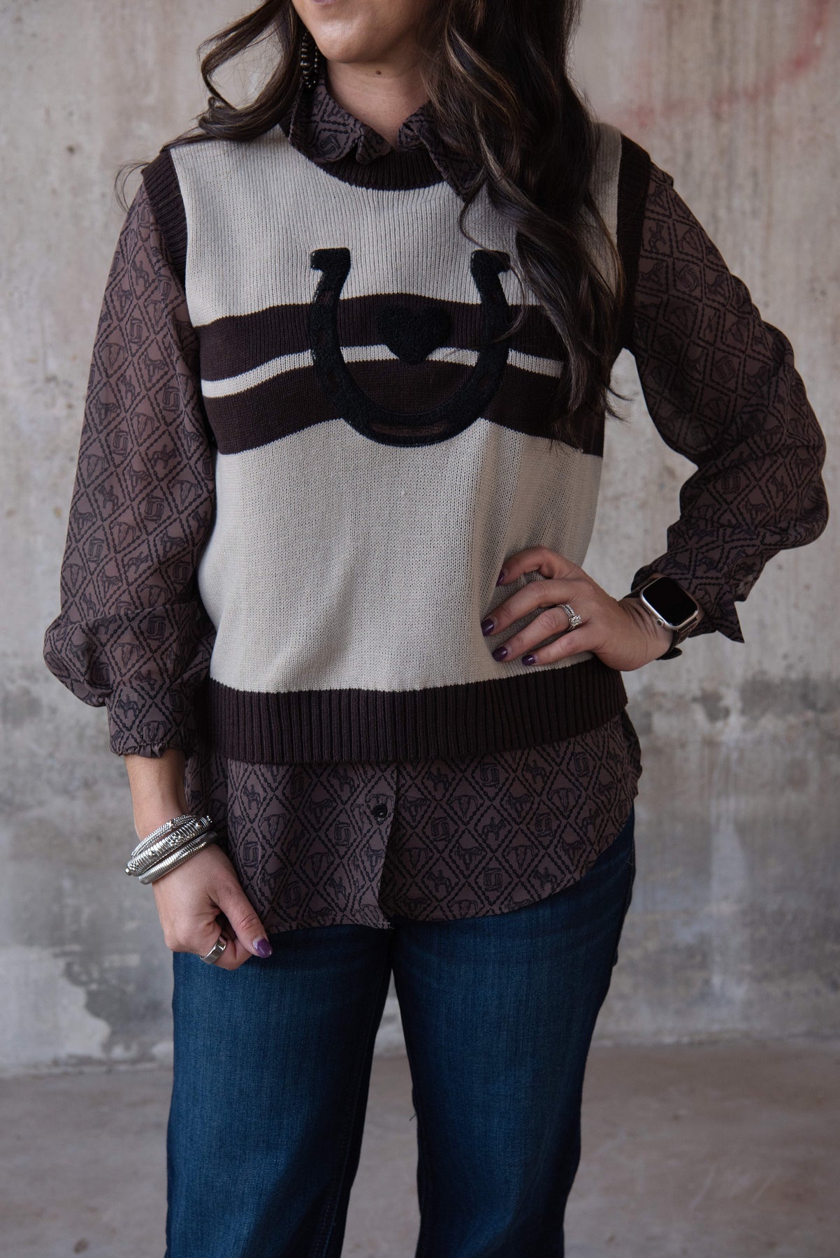 A little Western, a little preppy — and a whole lot of cute. This knit vest has that “effortlessly put together” vibe we all love. The neutral cream-and-chocolate combo goes with everything, and the fuzzy horseshoe + heart detail adds just the right amount of charm.