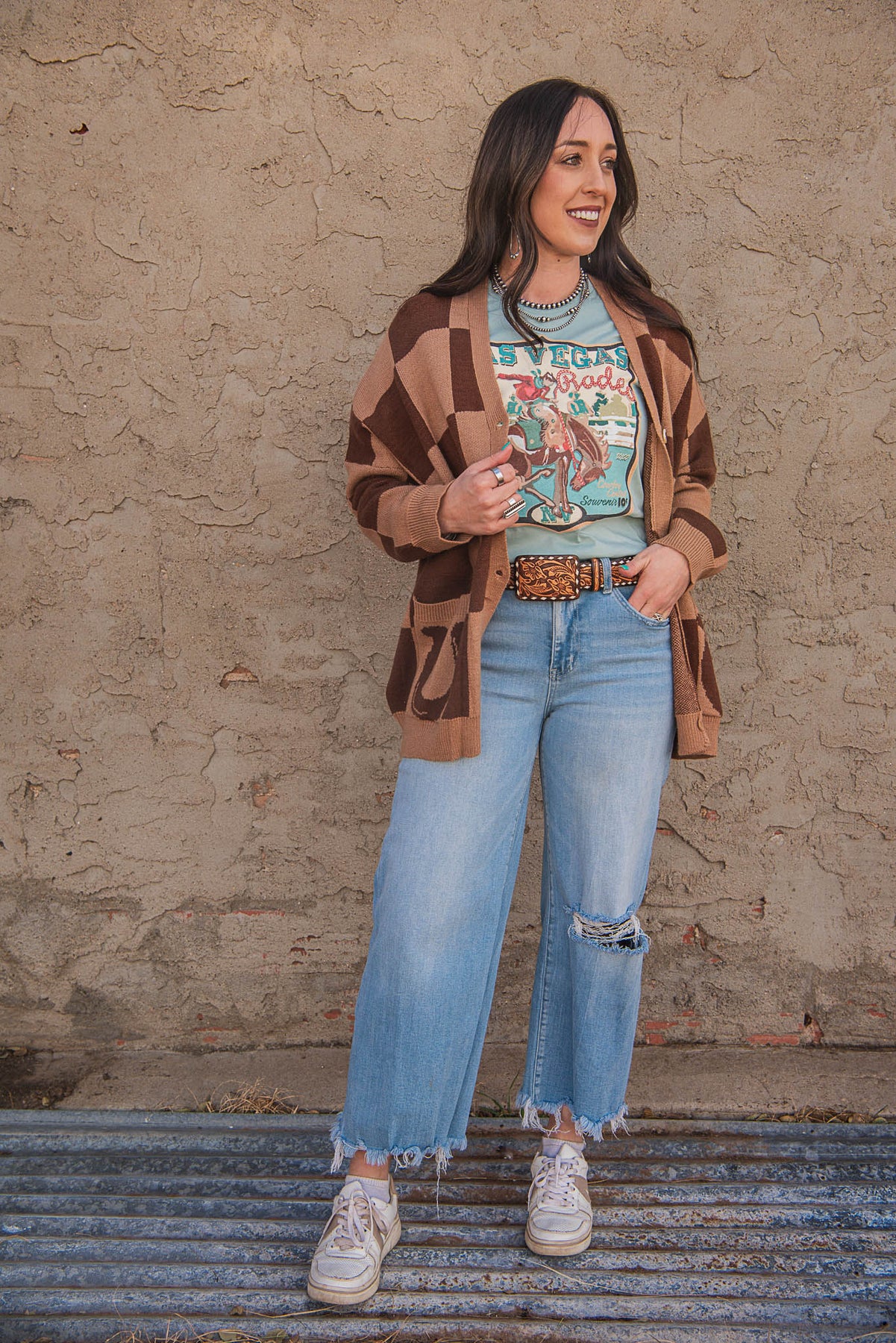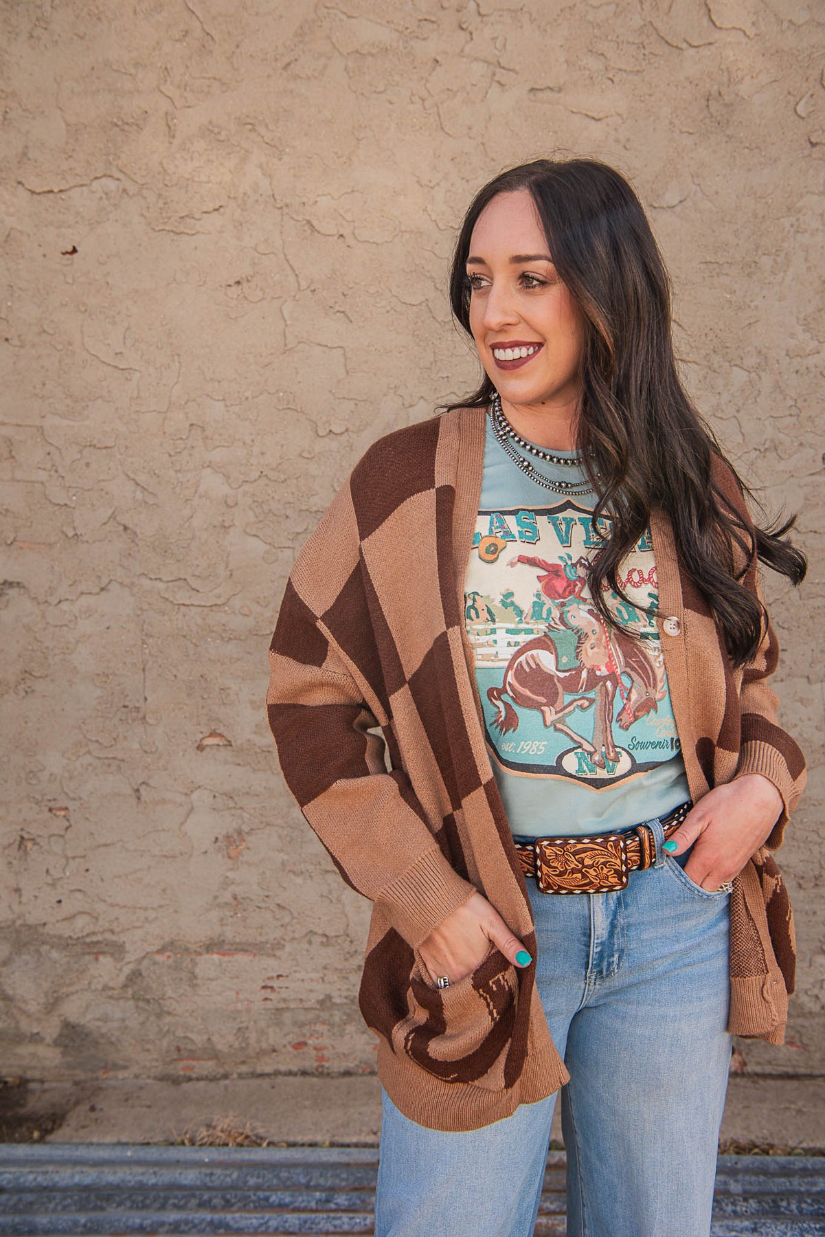 This cozy knit cardigan features a bold tan and brown checkered pattern with western-inspired horseshoe graphics on the front patch pockets. The design includes a V-neckline, button-down front with large contrast buttons, and ribbed trim at the cuffs and hem. Made with a soft knit construction and a relaxed fit, it’s ideal for casual layering in western, rustic, or heritage-themed boutique collections.