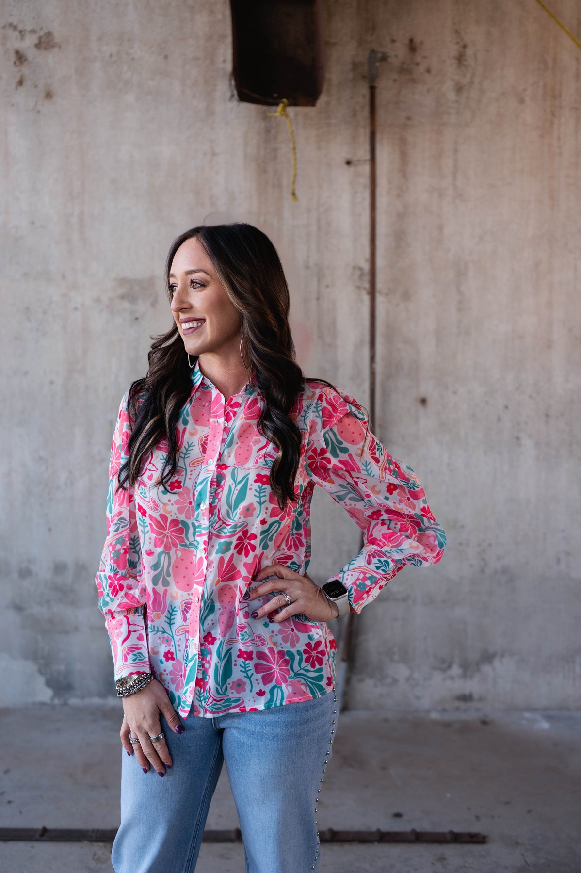 Meet your new layering essential! This sheer button-up blouse rocks a playful boho print featuring cacti, florals, and boots in vibrant turquoise and pink against a clean white backdrop. With its collared neckline and long sleeves, it's equally stunning worn solo or tucked under a cozy sweater. Feather-light and endlessly fun.