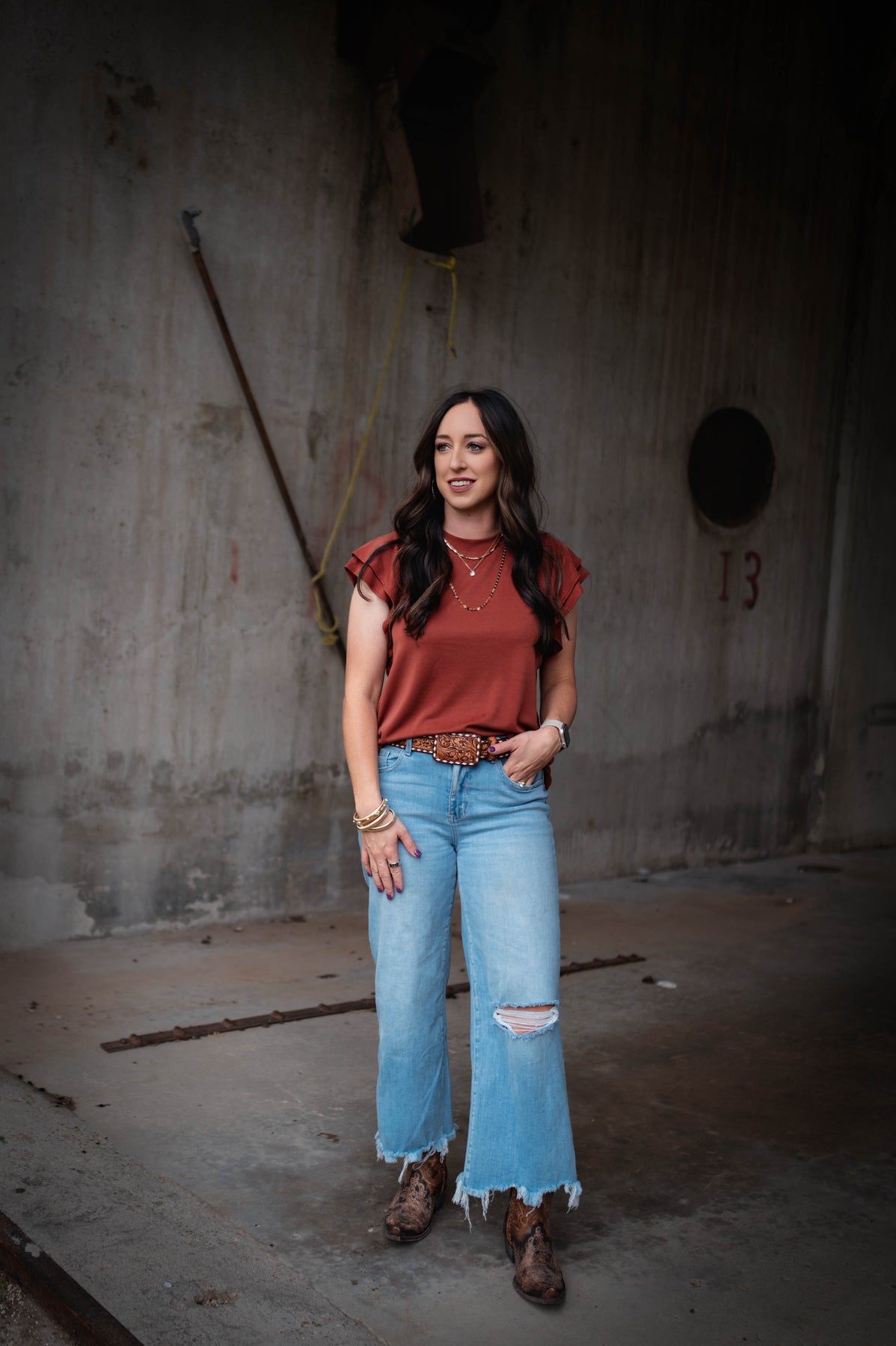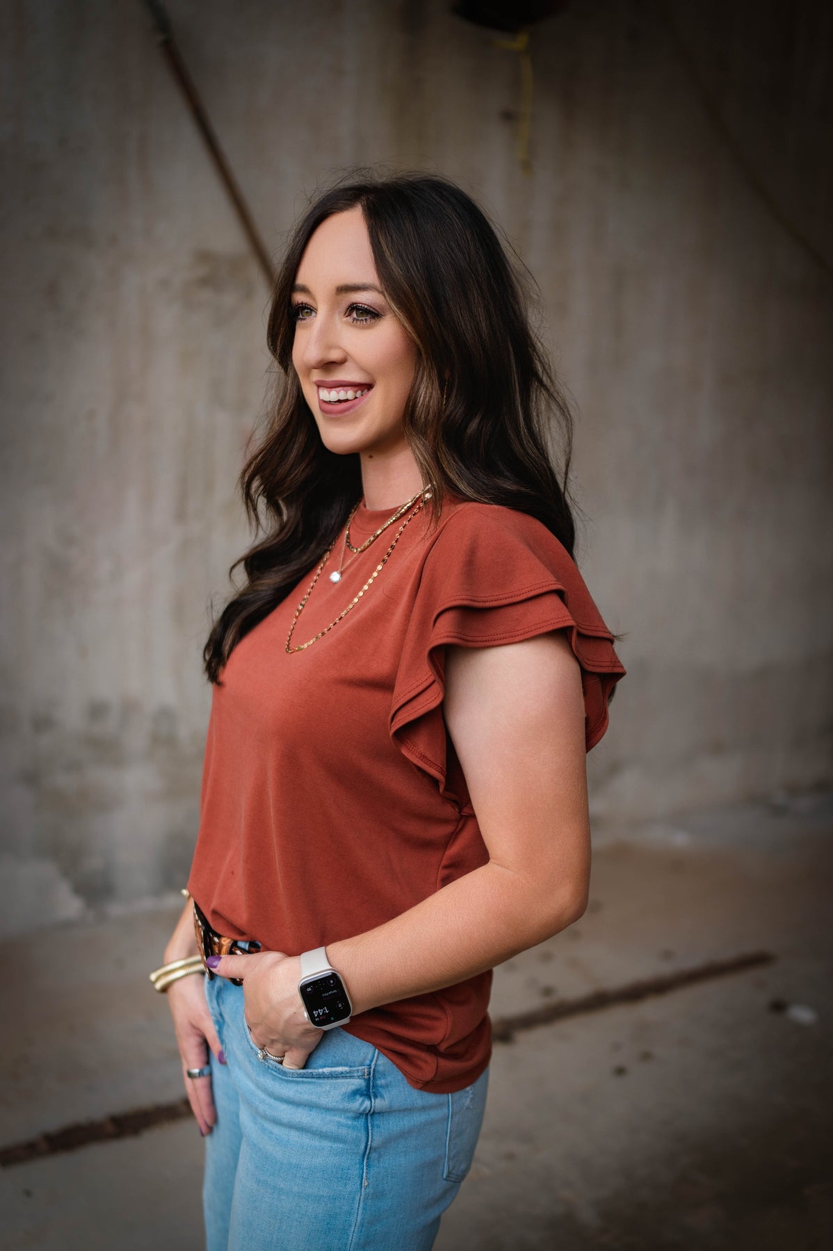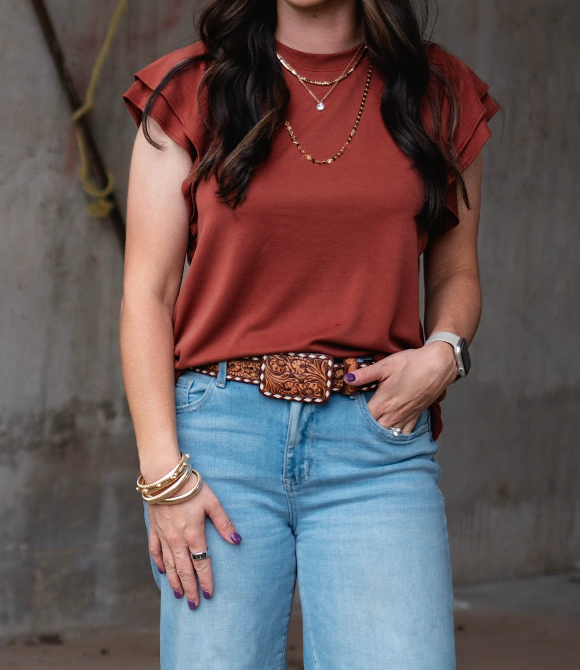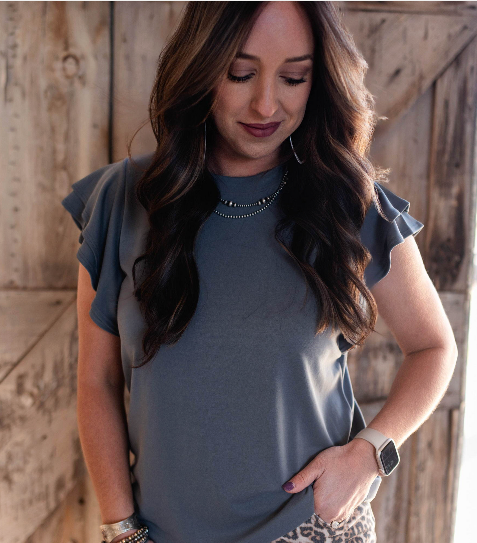 Elevate your everyday wardrobe with the Canyon Clay Top, a versatile piece that effortlessly transitions from casual to polished. This charming top features a round neckline framed by delicate ruffled sleeves and a gracefully flowing bodice that flatters every figure. The soft cap sleeves add a touch of feminine elegance while the medium-weight fabric provides comfortable structure and lasting durability. Available in two stunning colorways—warm brick and cool slate blue—this top pairs beautifully with jeans, skirts, or trousers for endless styling possibilities.