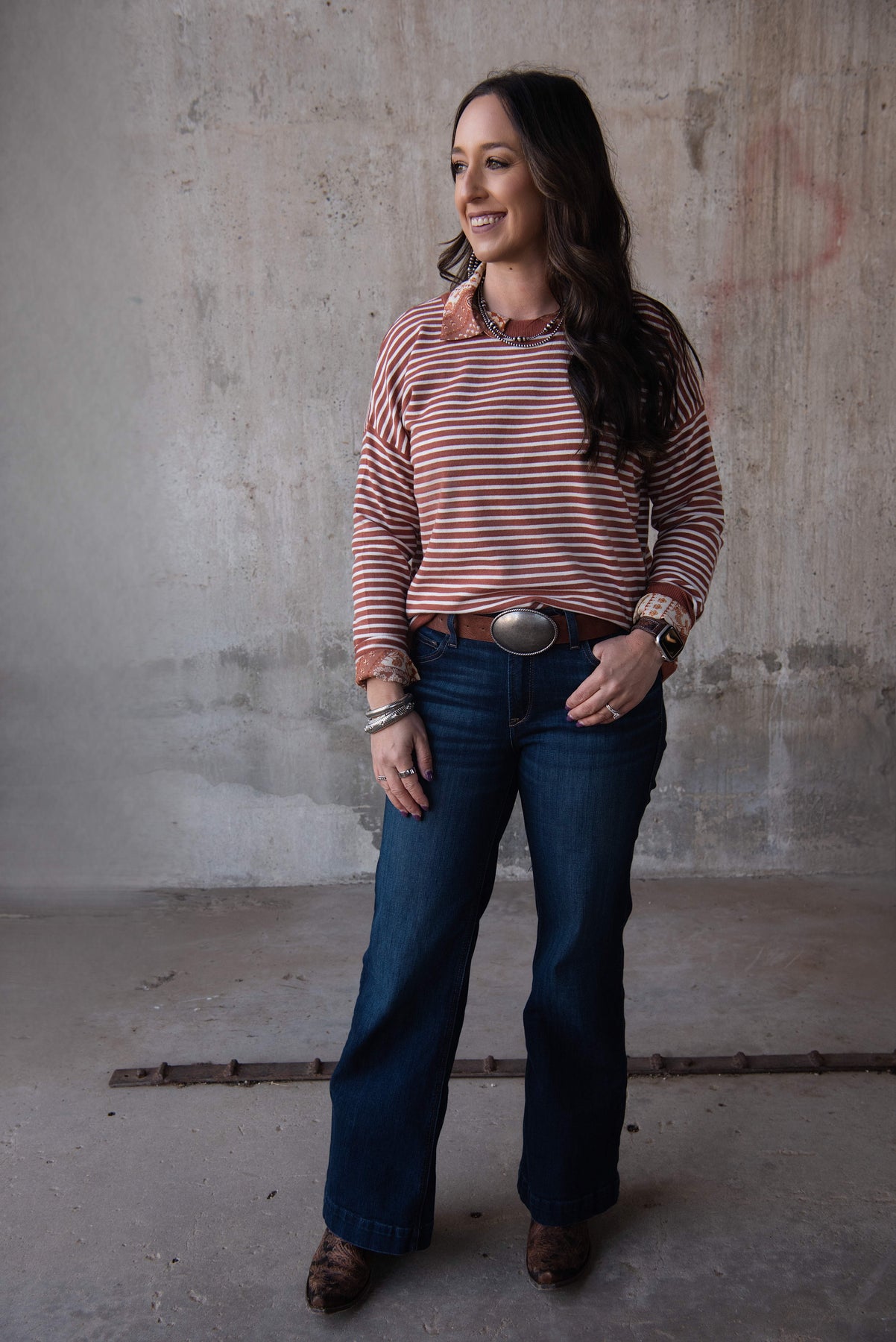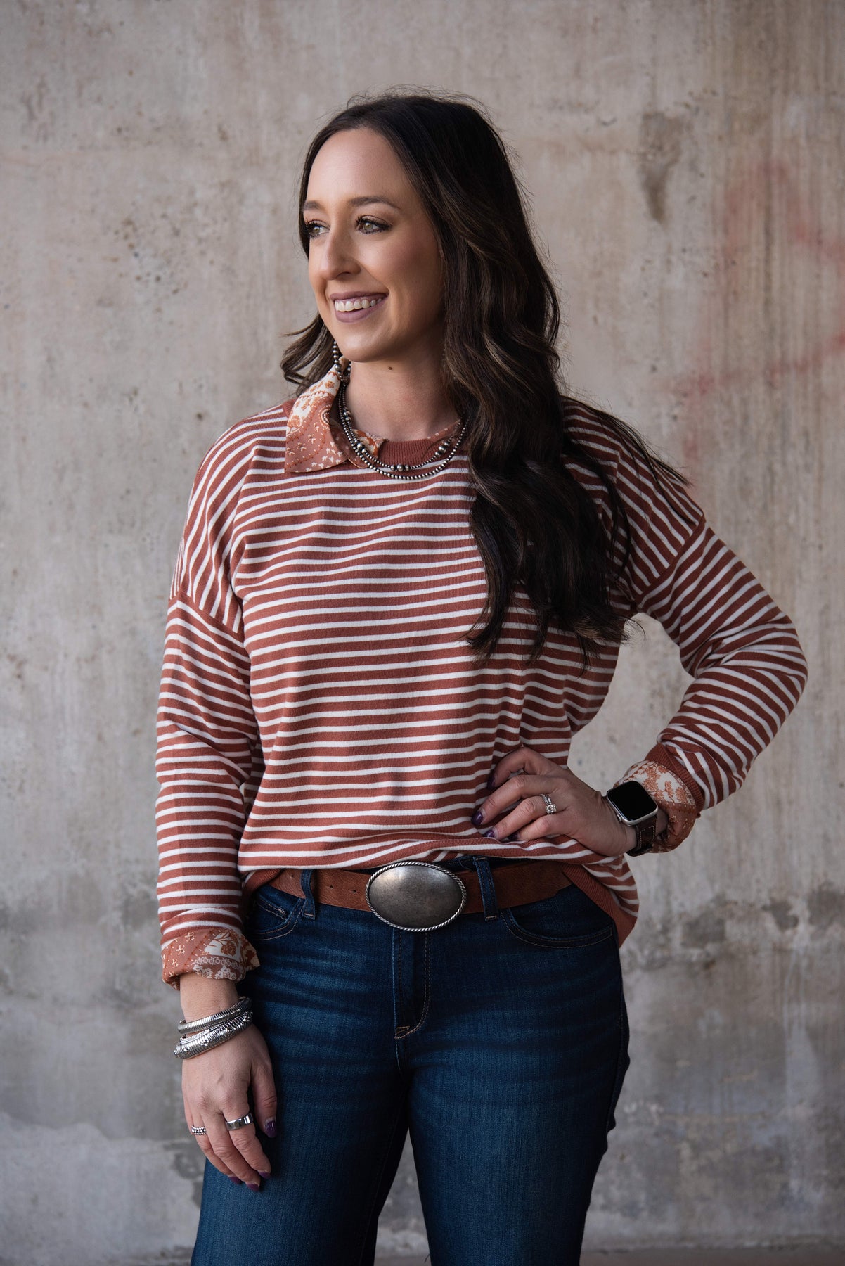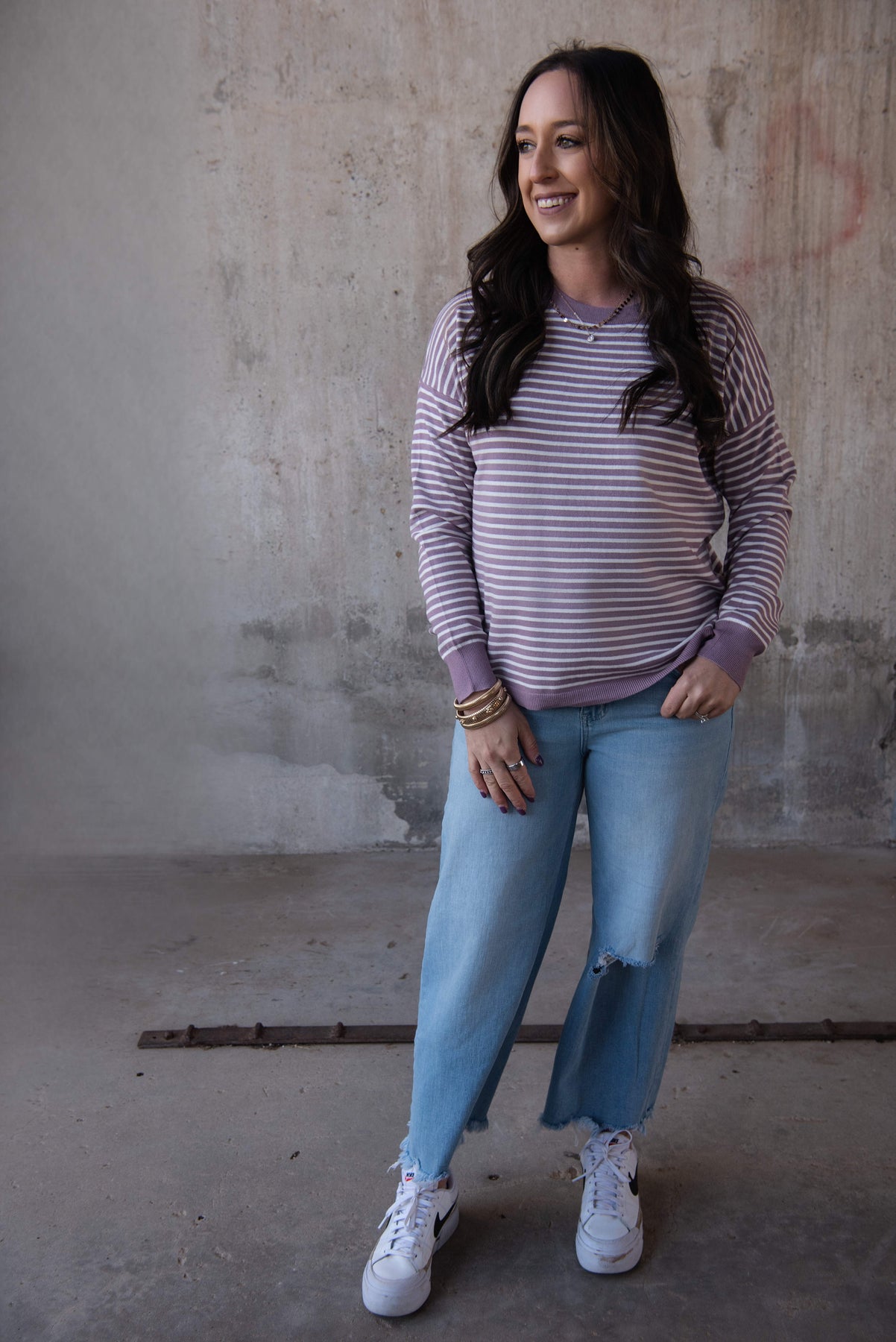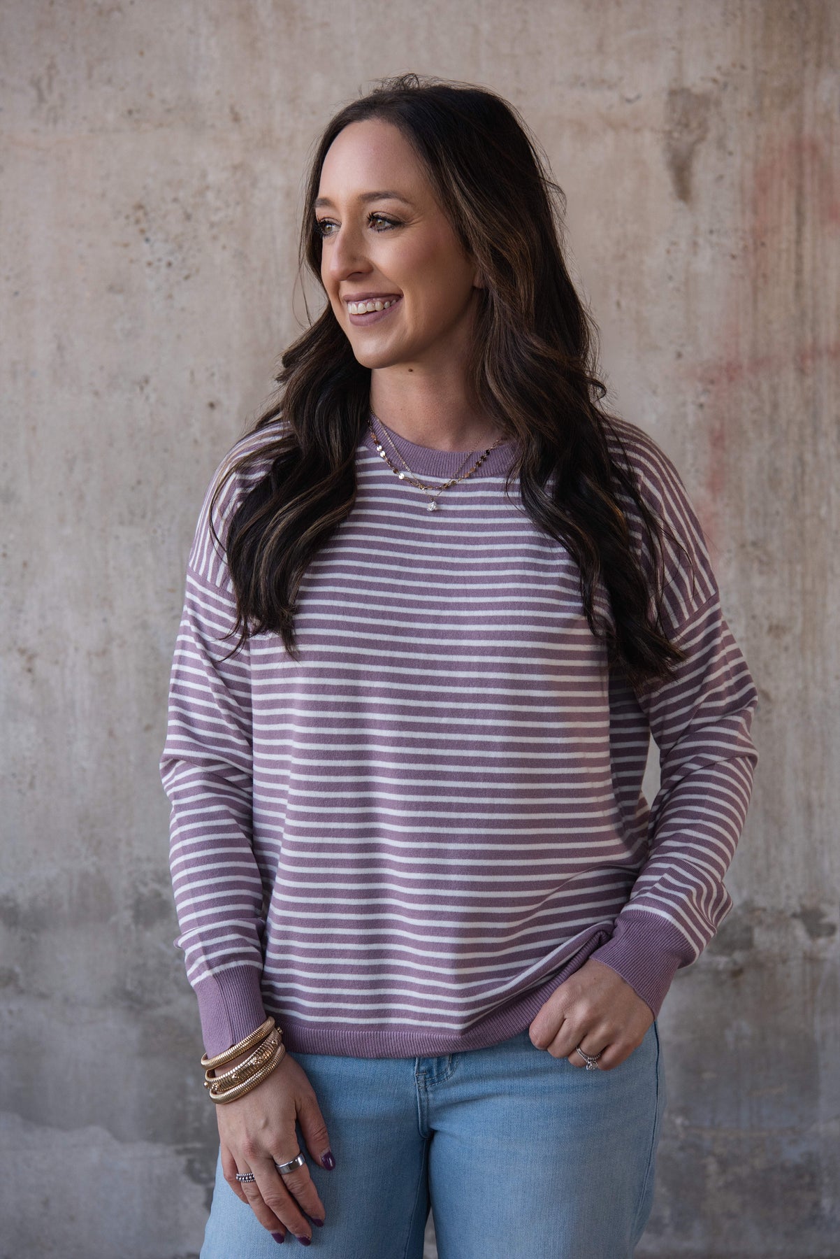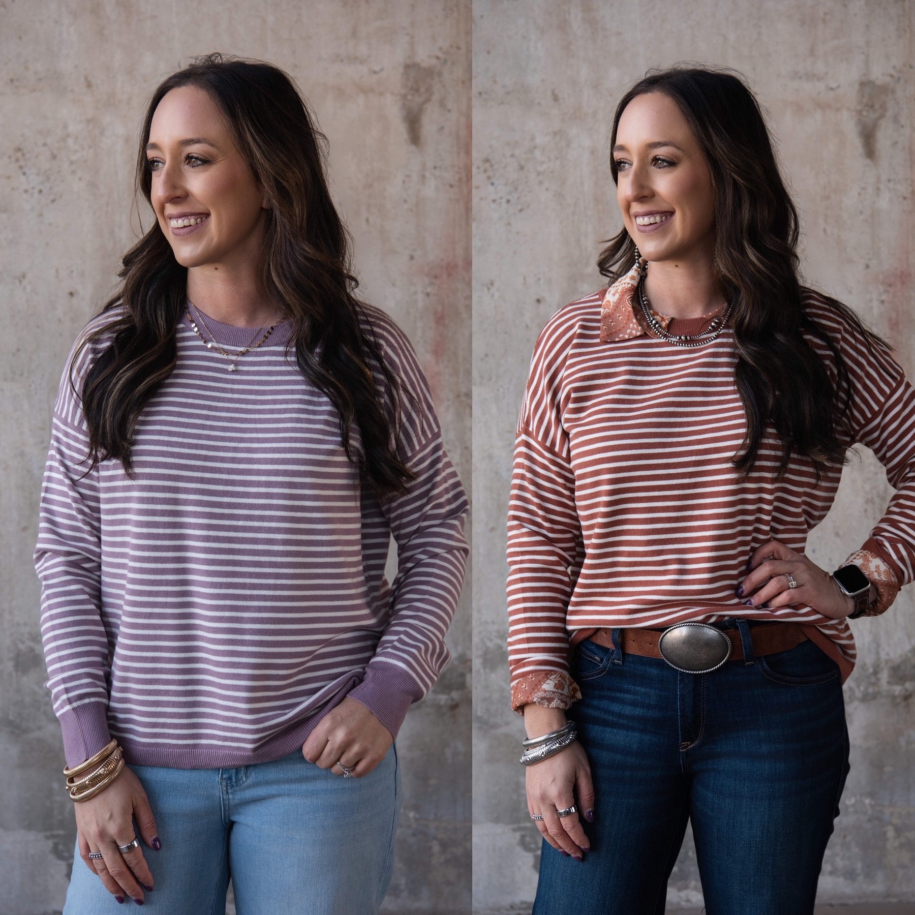 The Caroline Sweater is your new go-to for cozy vibes. Featuring classic stripes in soft, dreamy lavender or warm mocha brown, this sweater wraps you in comfort all day long. Buttery-soft fabric makes it impossible to take off once you slip it on. Perfect for lazy days or casual outings. Layer with your favorite sheer button down for an elevated look.