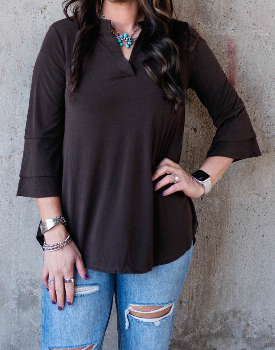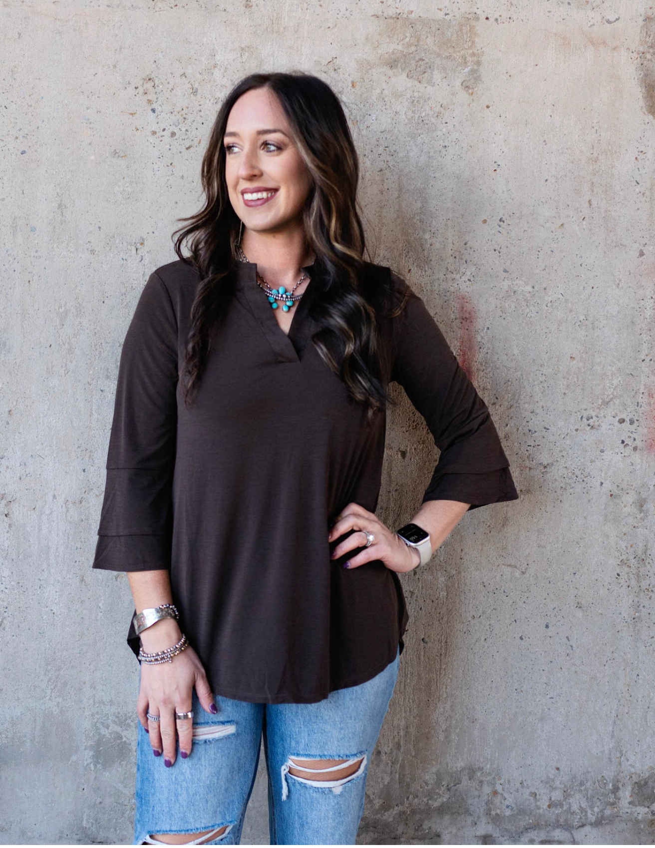 An elegant essential for the modern wardrobe, the Cocoa & Coal Top pairs a silky drape with thoughtful design details. The flowing bodice skims gracefully through the midsection while the tailored shoulders and ruffle sleeves deliver understated sophistication. Versatile enough for any occasion.
