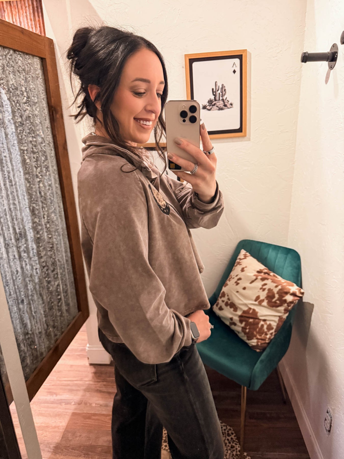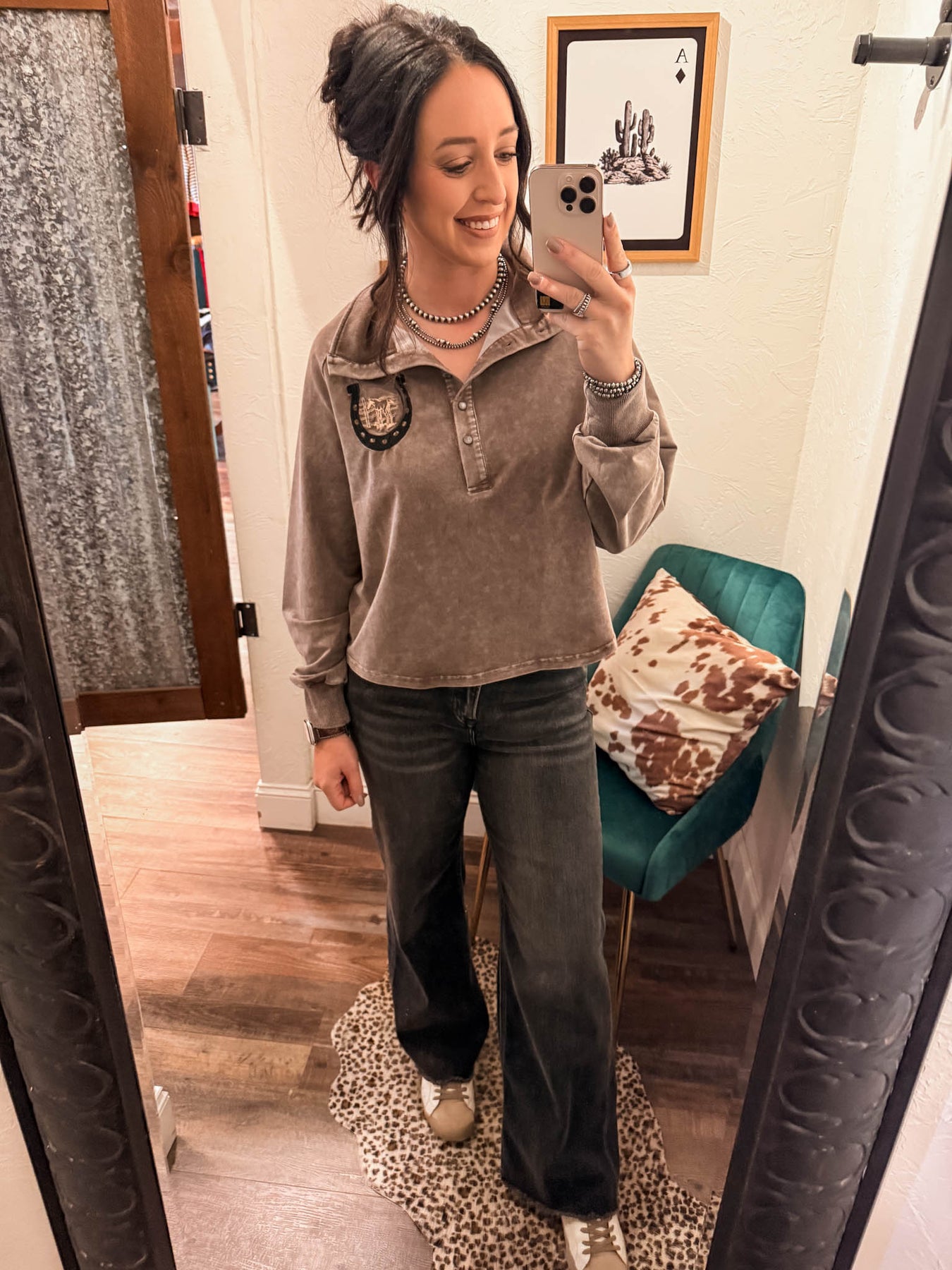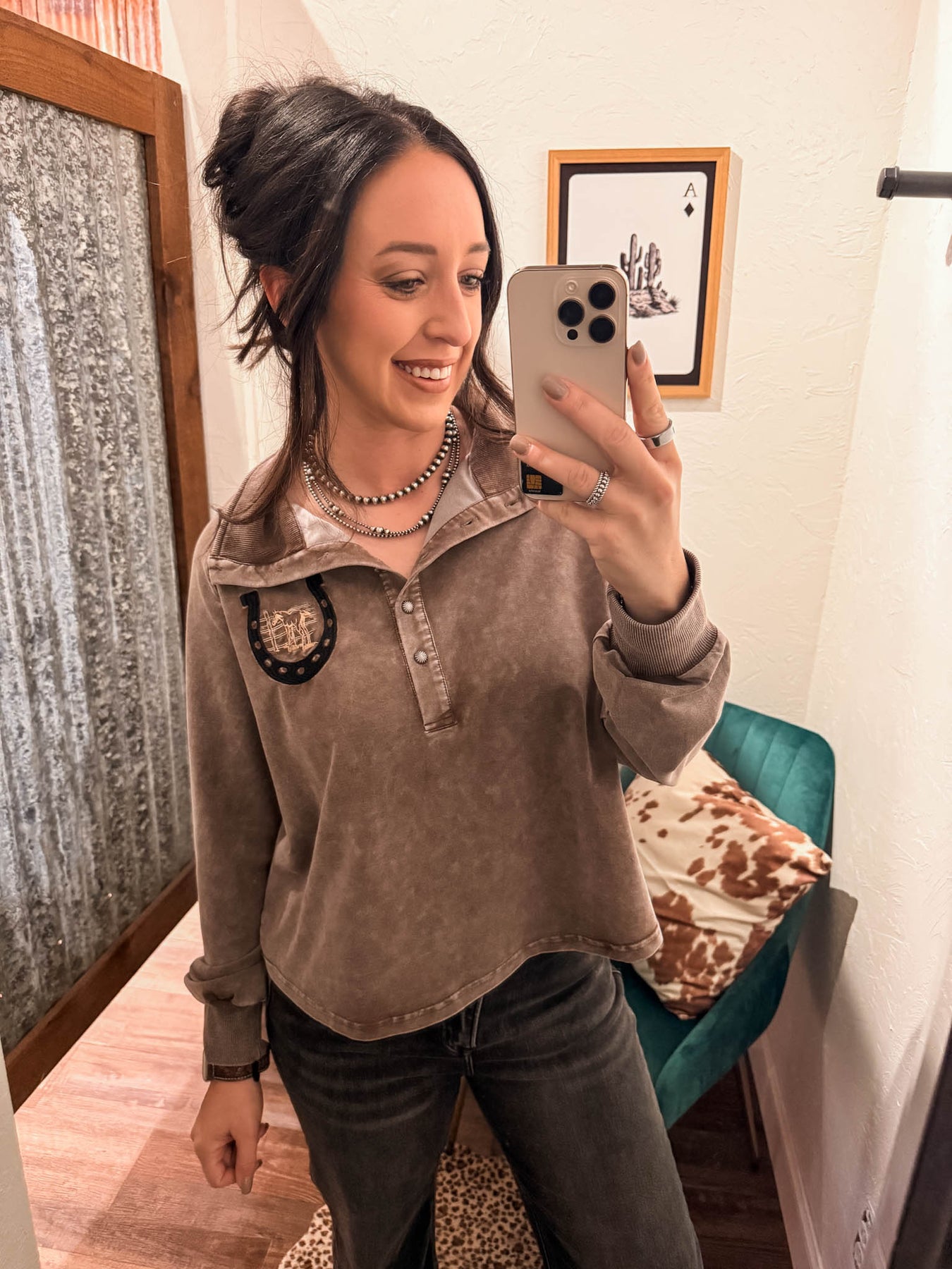 Step back in time with this retro-inspired milk chocolate pullover that feels straight out of a '90s Western dream. The acid wash finish, concho buttons, horseshoe applique, and embroidered colt deliver vintage authenticity, while the modern cut keeps it fresh and wearable today. Nostalgia never looked so good.