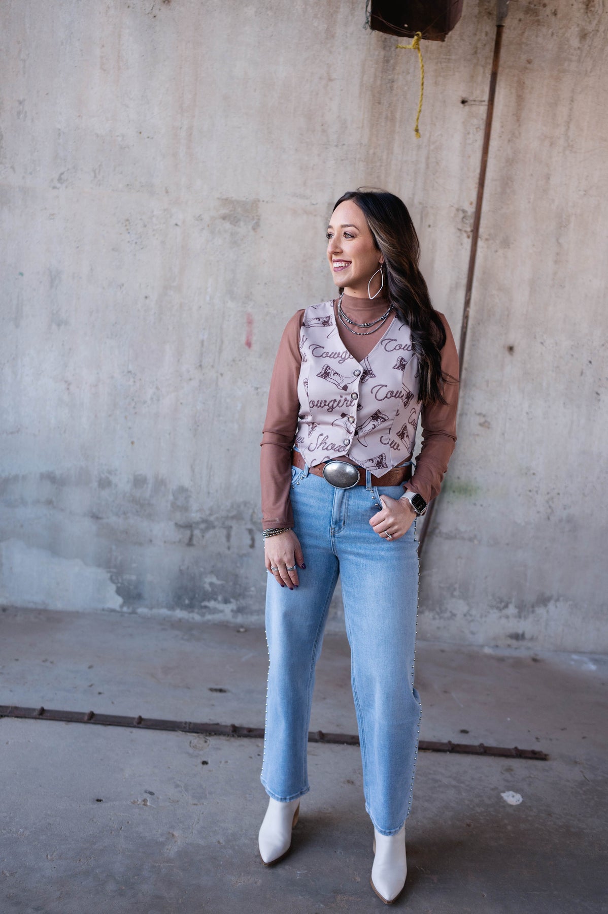 Make a statement with this taupe button-up vest featuring mocha brown western graphics—boots, cowboy text, and more. Perfect for layering with our brown sugar mesh and the right accessories. Slip it on to instantly elevate your look with that coveted cowgirl charm and timeless appeal.