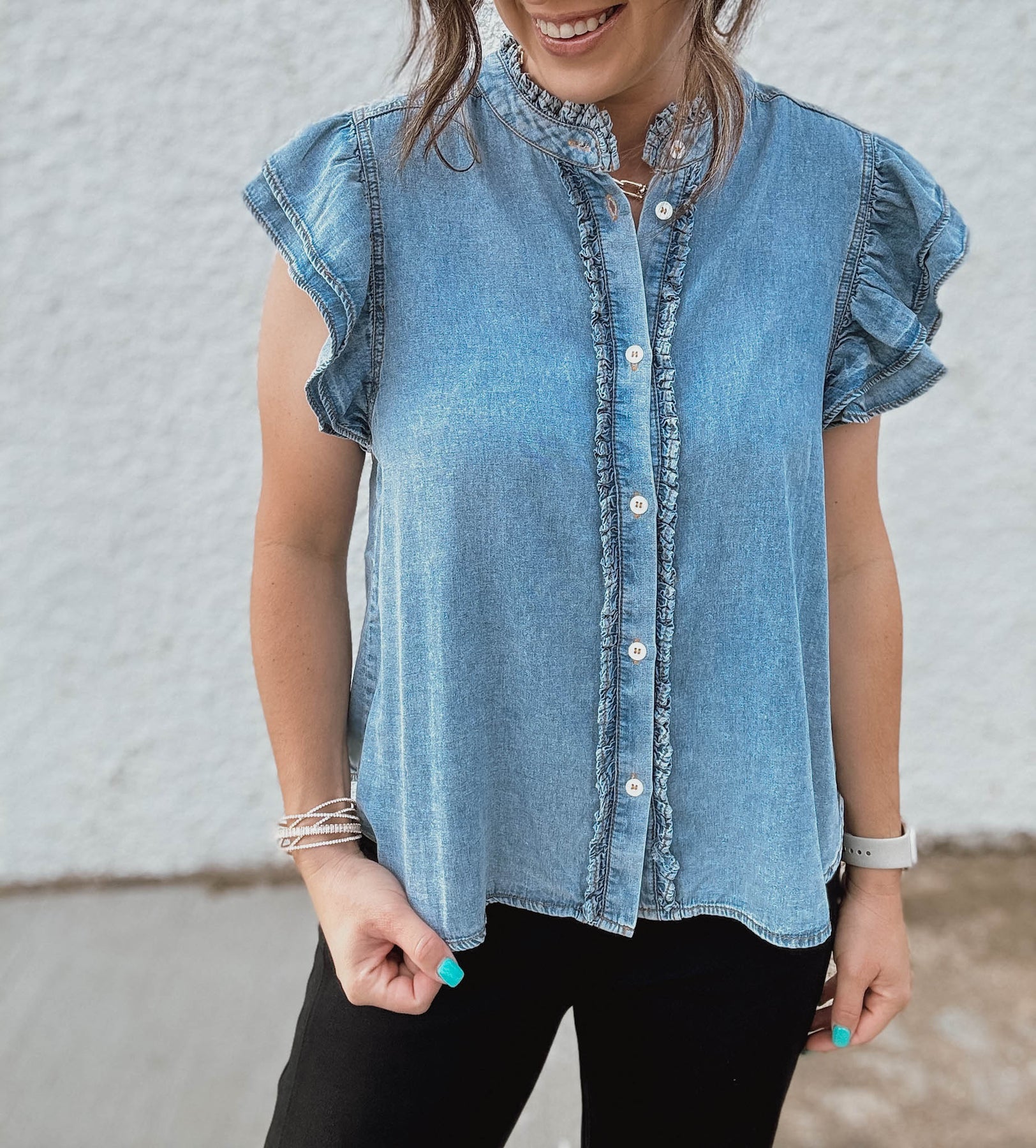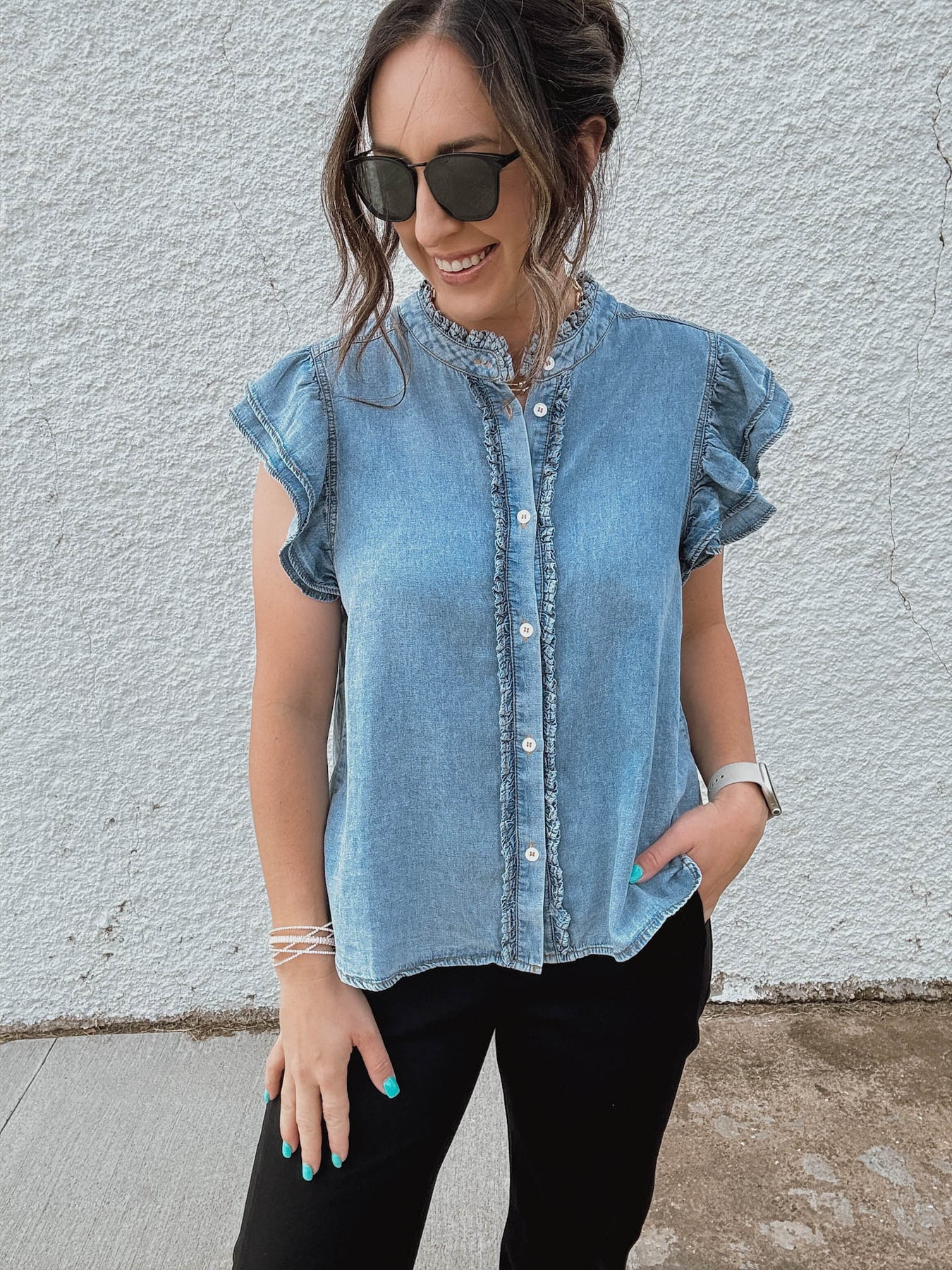 Introducing the Denim Darlin' Top—your new go-to for effortless style. This feminine classic features a flattering cap sleeve design paired with a functional button-down front that lets you customize your look. The detailed center seam adds sophisticated structure and visual interest, creating a polished silhouette that works equally well dressed up or down. Versatile, comfortable, and undeniably chic.