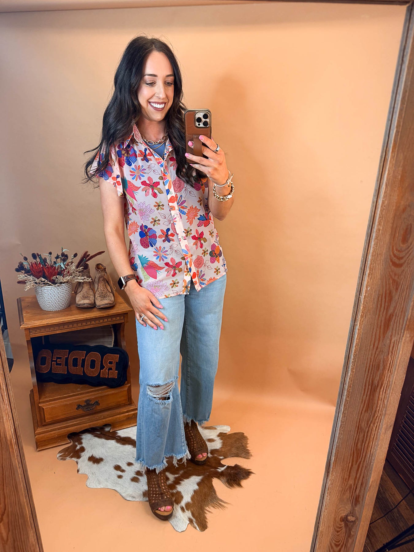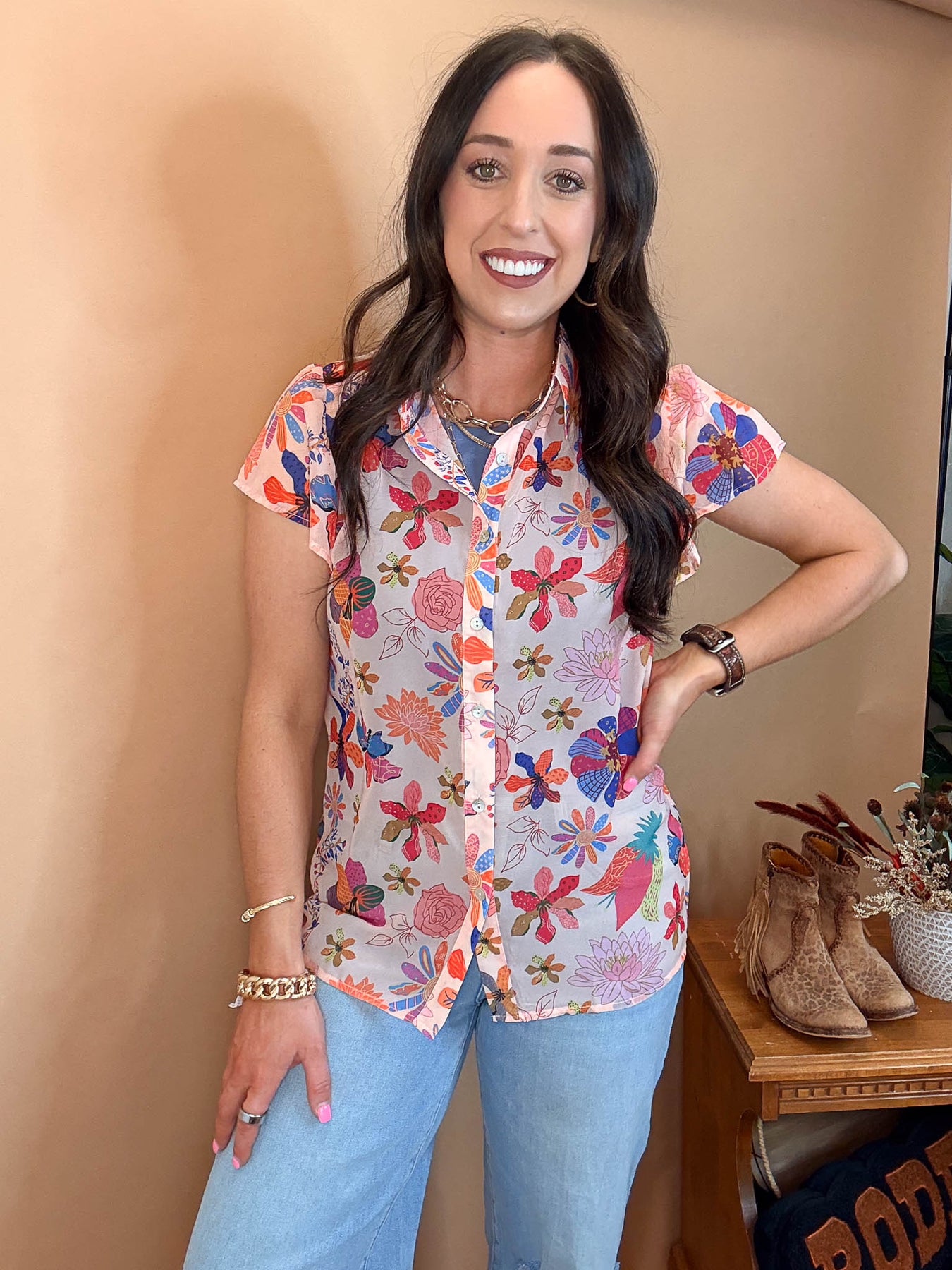 Embrace the season with this enchanting floral flutter sleeve top. Delicate sheer fabric drapes beautifully, and is ideal for layering or wearing solo on warmer afternoons. This piece captures effortless spring elegance.
