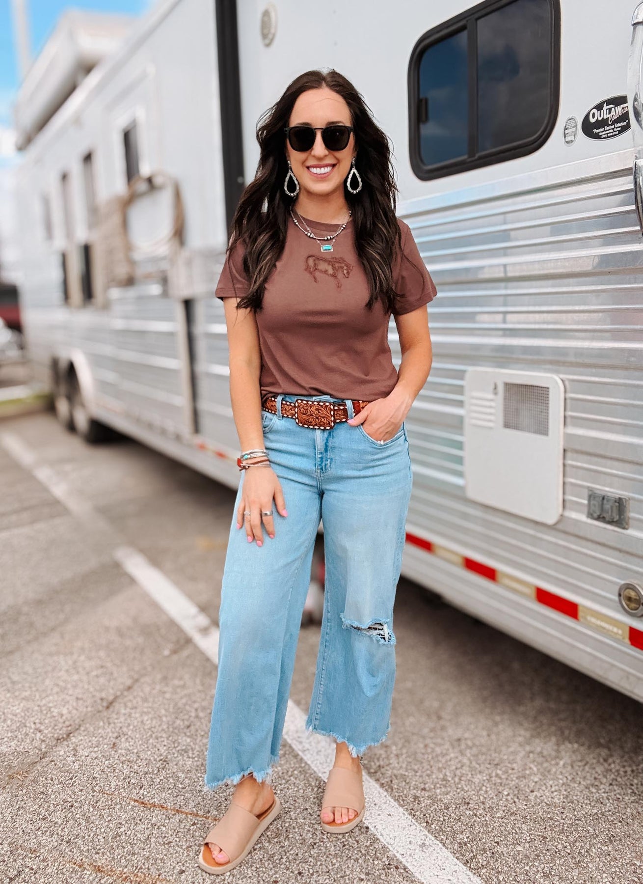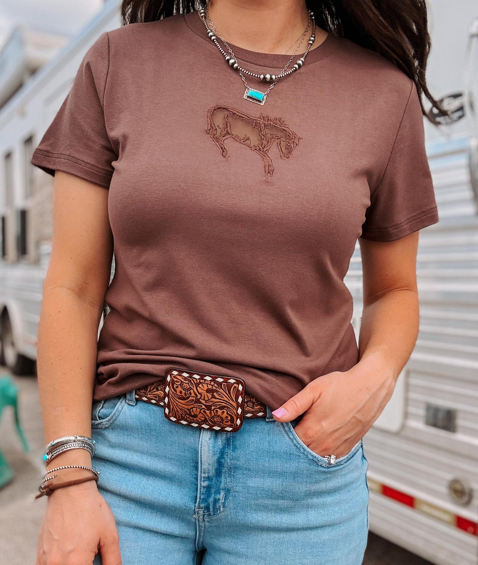 The Fresh Colt Top delivers effortless style in a rich chocolate brown with a striking mesh cutout bucking horse detail. Designed for comfort and versatility, this long sleeve layers beautifully under jackets or stands alone as a go-to casual essential. Perfect for anyone seeking that ideal balance of laid-back wearability and distinctive flair.