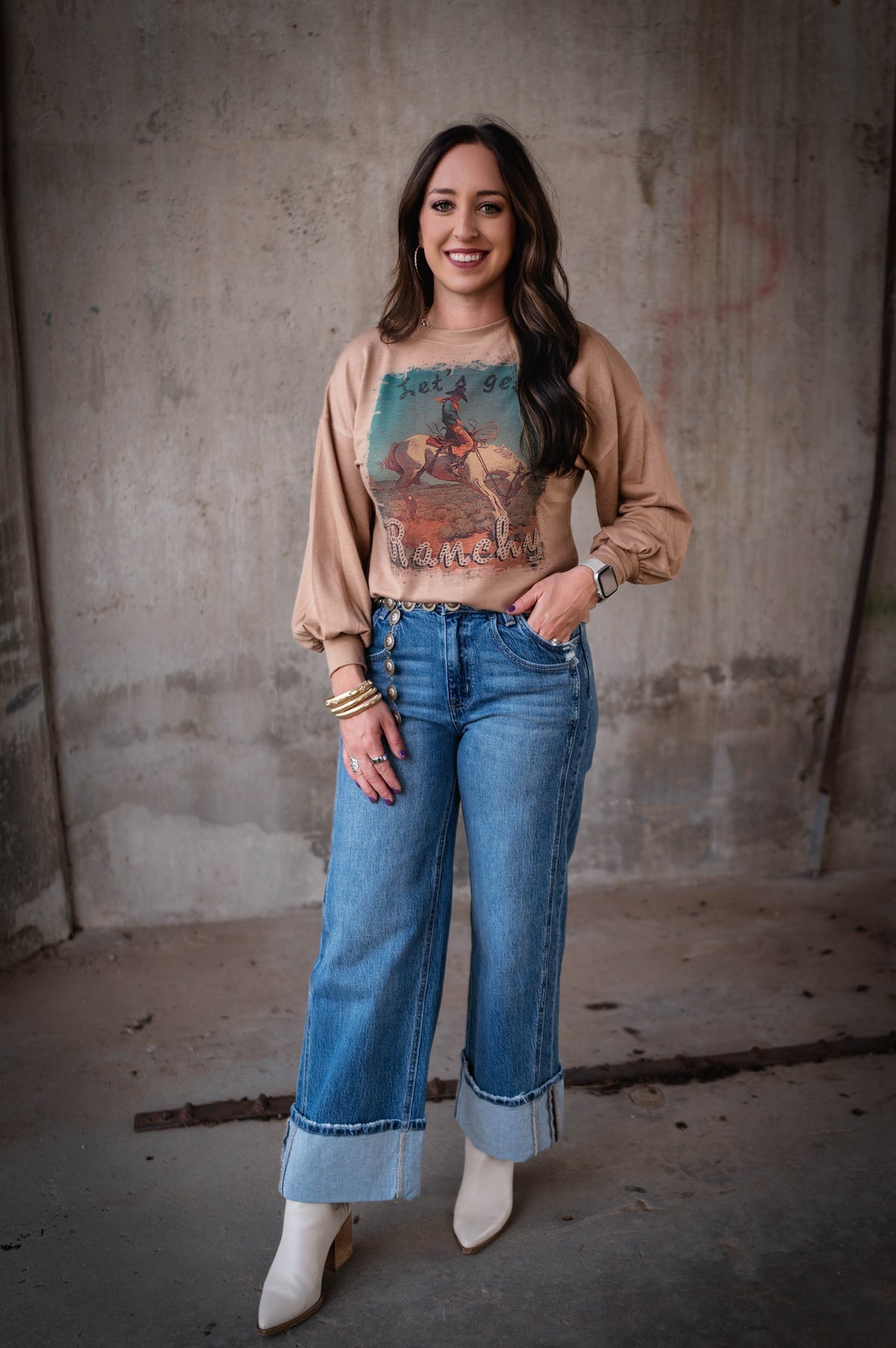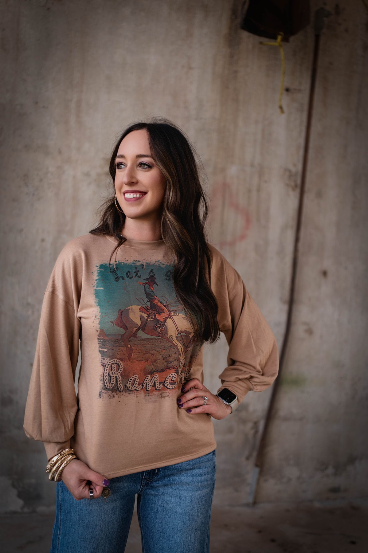 Rock a bold western vibe with this long sleeve top, complete with trendy balloon sleeves and a colorful graphic that demands attention. Whether you're channeling ranch energy or just want to stand out, this piece delivers laid-back style with serious personality. Comfortable enough for all-day wear and fun enough to make a statement.
