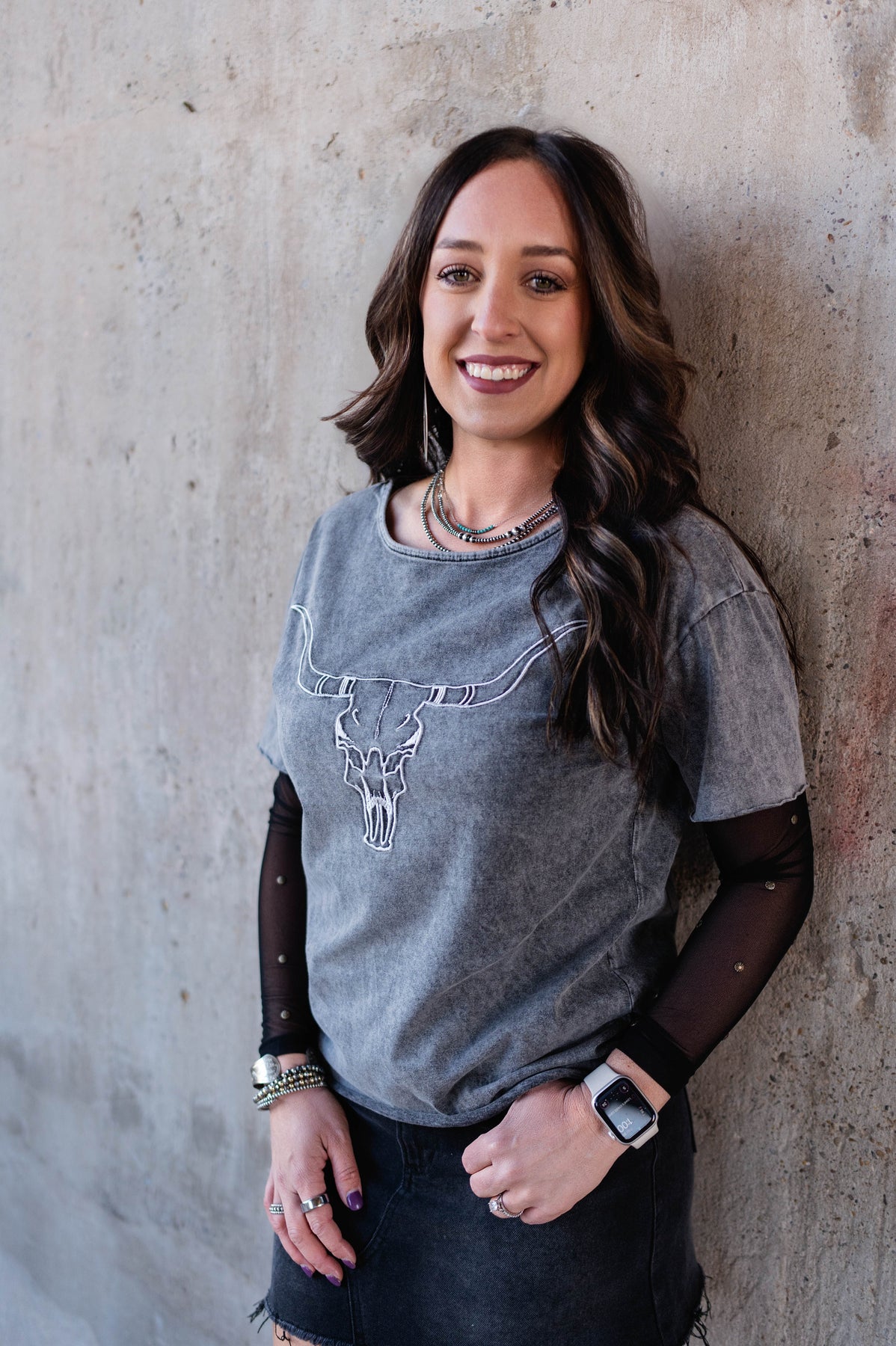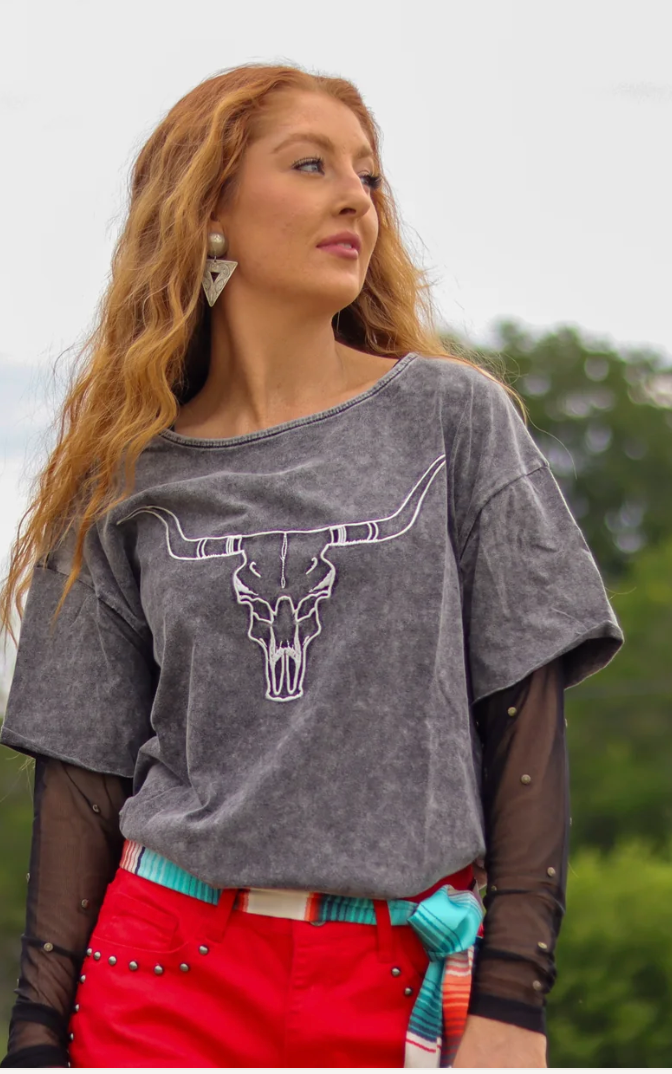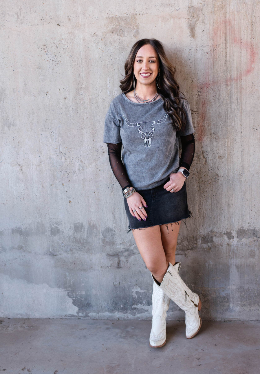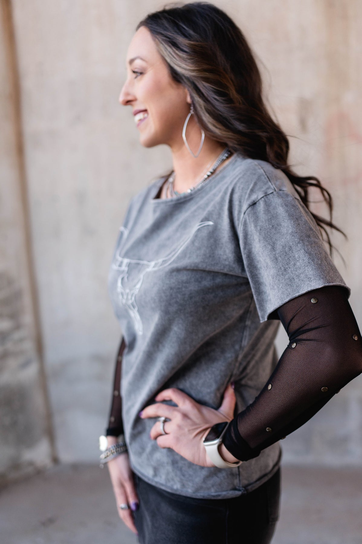This two in one shirt features built in long mesh sleeves with copper studs making it cool and edgy, even for every day wear. *Paired with the Onyx Edge Skirt*