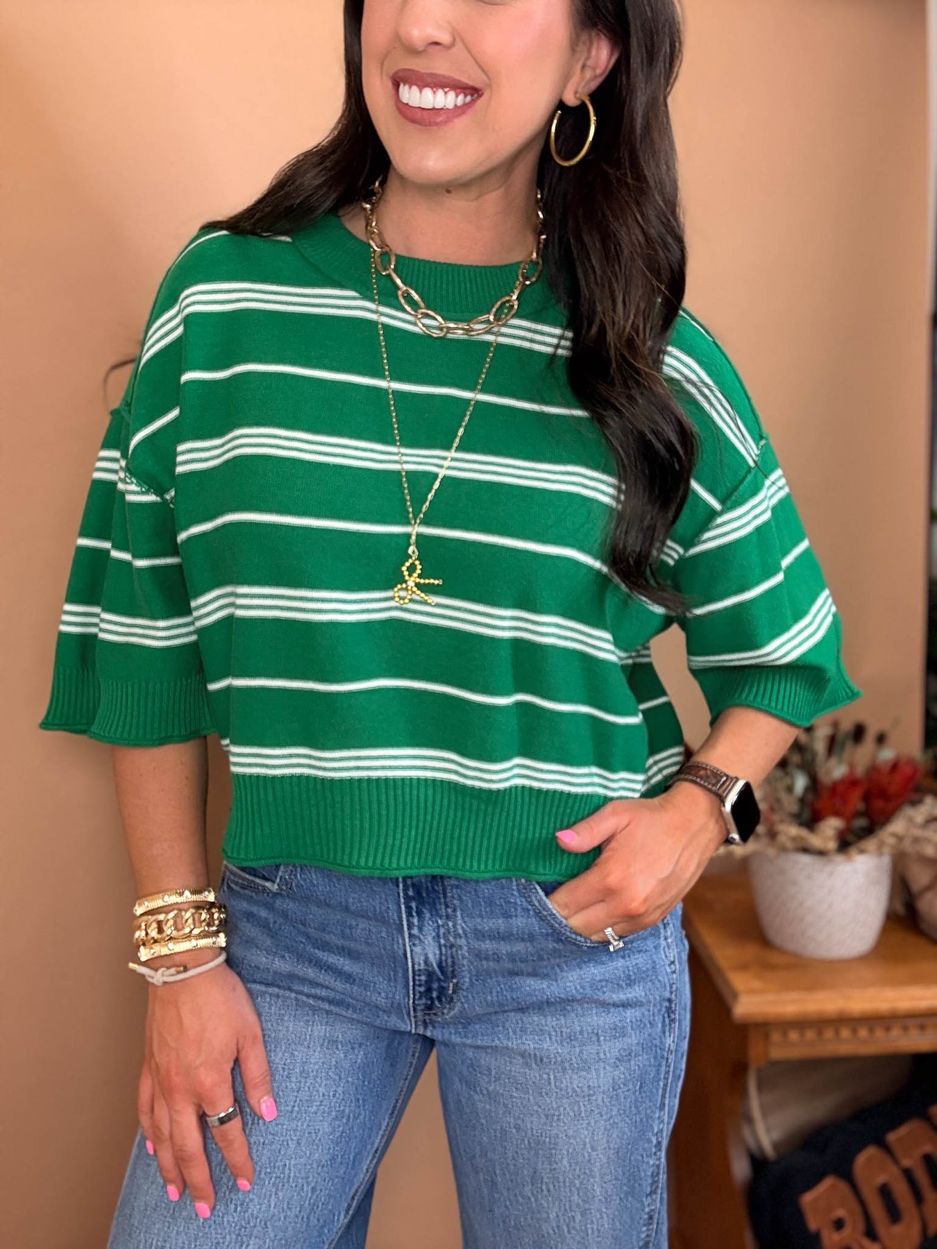 Effortless style meets everyday comfort in the Mia Knit Tee. This striped half-sleeve top features a relaxed drop shoulder silhouette that flatters any frame. Ribbed detailing at the neckline, cuffs, and hem creates a polished finish while the medium-weight knit fabric provides structure without bulk. Unlined and non-sheer, it's versatile enough to layer or wear solo. Perfect for casual weekends or dressed-up occasions.