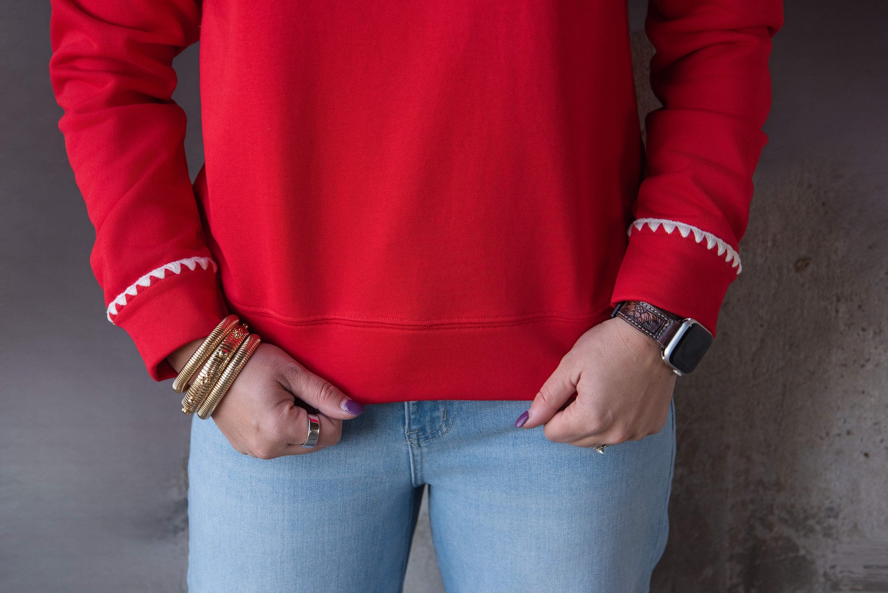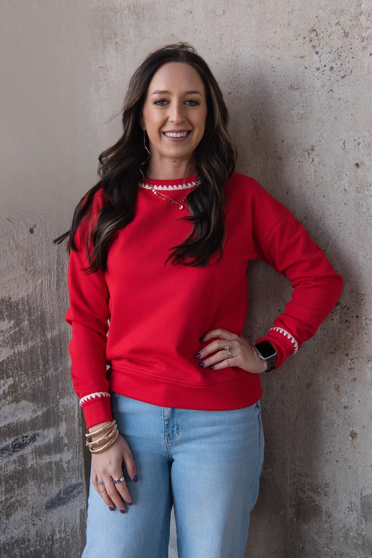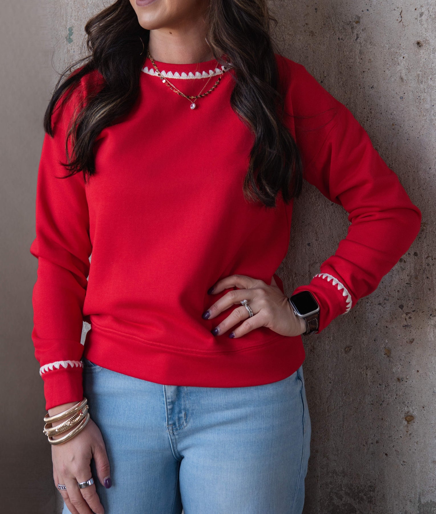 This show-stopping red velvet sweater is your new holiday (or Western) essential. Luxe true Christmas red paired with playful taupe squiggly trim creates instant personality. Dress it up for festive gatherings or style it casually—either way, you'll turn heads.