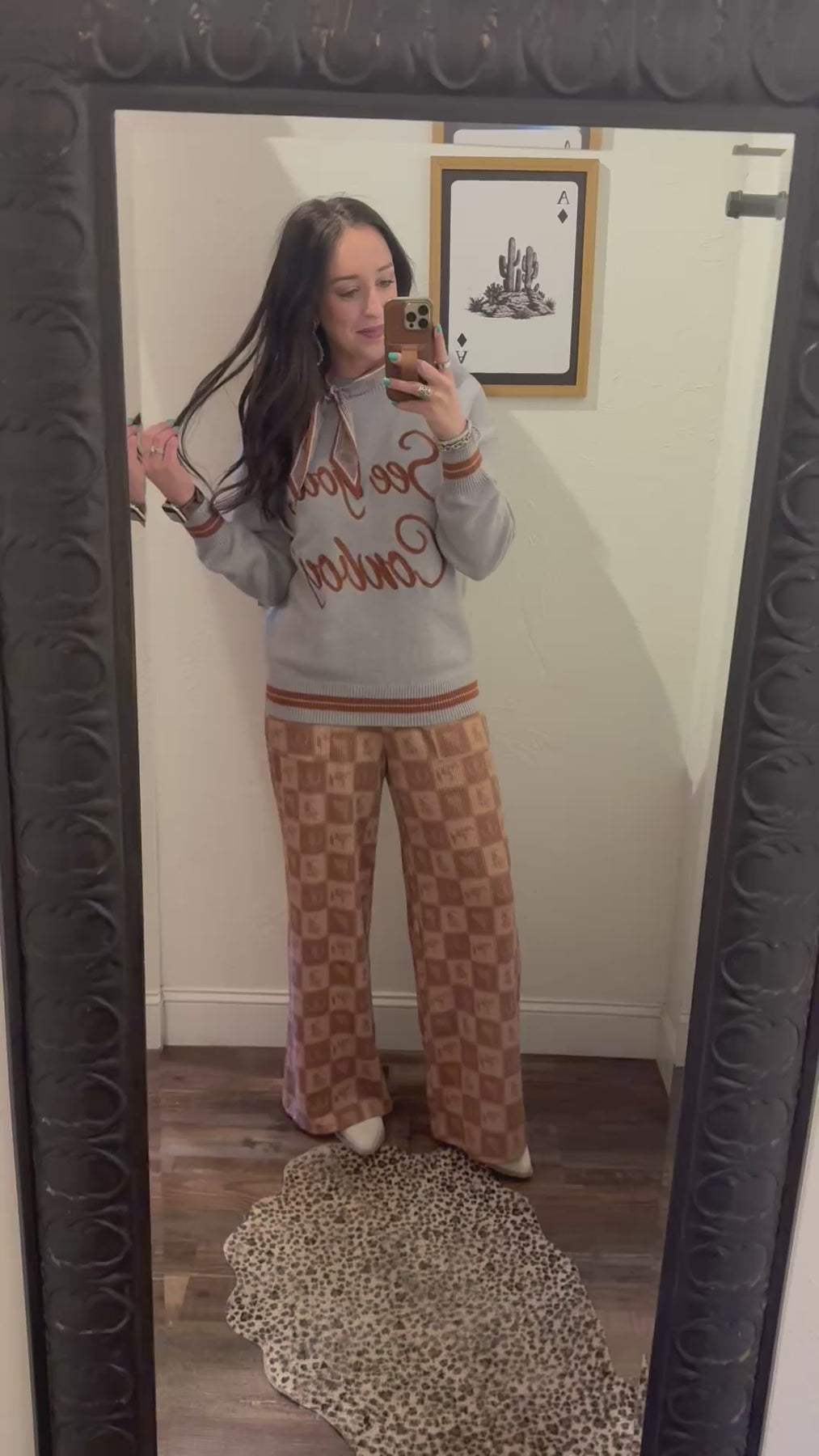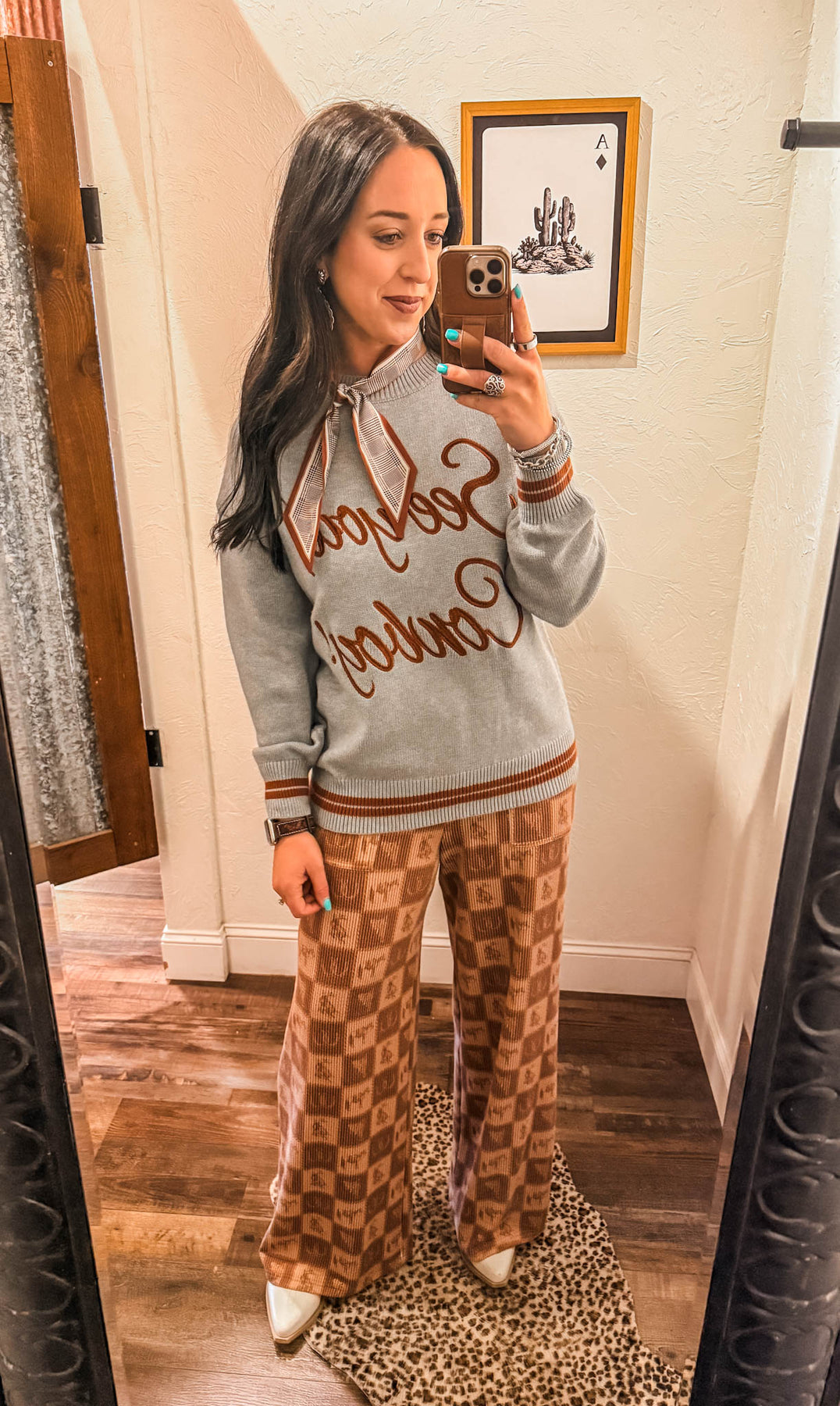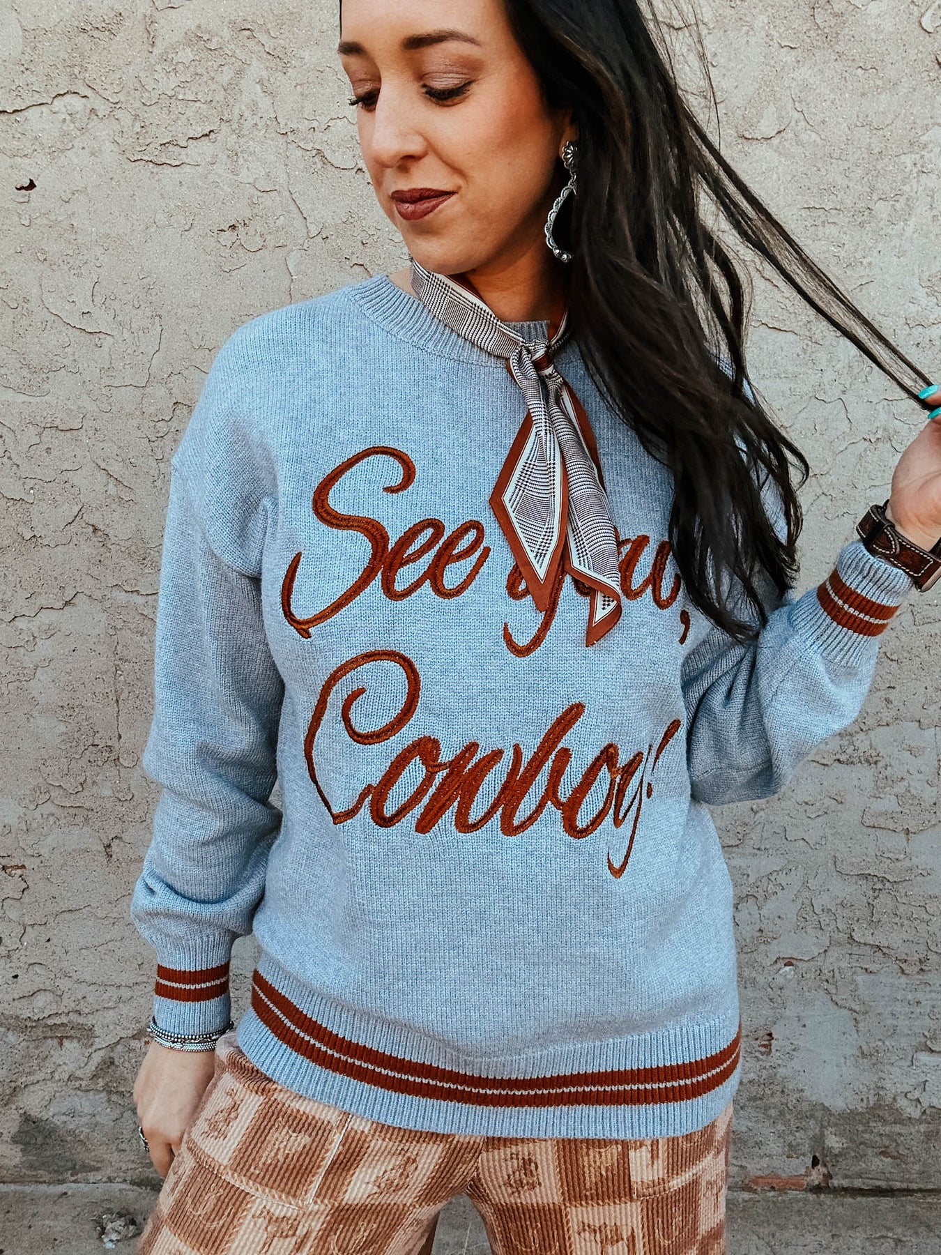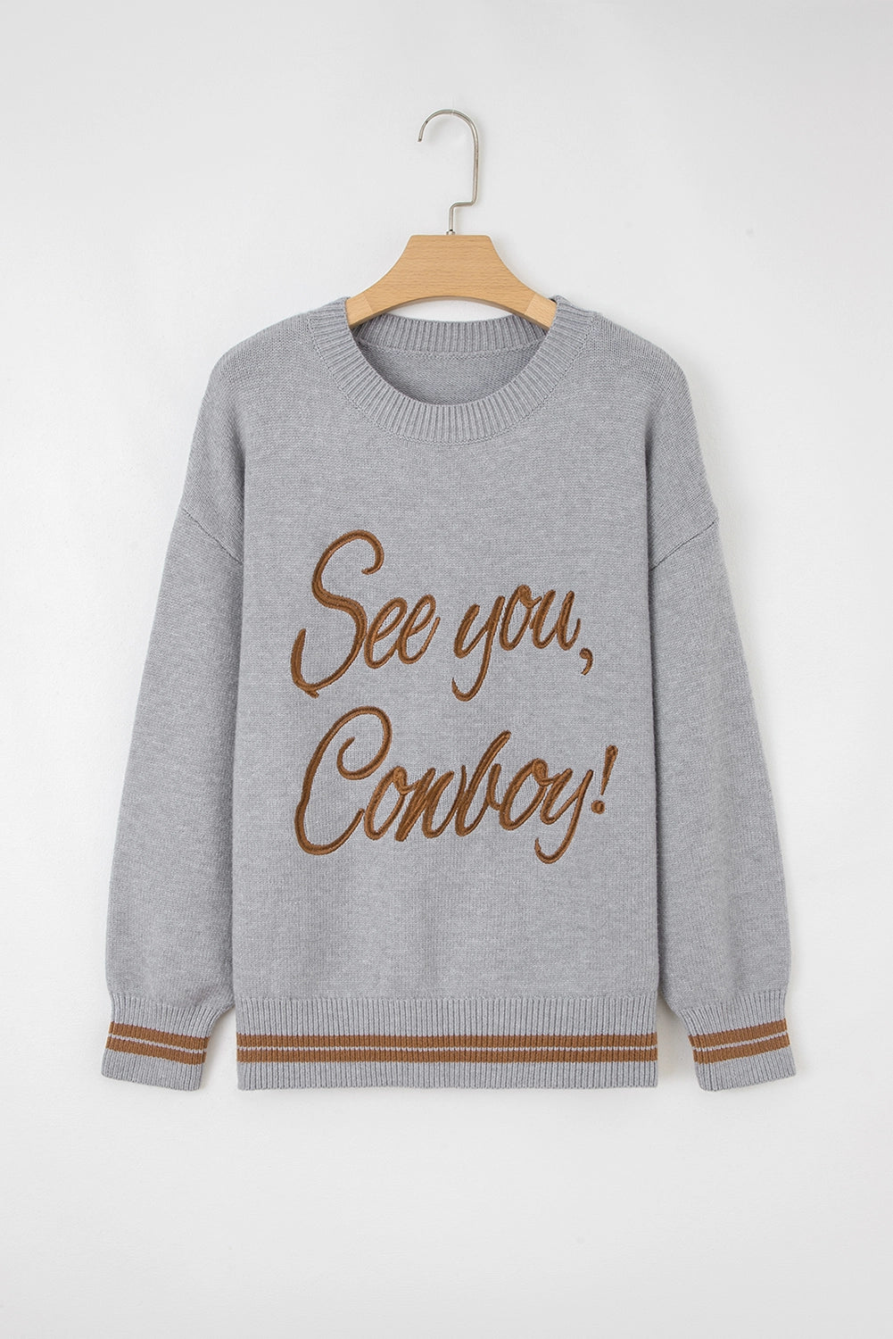 Cozy up in this oversized grey sweater featuring a cheeky "See You Cowboy" message in rustic rust lettering. Soft fabric pairs perfectly with the contrasting rust trim at the hem for a laid-back, Western-inspired vibe. Your new go-to for effortless style with personality. Add a white or denim button down, or a colored pant for a trendy look.