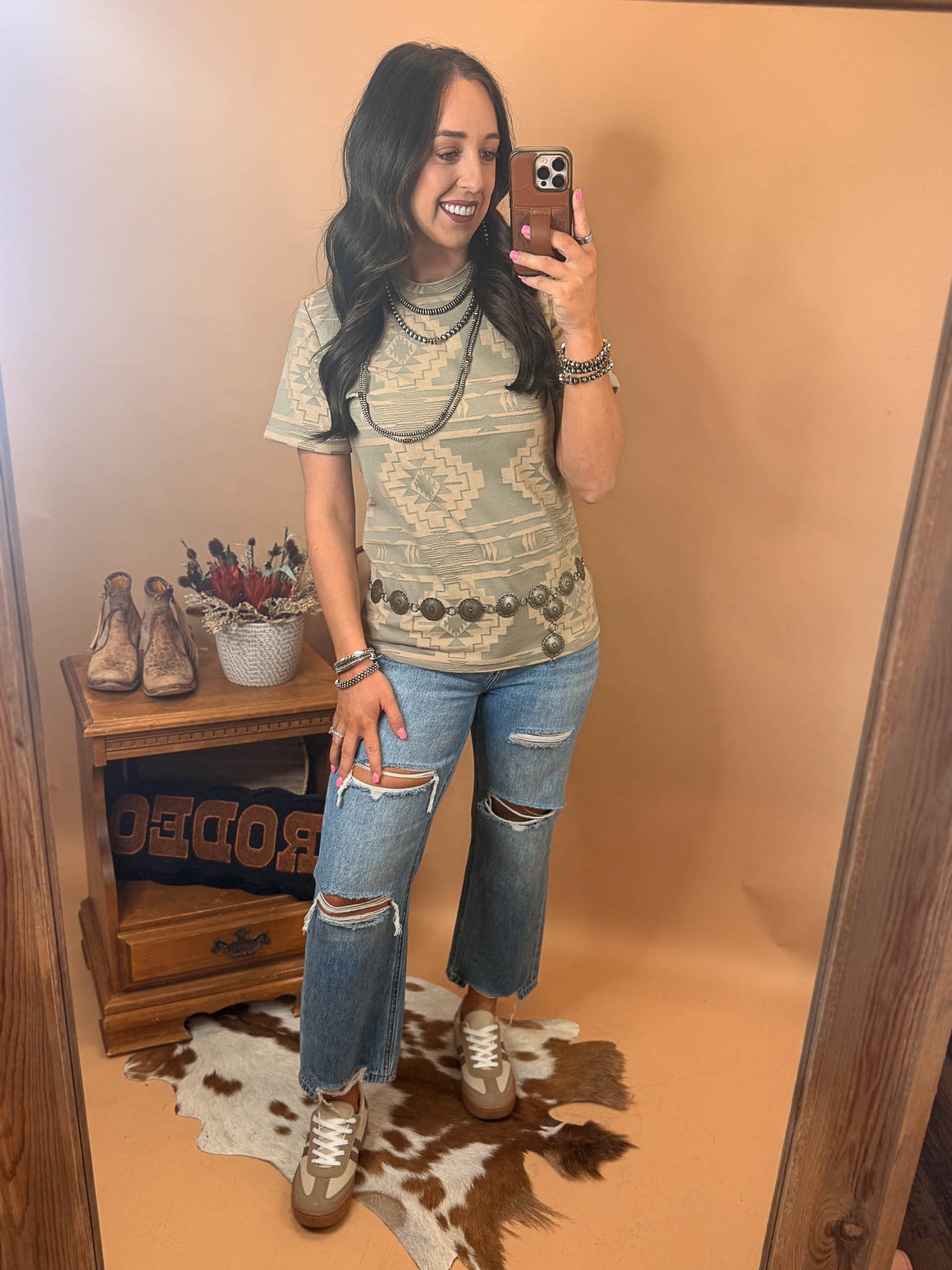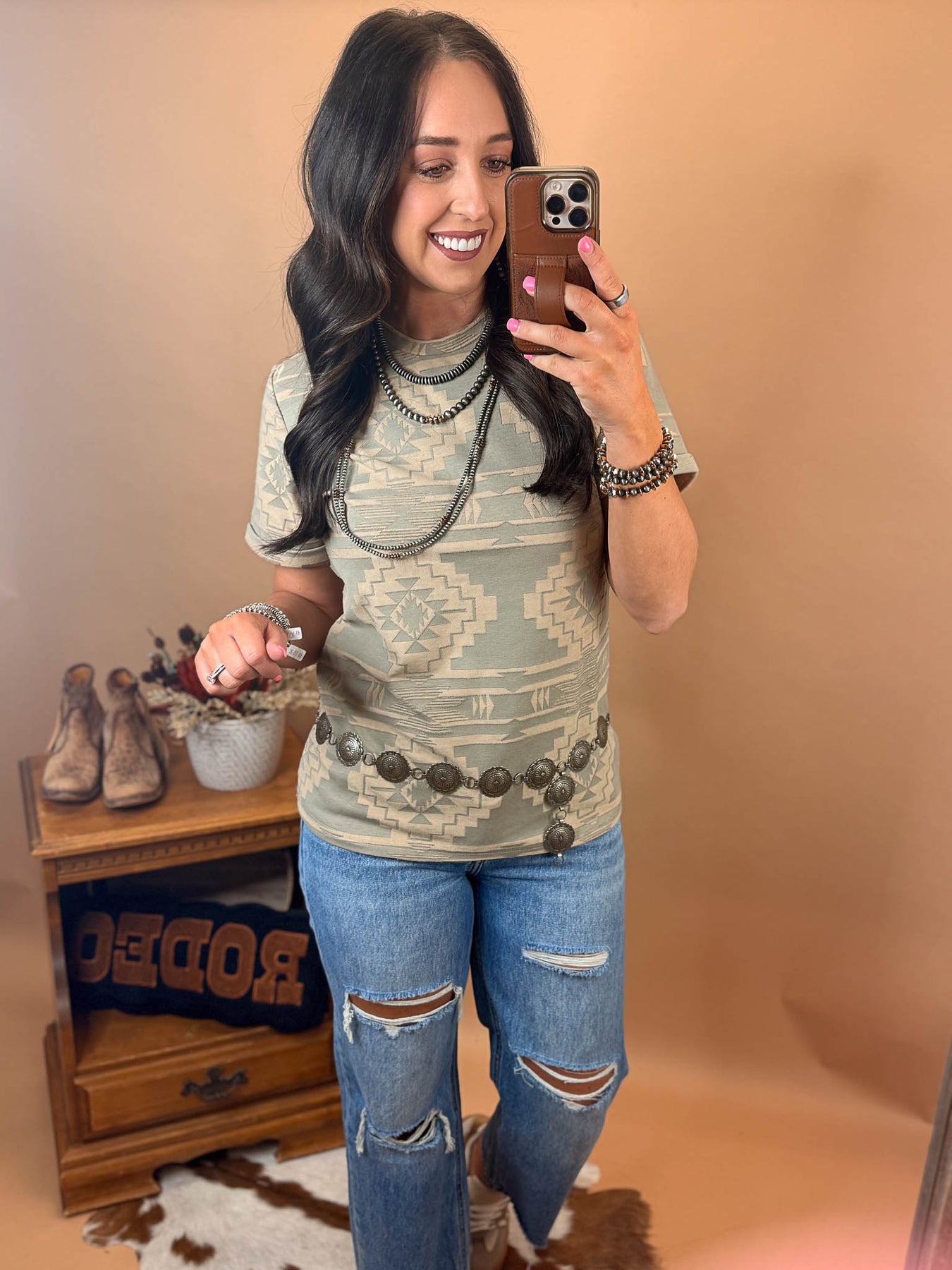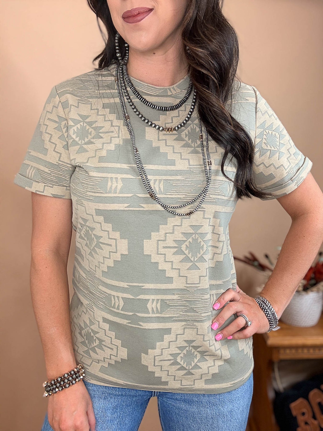 Embrace effortless southwestern style with the Sonora Sands Top. This lightweight piece features a soft light olive desert green base with a cream aztec print that captures the spirit of sun-baked landscapes. This shirt is not just a graphic it’s like a mesh burnout that makes the pattern what it is!