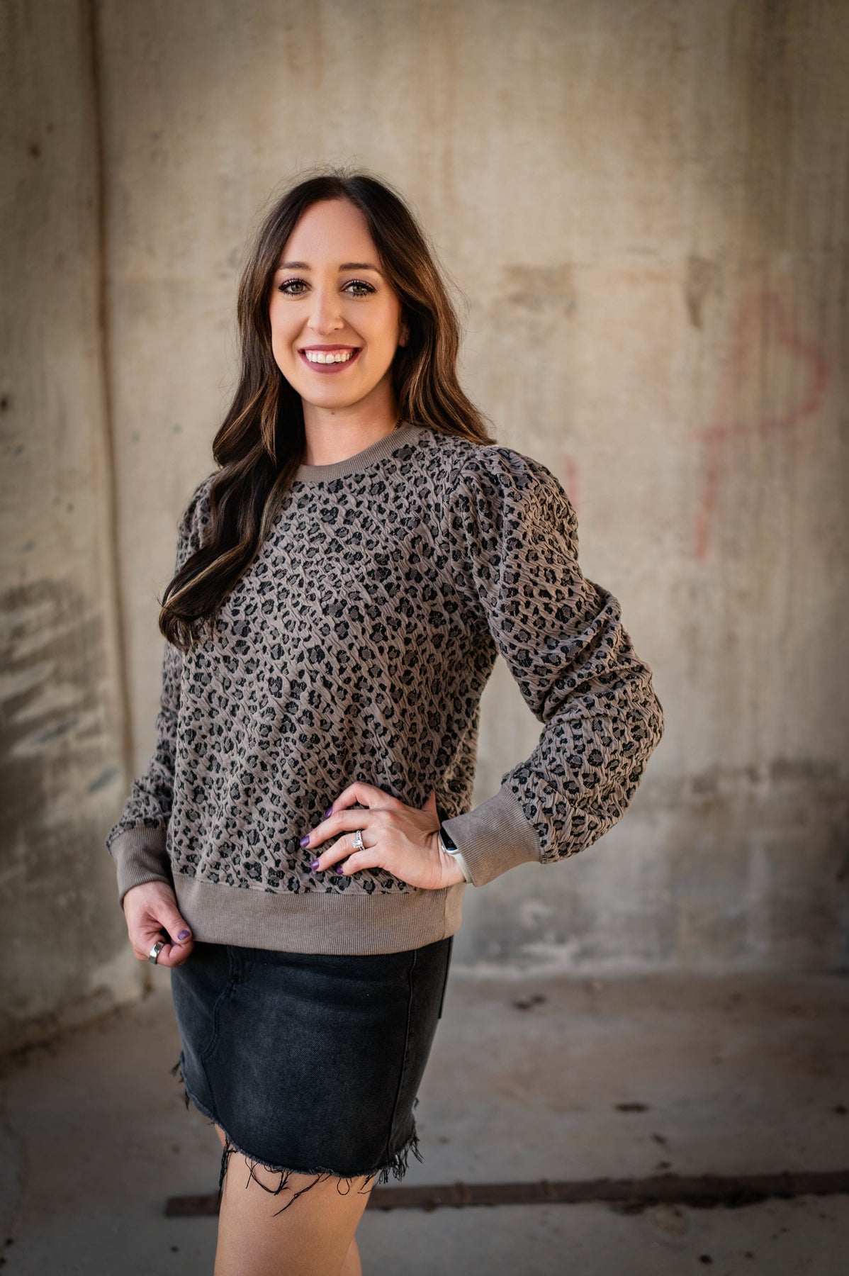 Make a statement with this leopard pullover sweatshirt that effortlessly transitions from casual to chic. Featuring eye-catching black spots on a rich mocha brown base, it's designed with dramatic puffed long sleeves and finished ribbing at the cuffs and hem for a polished look. Crafted from premium material that's soft and durable, this versatile top pairs beautifully with everything from jeans to dressier pieces, giving you endless styling possibilities.