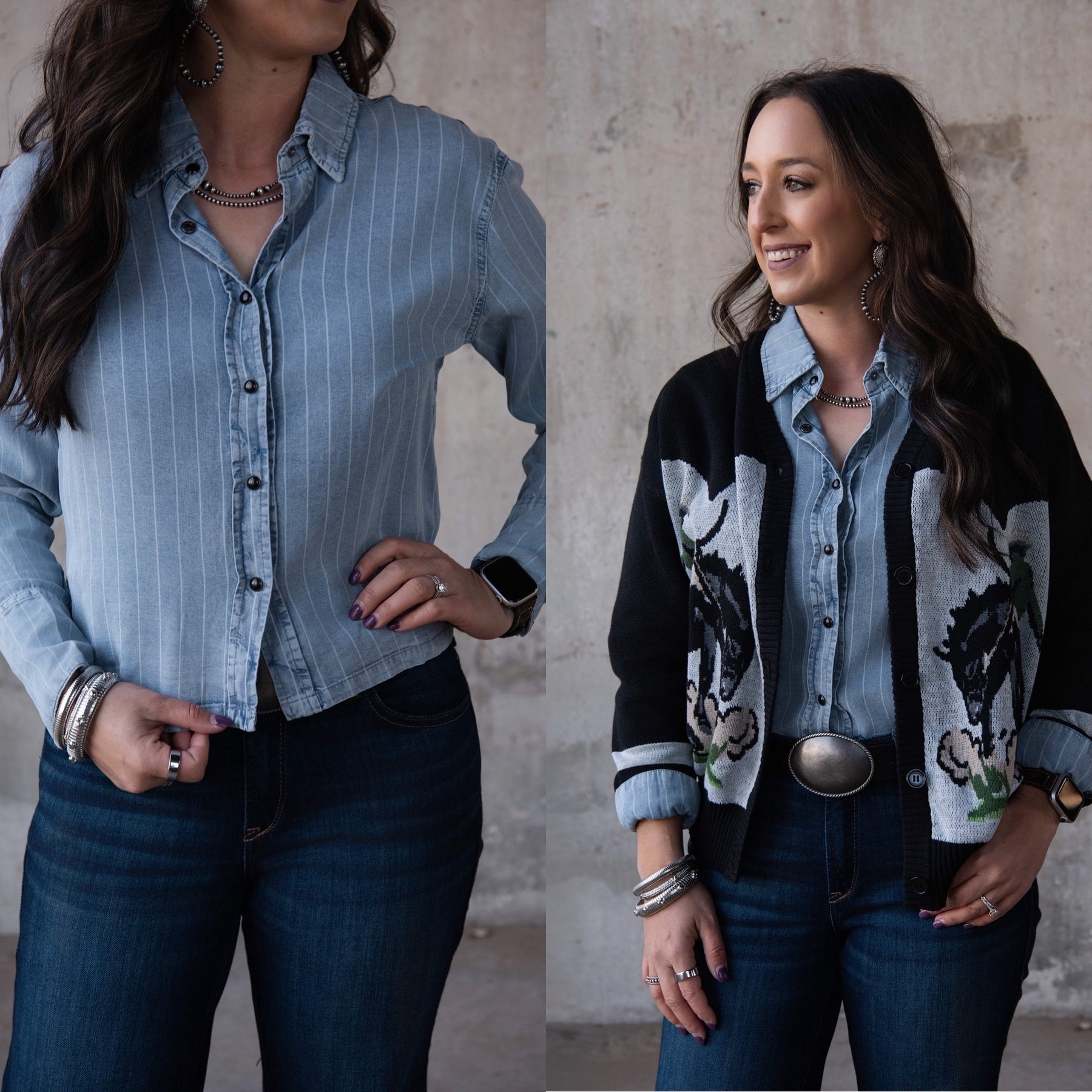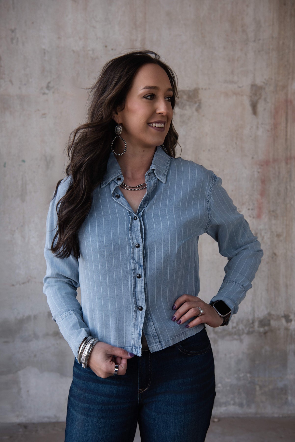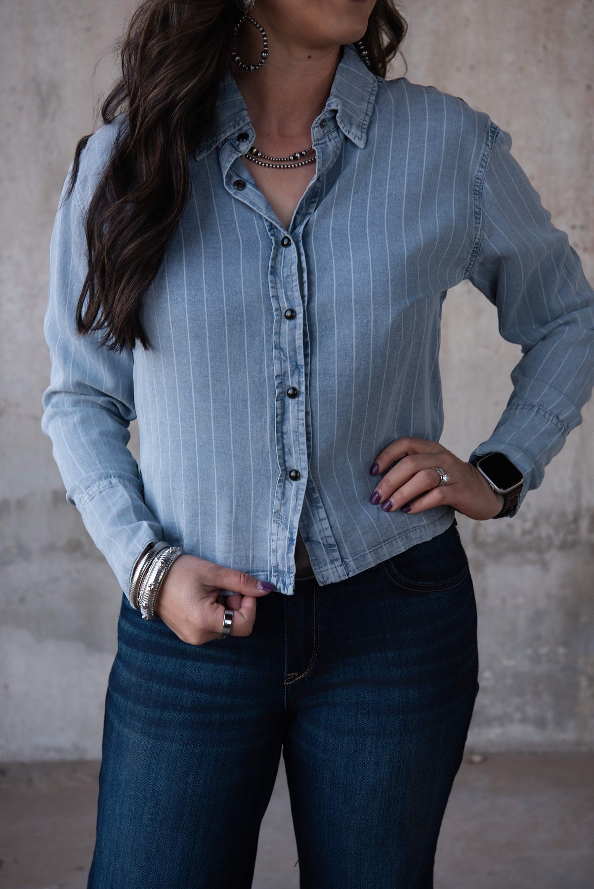 Crisp chambray meets classic denim in this modest crop-style button-up that's ready to layer. Pearl snap buttons add a touch of Western charm, while the modest cropped cut keeps things modern and fun. Throw it over a cardigan for effortless style that works season after season. Not super crop, it hits right at the natural waist.