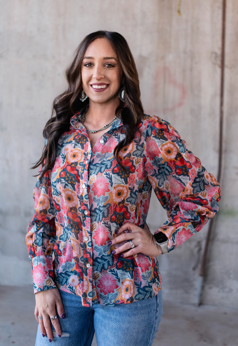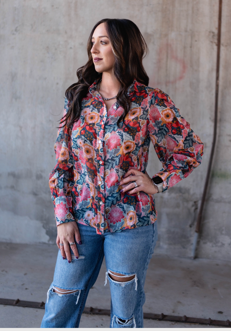 Meet your new favorite top! This sheer button-up blouse rocks a vintage boho floral print in the most gorgeous vibrant colors. With its collared neckline and balloon sleeves, it's equally stunning worn solo or tucked under a cozy sweater. Feather-light and endlessly fun.