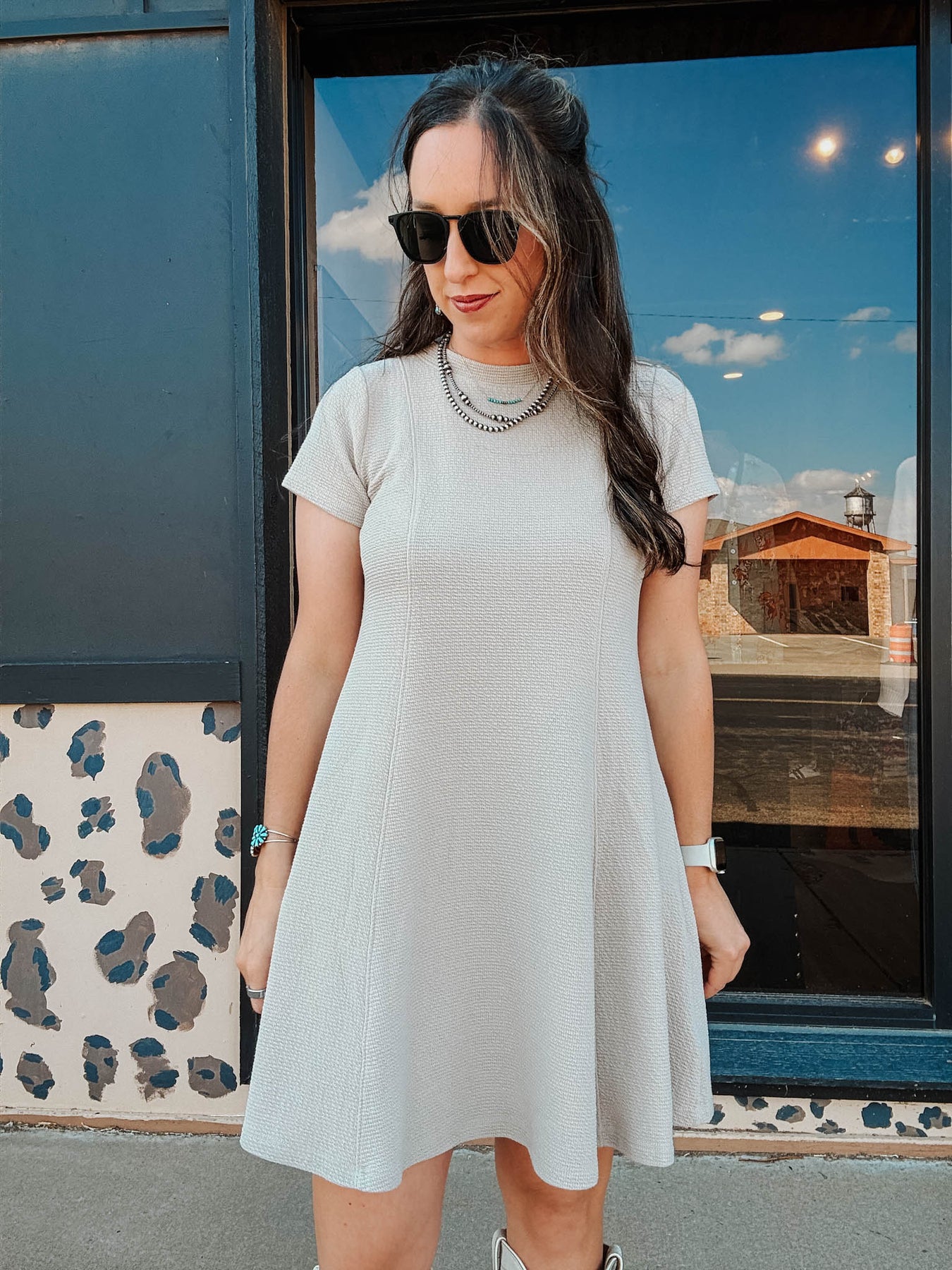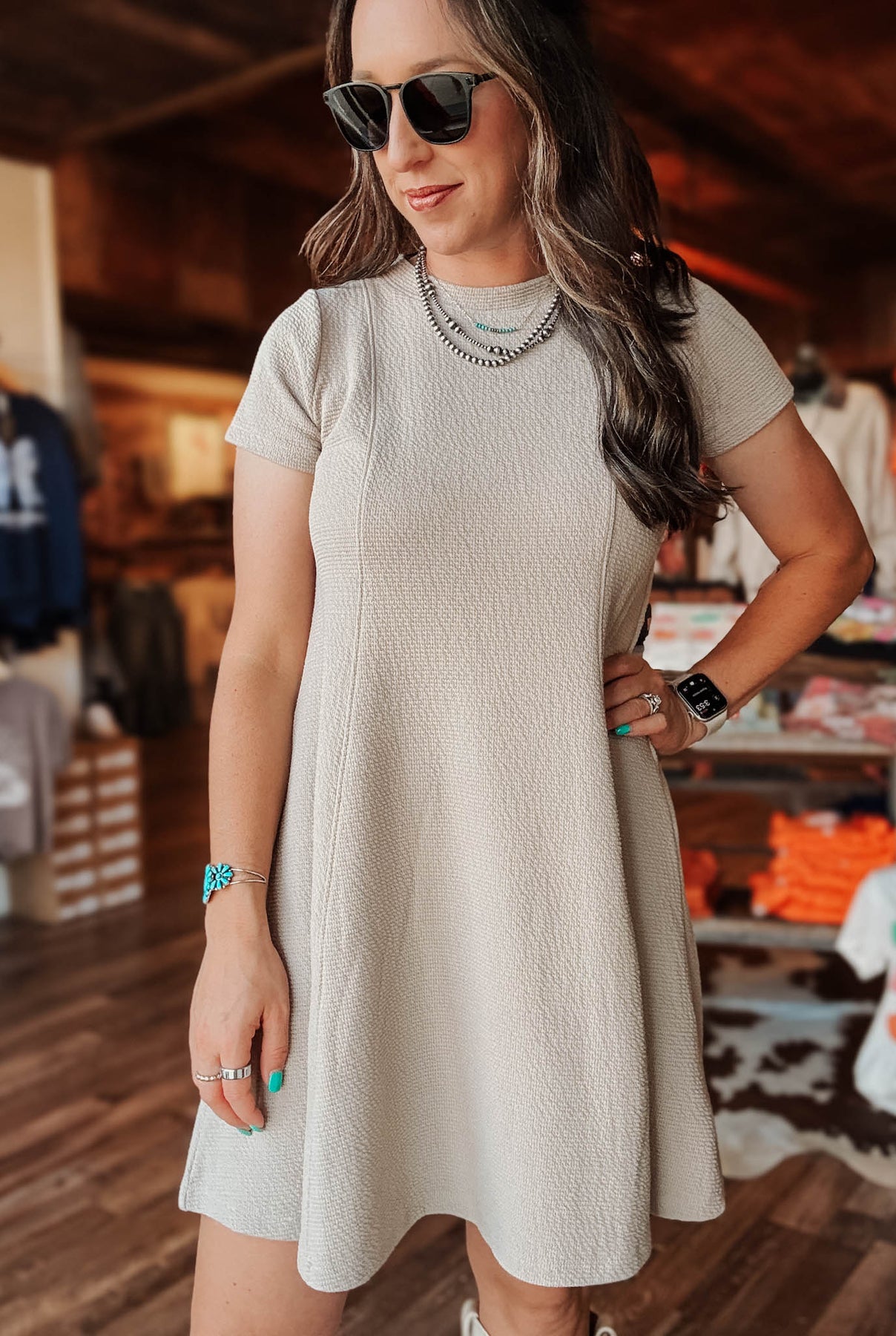 The Desert Drifter Dress in taupe offers a ribbed texture with elegant pleats down the front, creating a flattering, feminine silhouette. Falling just above the knee, its flowy design moves effortlessly with you. Perfect for casual days or dressed up for evening outings, this versatile dress combines comfort and style with ease.