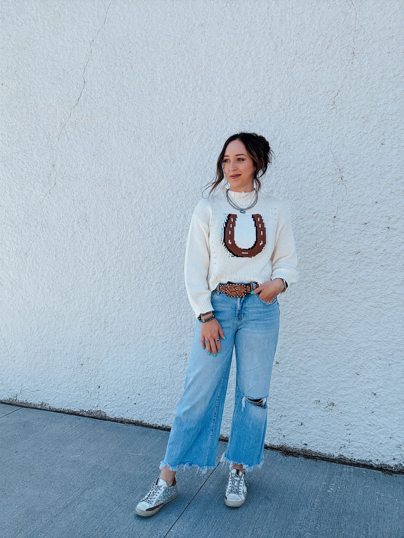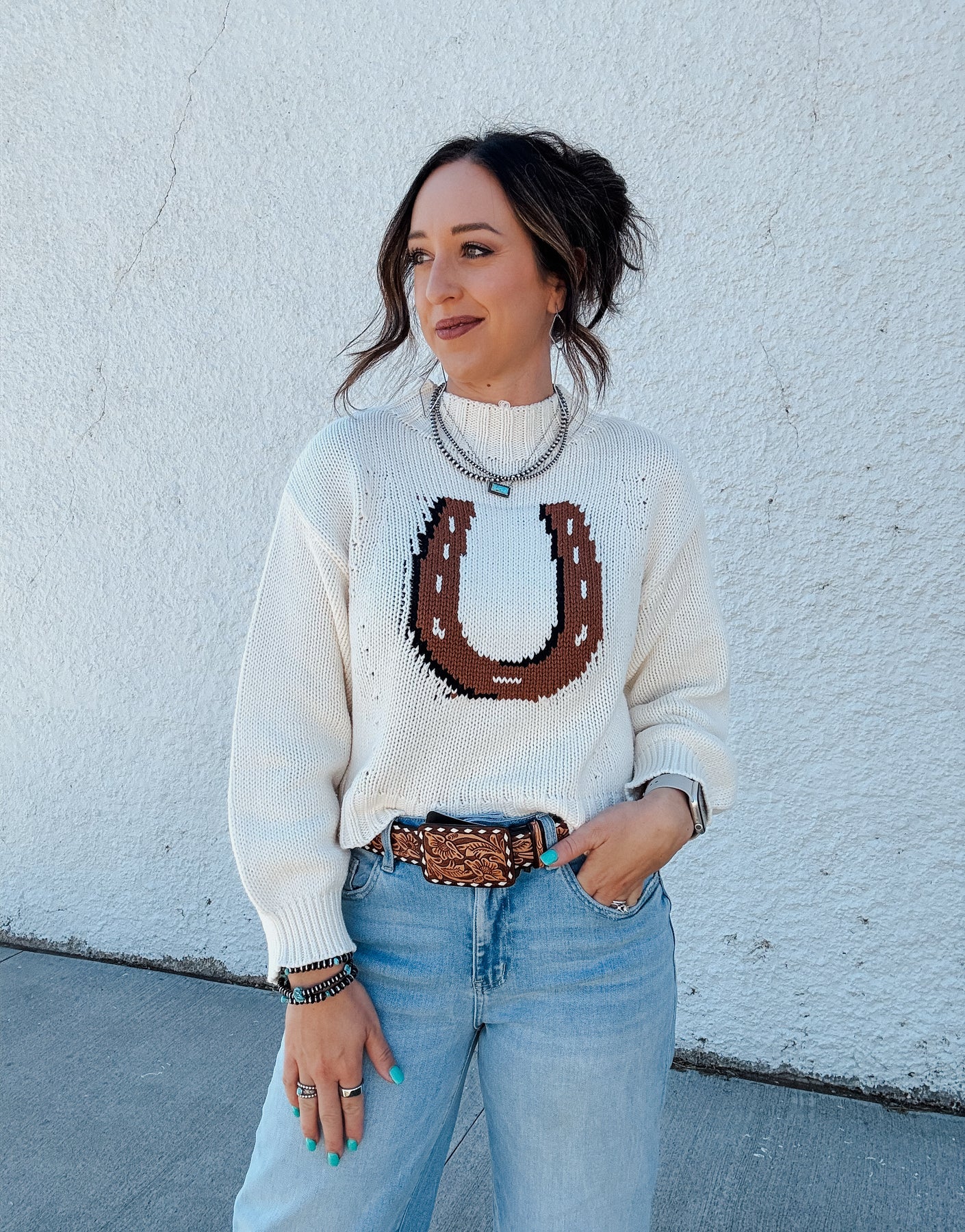 Embrace cozy western style with the Test Your Luck Sweater. Its ivory knit fabric and bold horseshoe design make a striking statement, while the high neck crewline and dropped shoulders ensure unmatched comfort. Finished with ribbed trim, this sweater blends warmth and style effortlessly—perfect for adding a unique touch to your wardrobe.