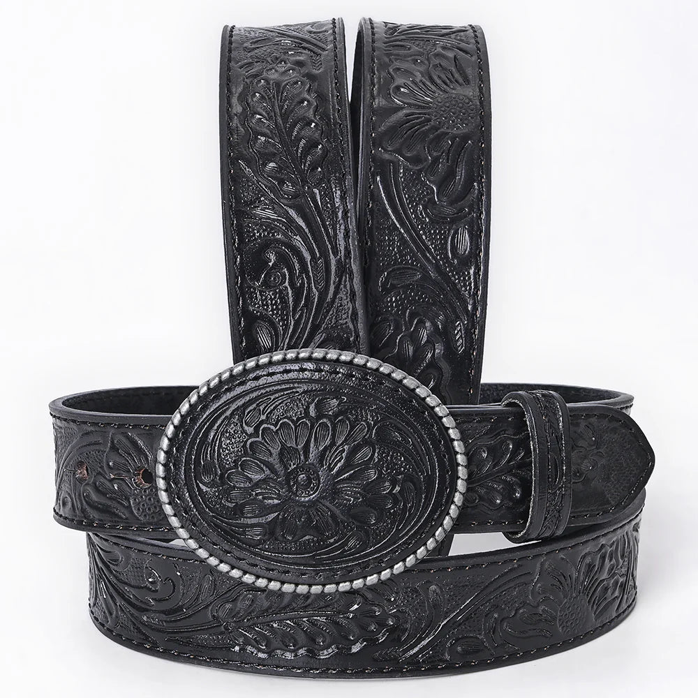 Command attention with timeless Western style in this striking black leather belt, featuring meticulous hand-tooled floral and leaf patterns. Crafted from genuine leather and finished in a deep black tone, this belt pairs effortlessly with any outfit. The oval buckle, subtly engraved to complement the tooling, adds a rugged yet refined flair.
